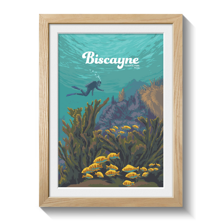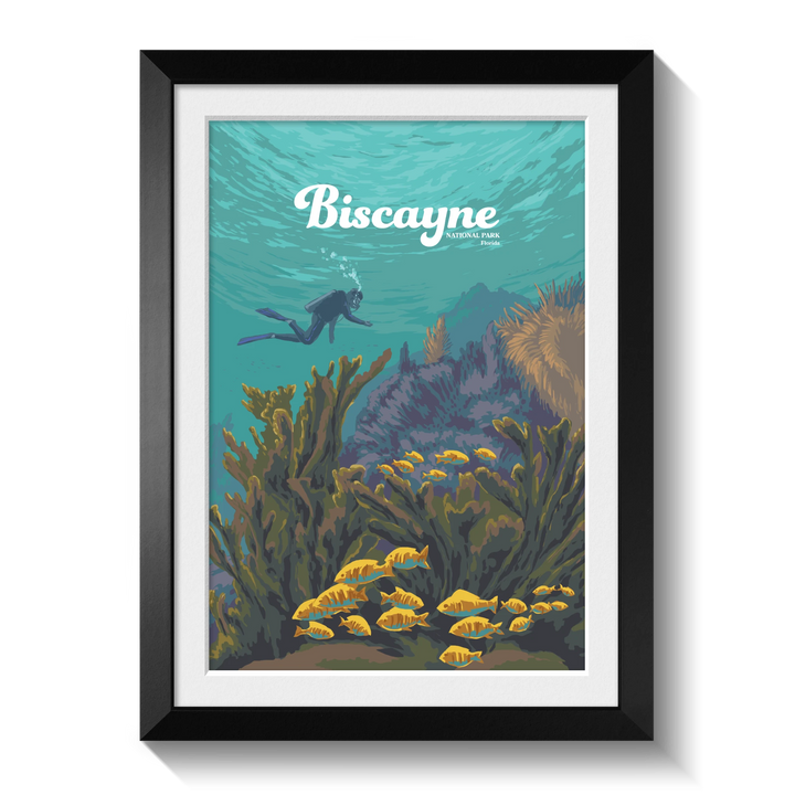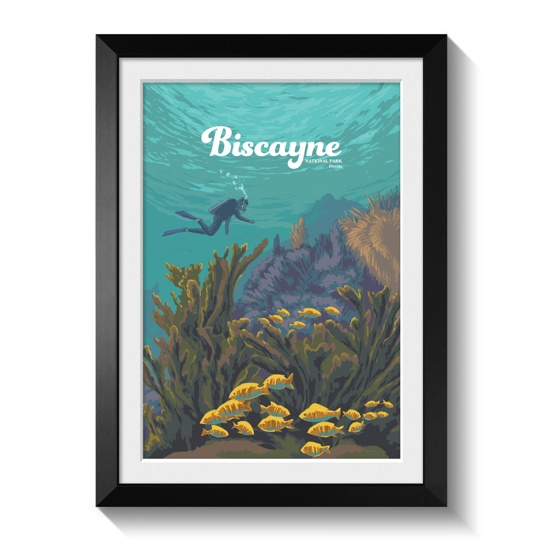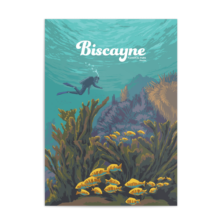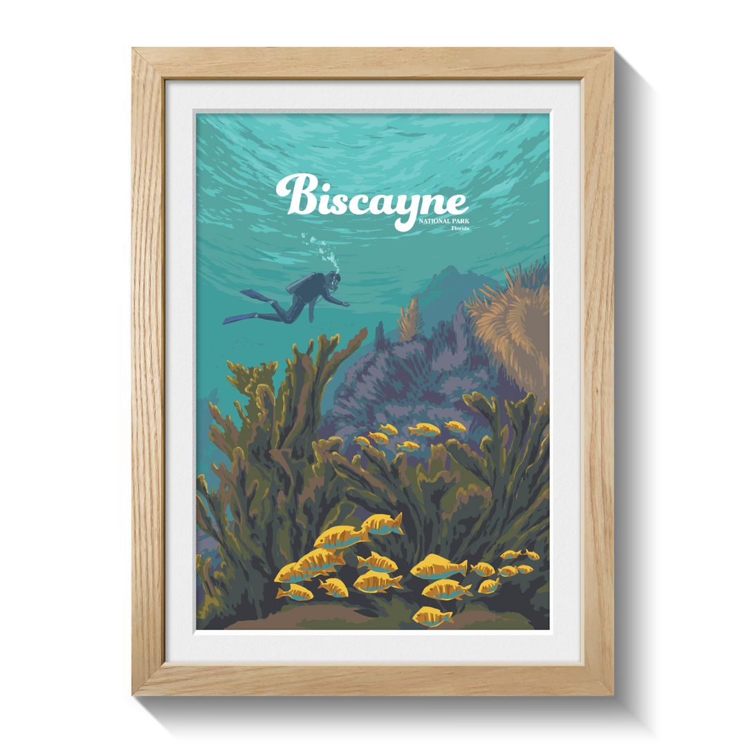 An original travel poster featuring diving and snorkelling hotspot, Biscayne National Park in Southern Florida USA. 95% of the 172,971 acre park is water and it is home to Florida Reef, one of the largest coral reefs in the world