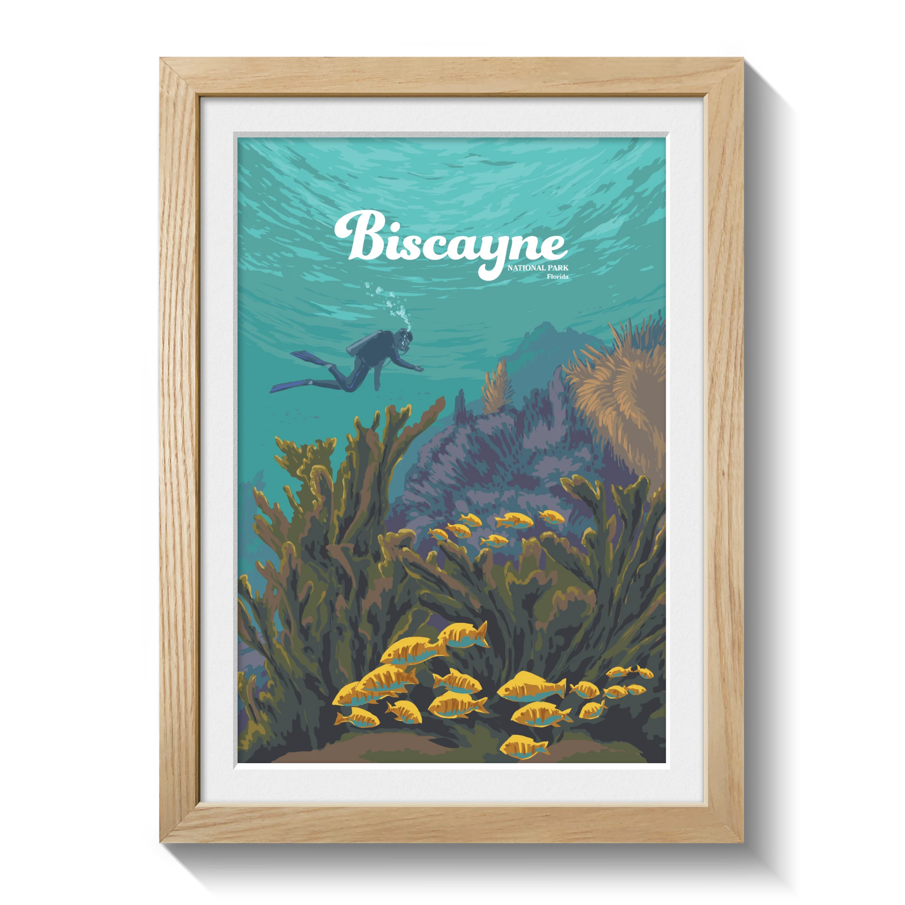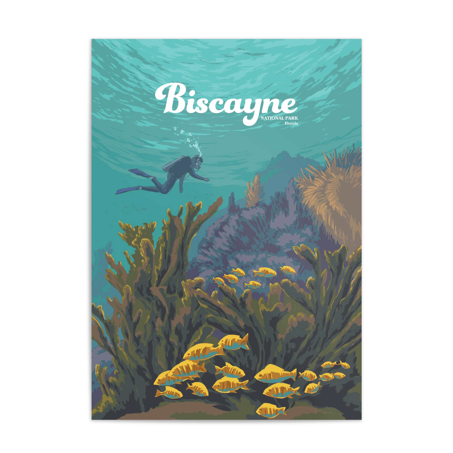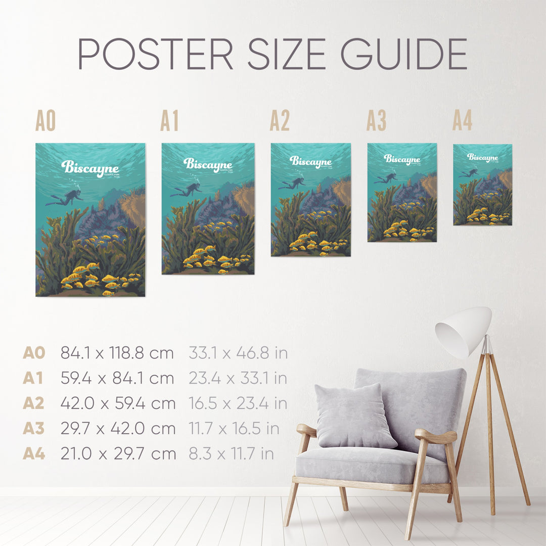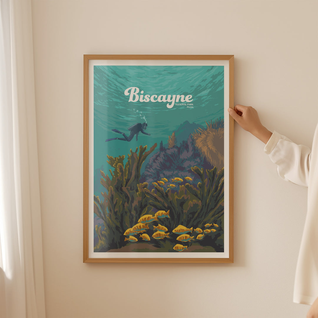 An original travel poster featuring diving and snorkelling hotspot, Biscayne National Park in Southern Florida USA. 95% of the 172,971 acre park is water and it is home to Florida Reef, one of the largest coral reefs in the world