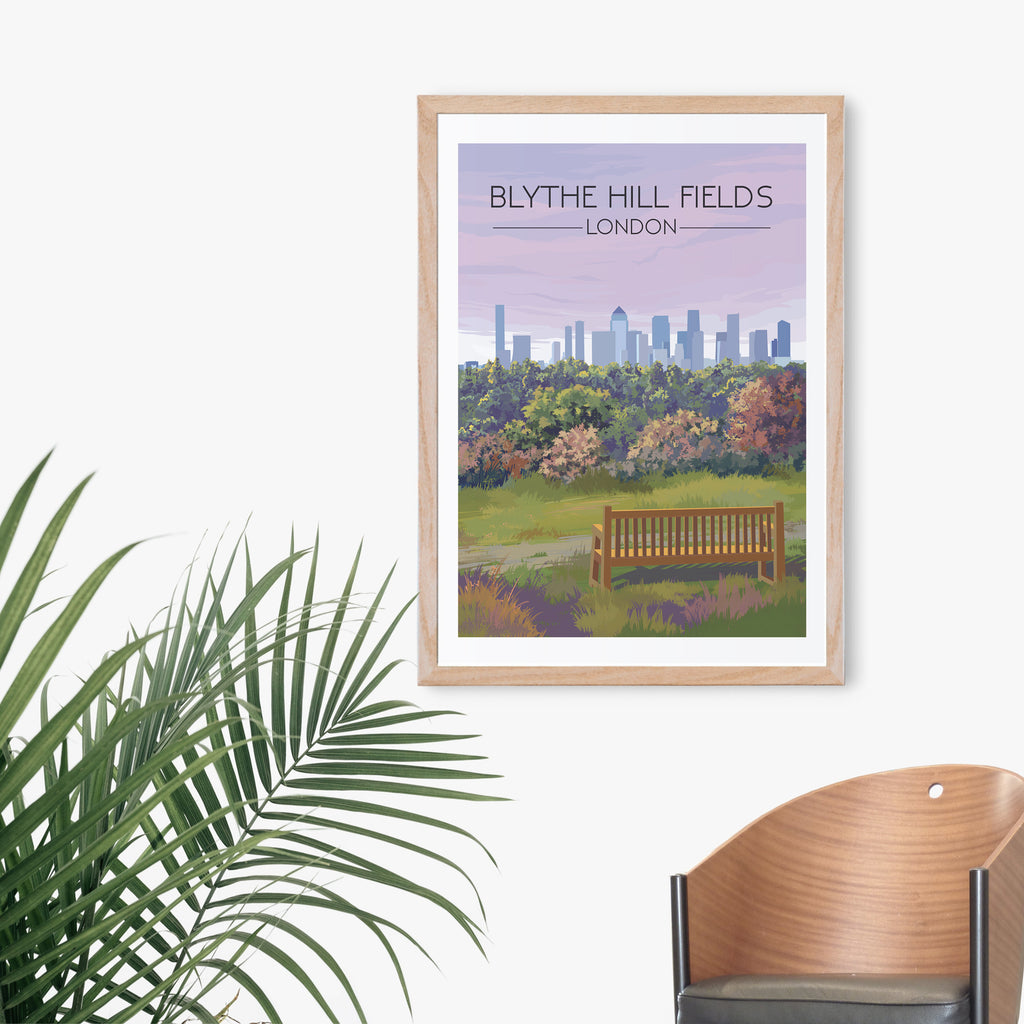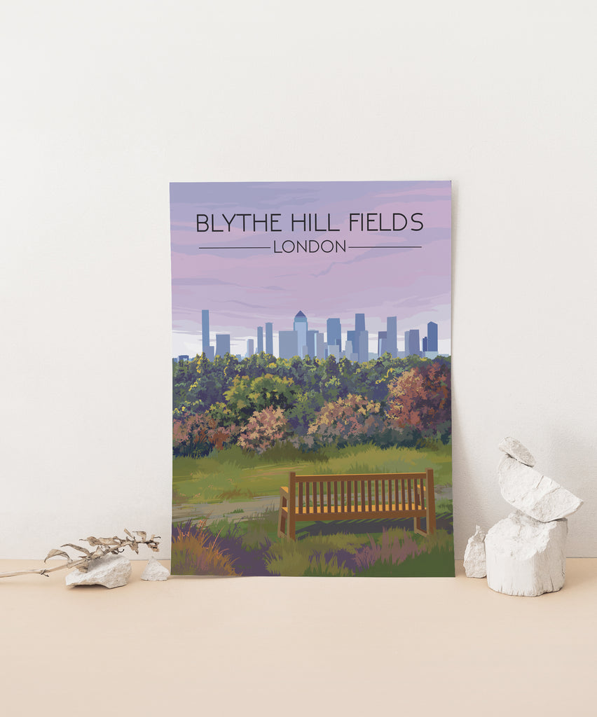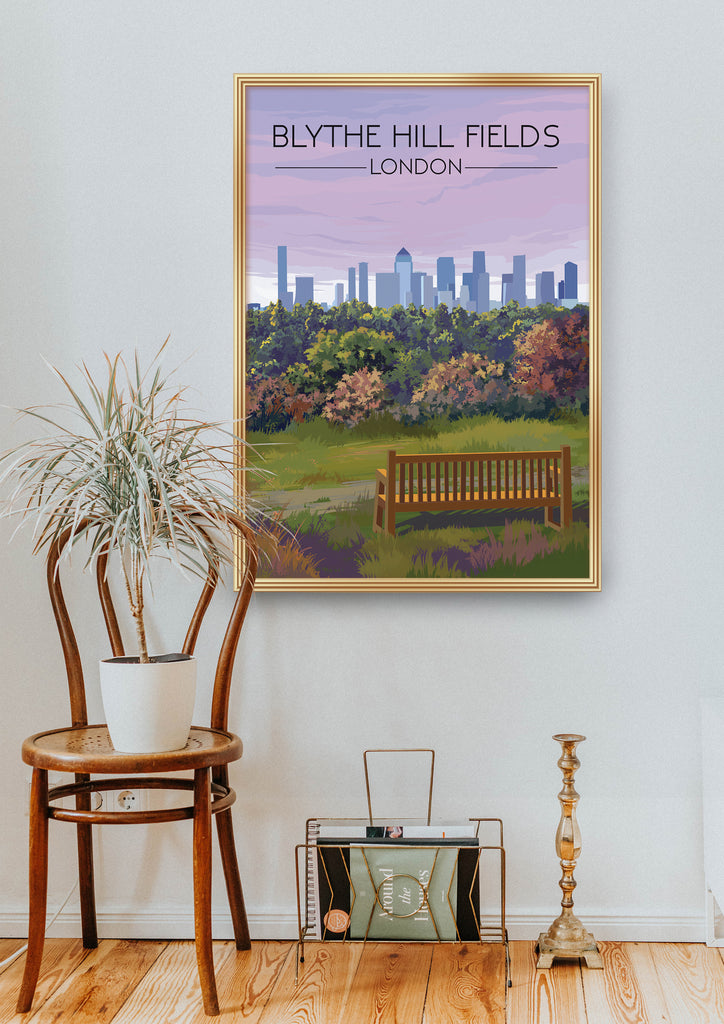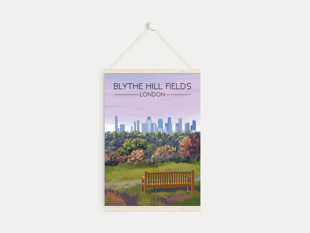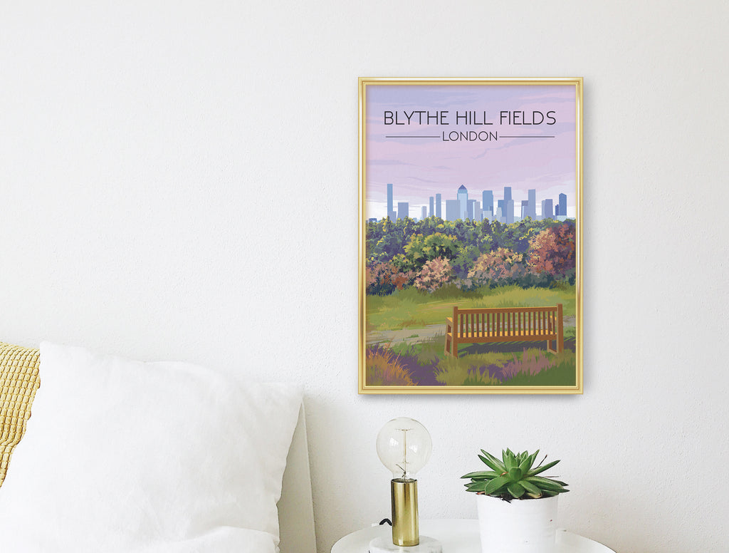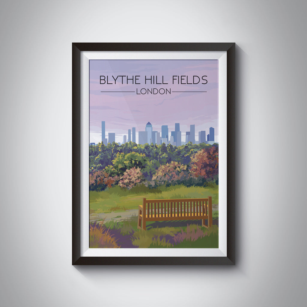 A original travel poster featuring the famous London skyline as seen from Blythe Hill Fields park in the South East London borough of Lewisham.
