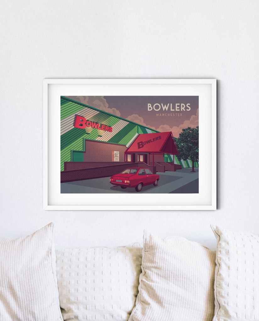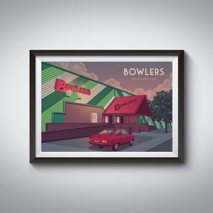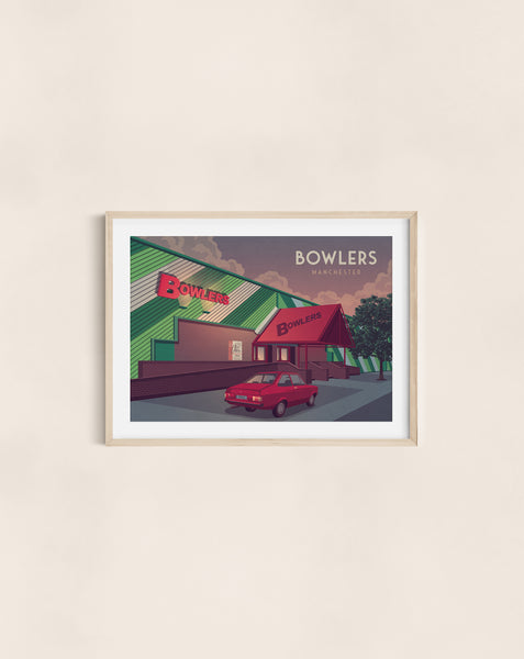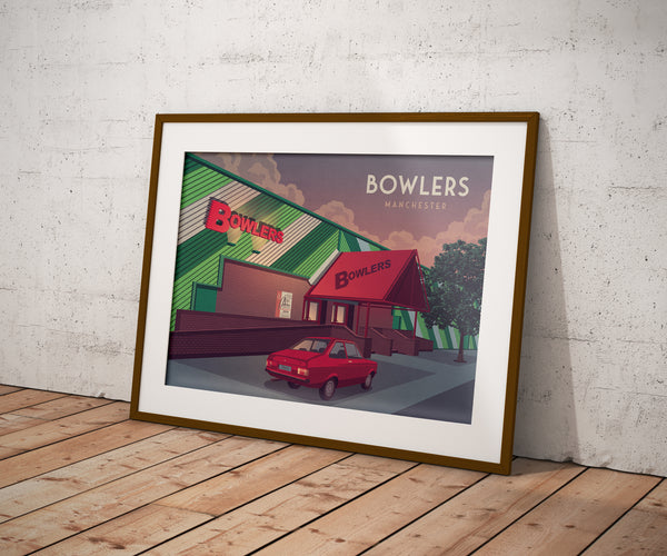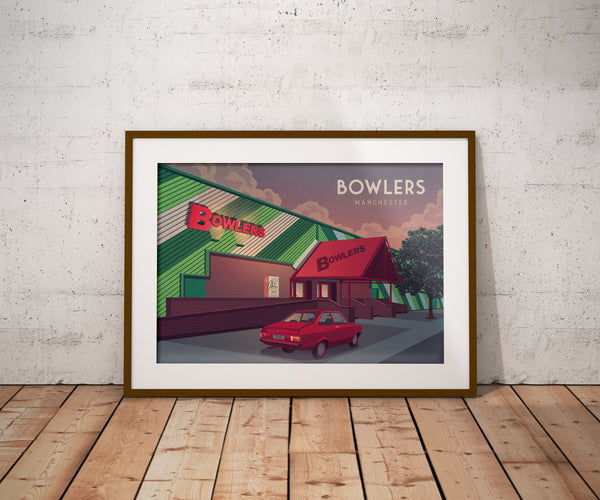 An original music venue poster featuring iconic Manchester leisure centre turned nightclub Bowlers, home to the legendary Life at Bowlers club night.