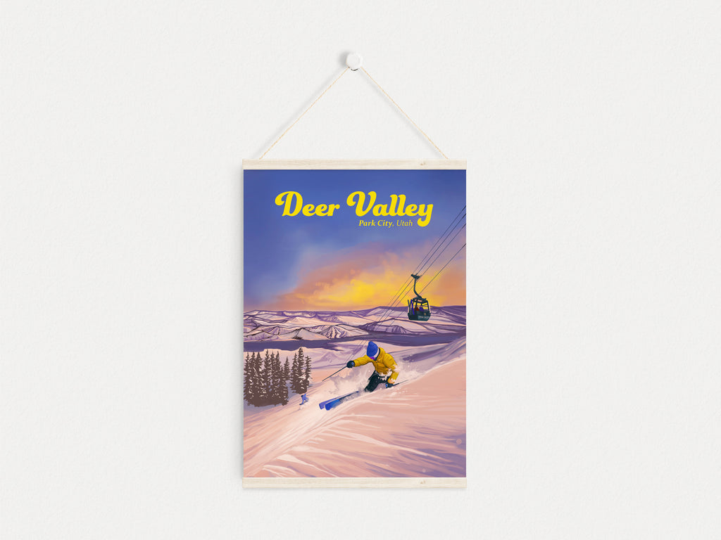 This is an original ski resort poster of the popular resort of Deer Valley in the Park City area of Utah, USA. Deer Valley is one of only three US resorts, along with Alta and Mad River Glen, that maintains a ban on snowboarding.