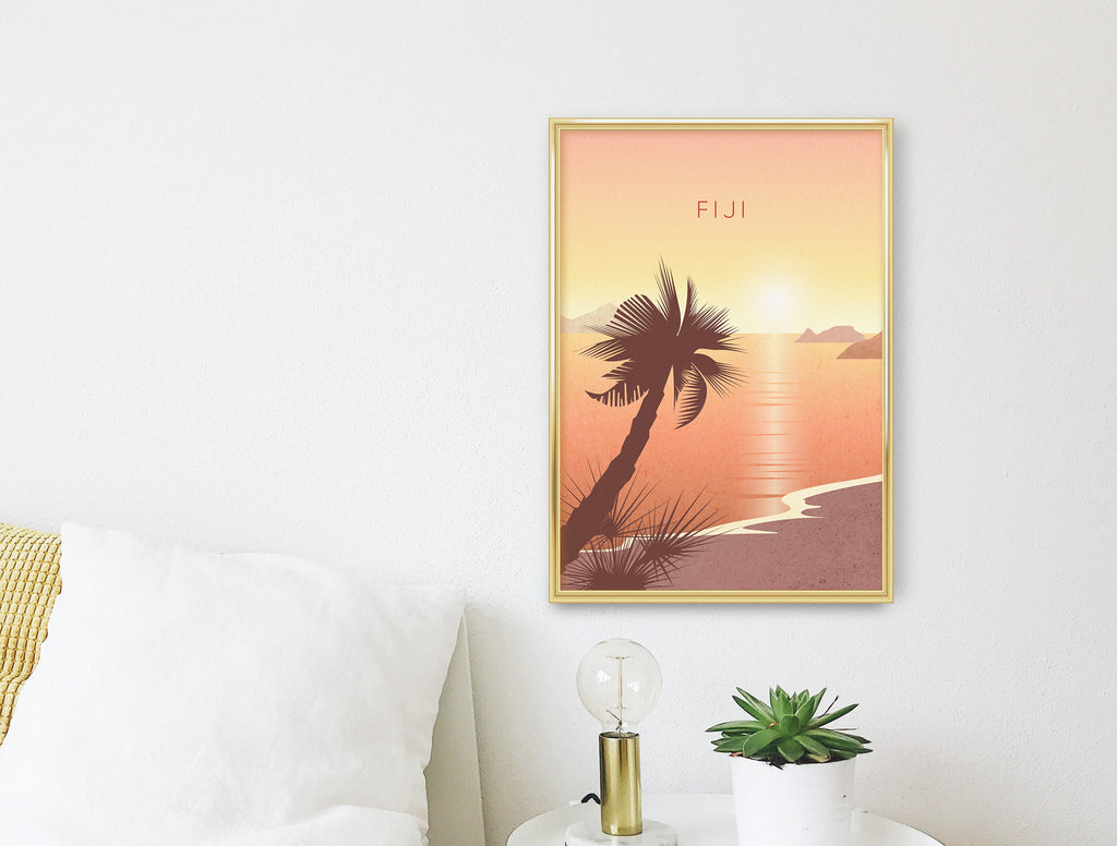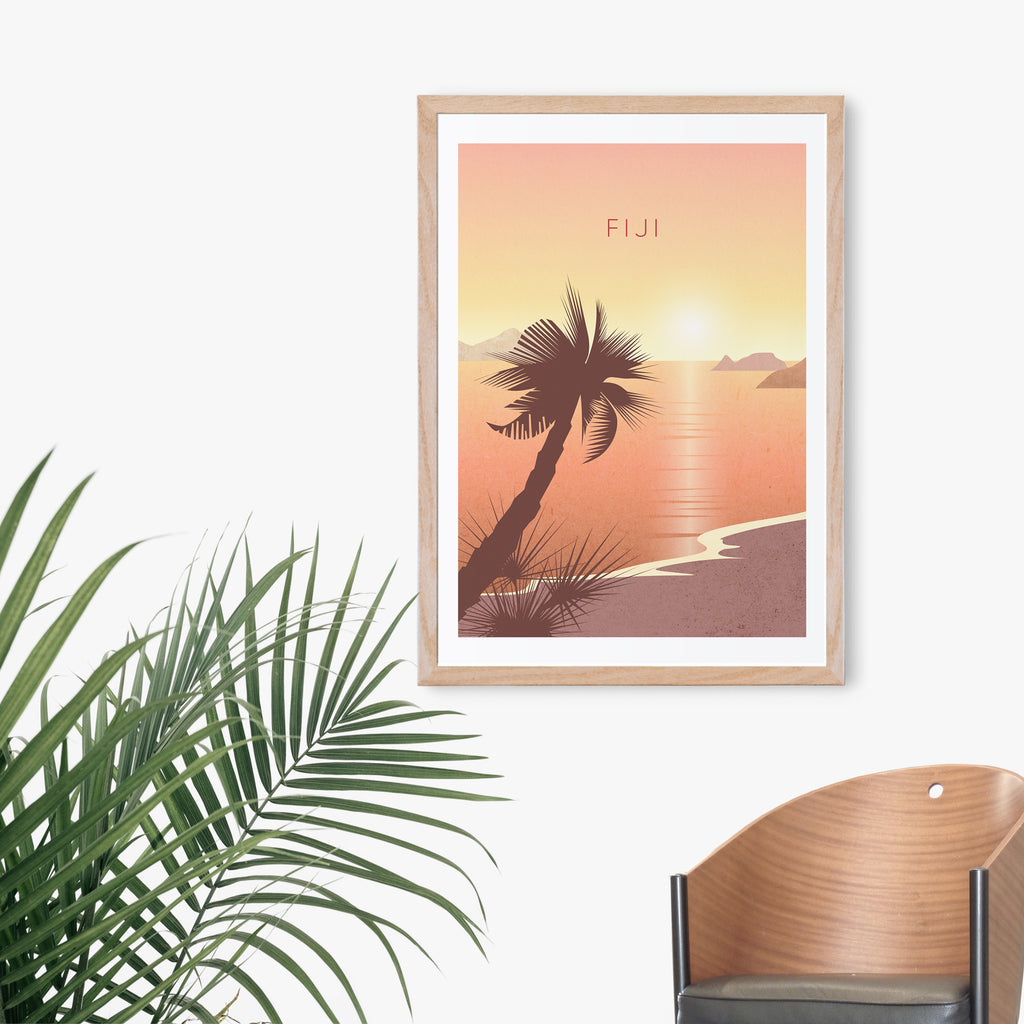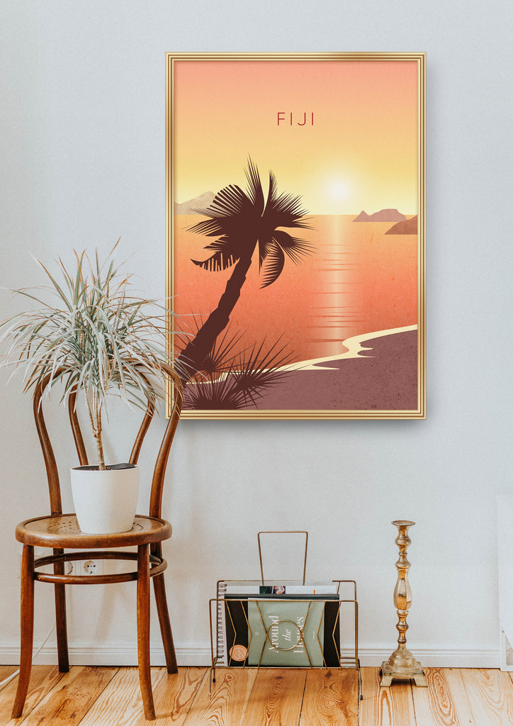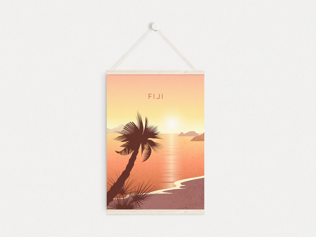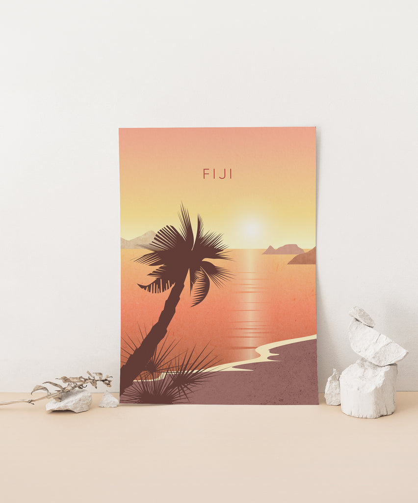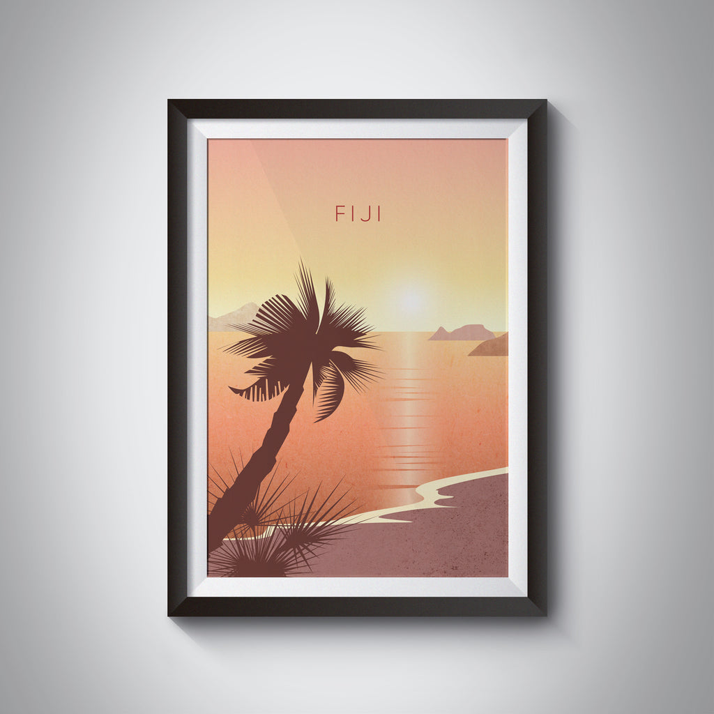 Original travel poster for Fiji, a country in south pacific ocean. Fiji is an archipelago of more than 330 islands, two thirds of which are uninhabited. Fiji is known for is pristine palm lined beaches, coral reefs and crystal clear water.