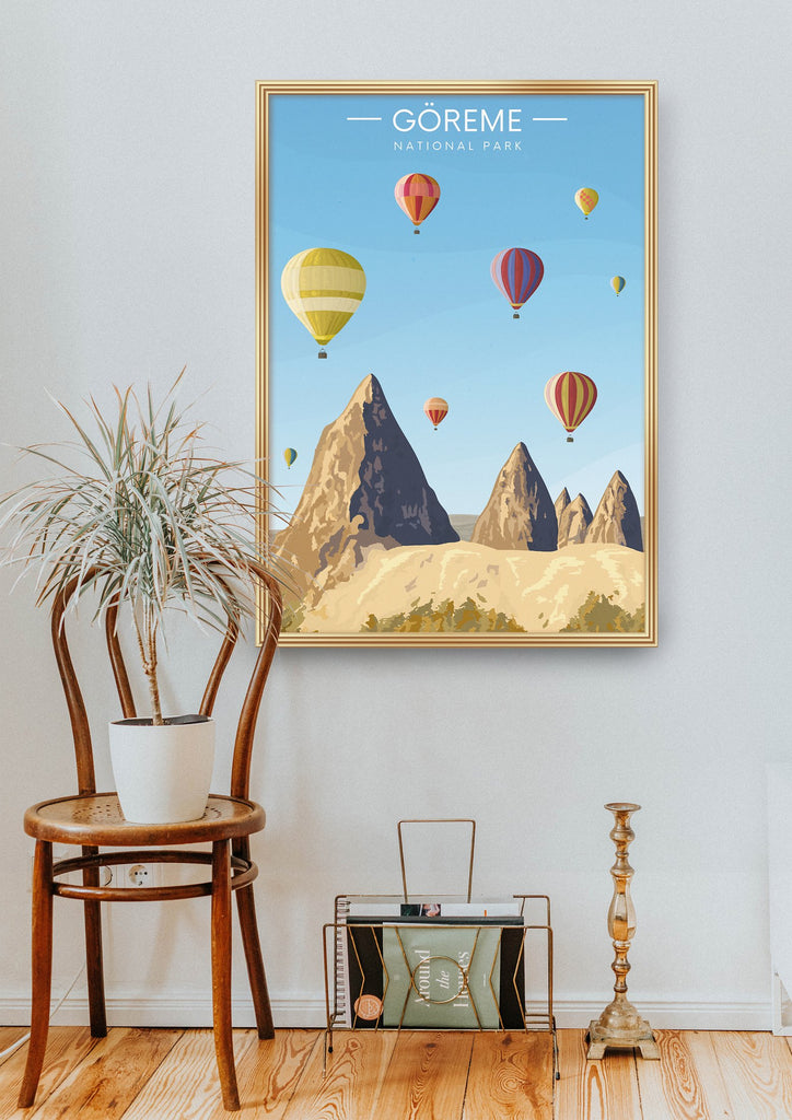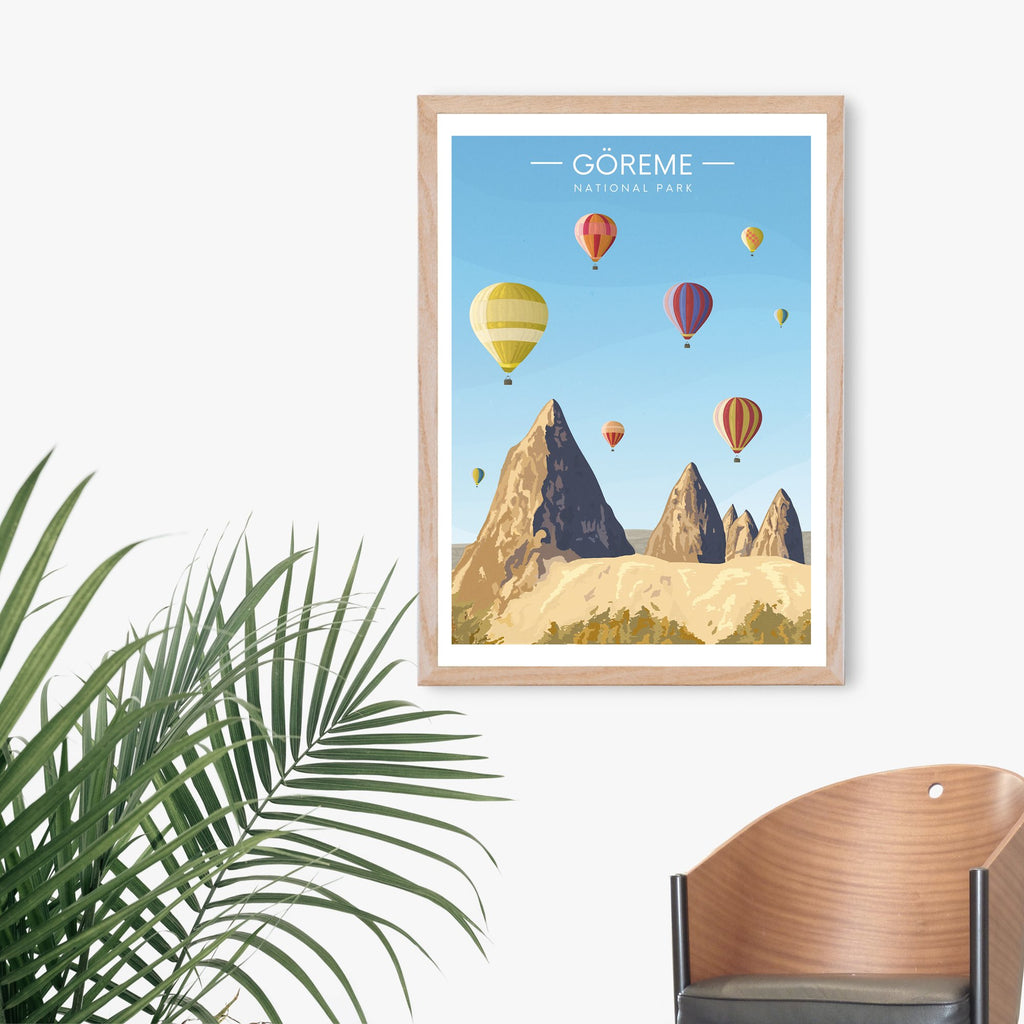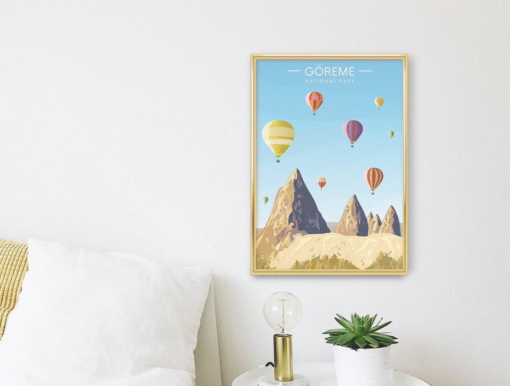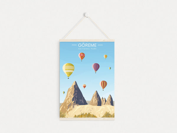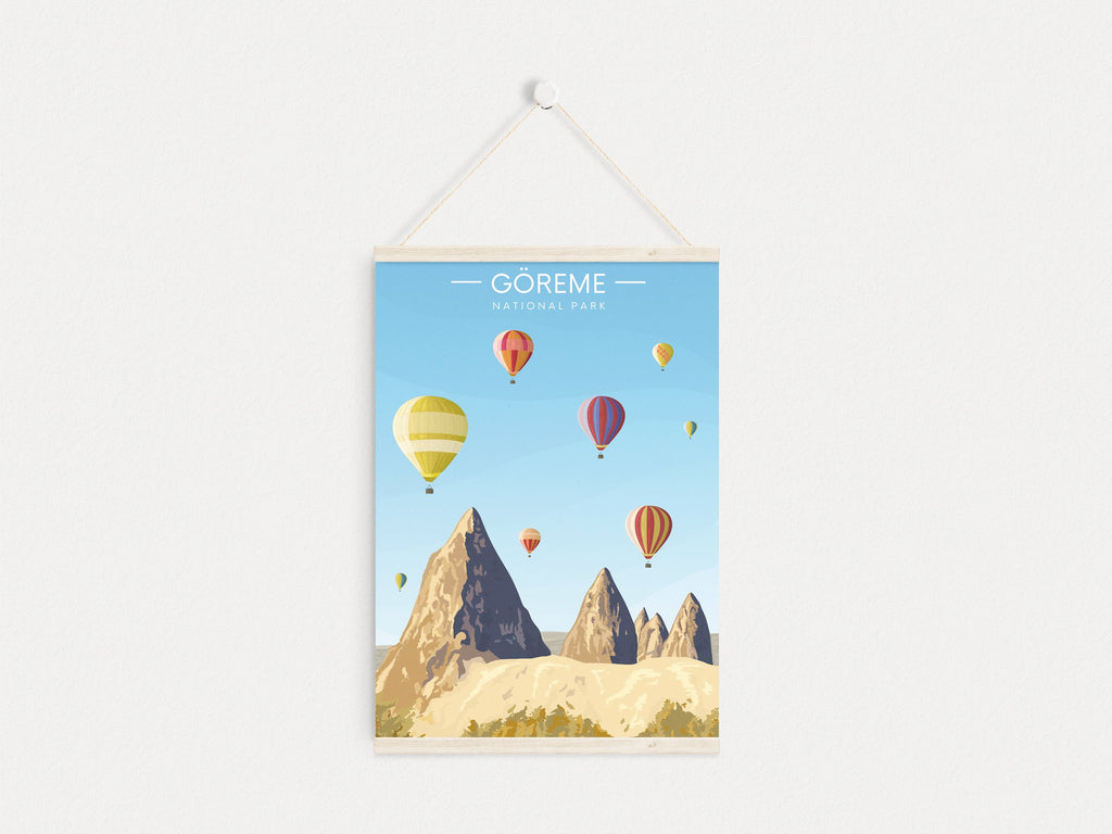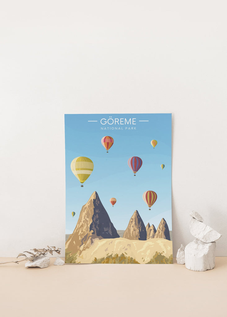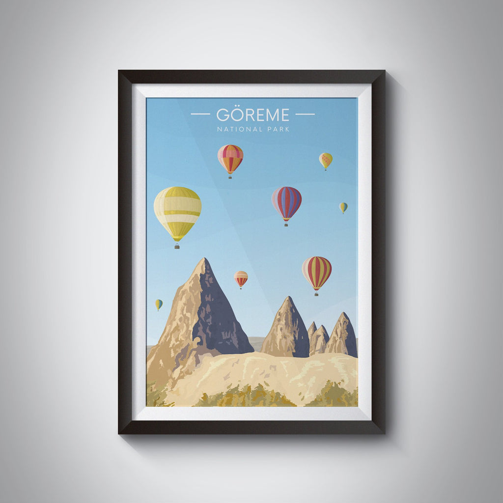 Original travel poster featuring Goreme National Park in the Cappadocia region of Central Turkey. Goreme National Park is home to a vast plain of striking cone like rock formations known as the 'fairy chimneys'.