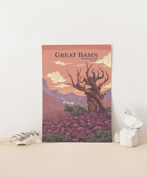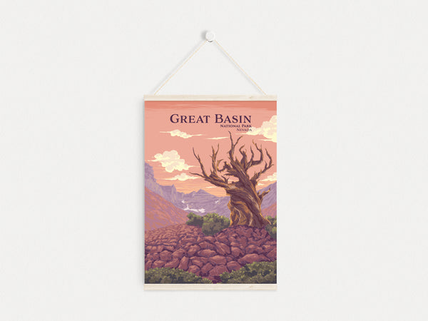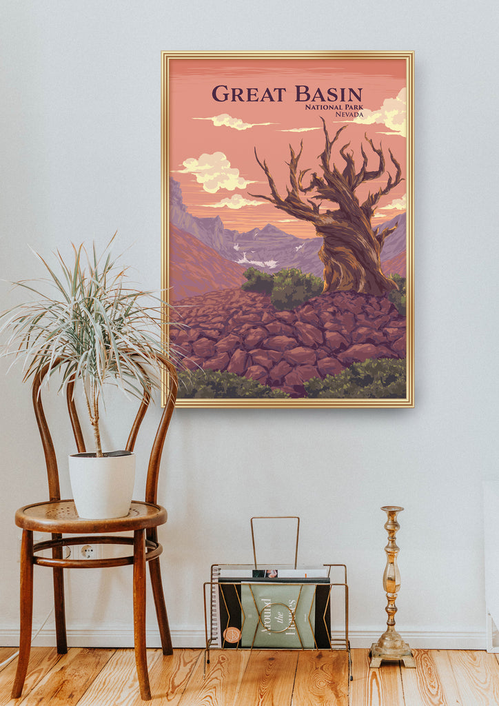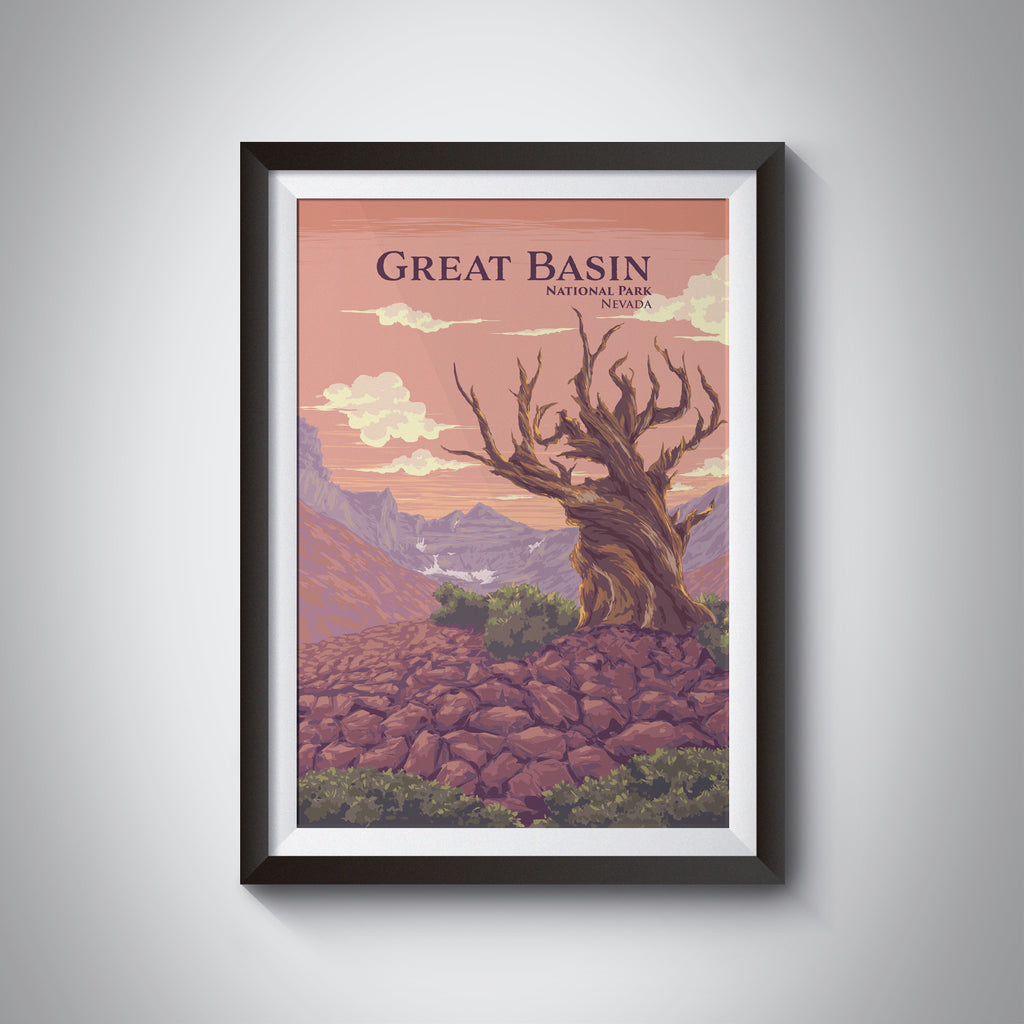 An original travel poster featuring Great Basin National Park in Nevada, close to the Utah border. Situated in the Great Basin a dry and mountainous region between the Sierra Nevada and the Wasatch Mountains.
