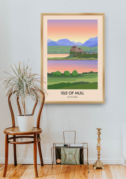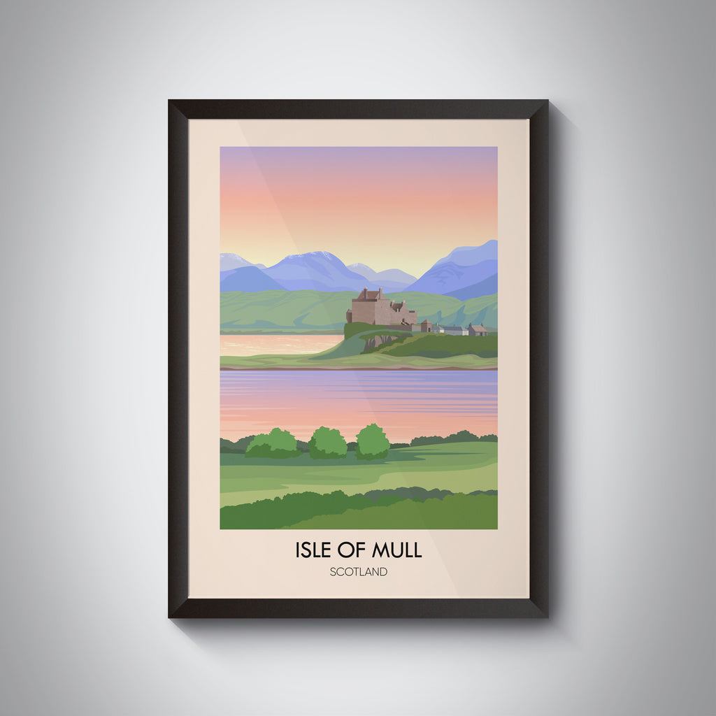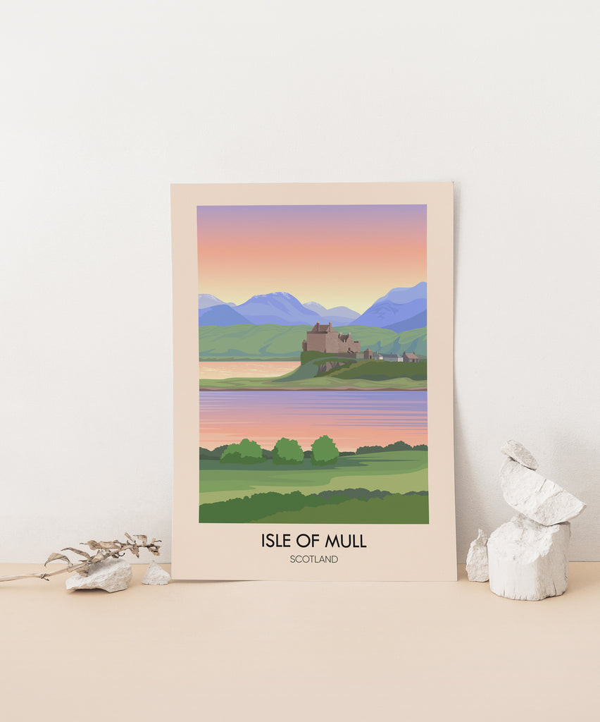 An original travel poster featuring Scotland's Isle Of Mull. The Isle Of Mull is the second largest island in the inner Hebrides after the Isle of Skye. In the poster you can see the impressive Duart Castle owned by the Maclean clan.