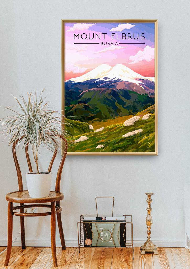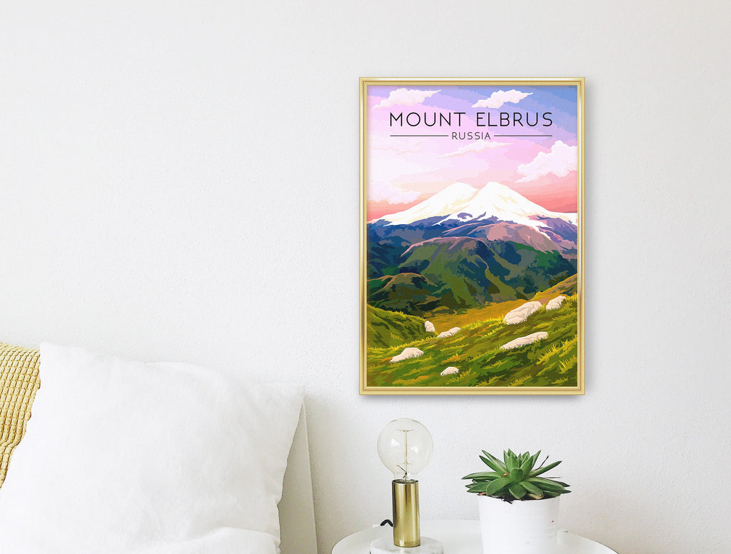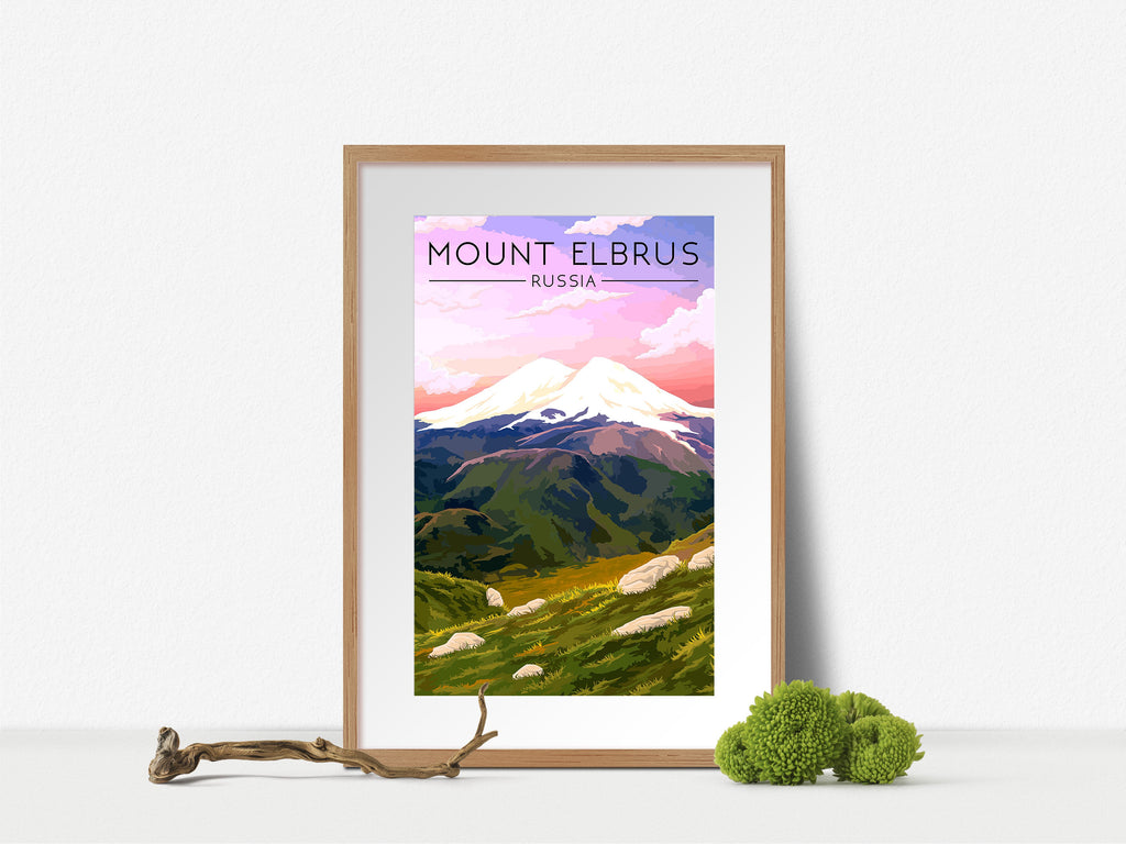 This is an original travel poster featuring Mount Elbrus, the highest mountain in Russia and the the highest in Europe, making it one of the coveted Seven Summits.