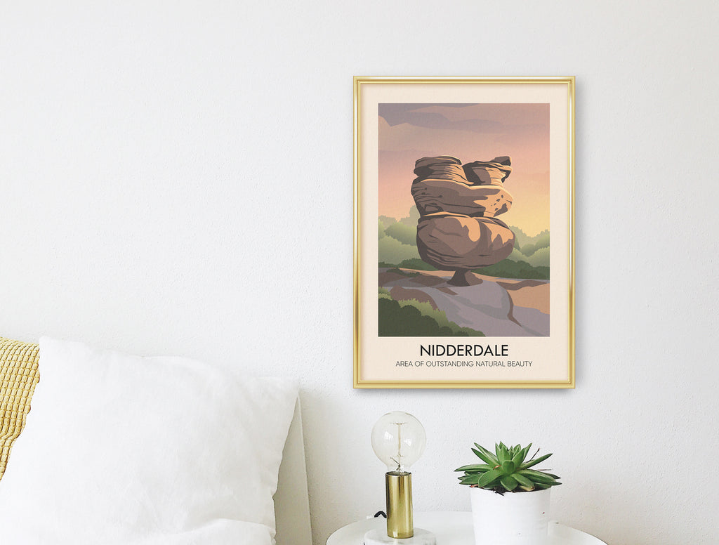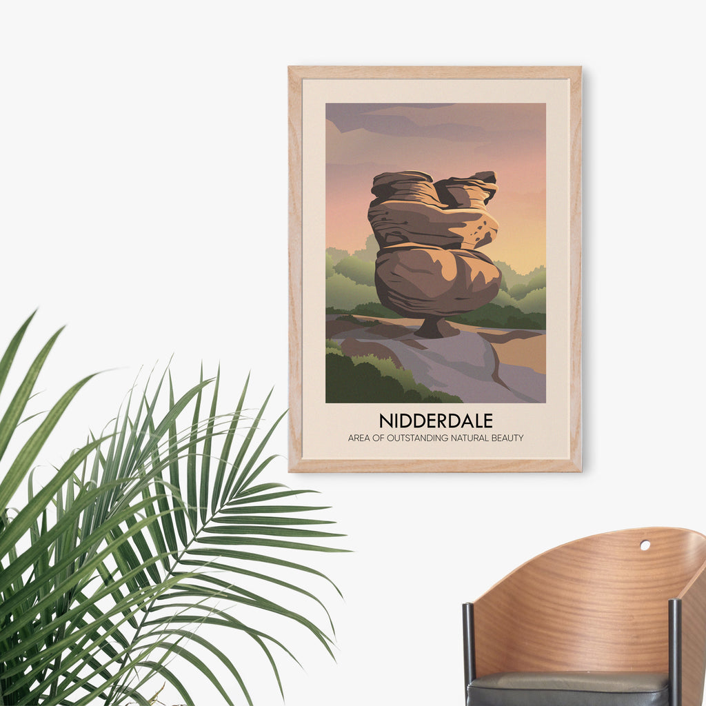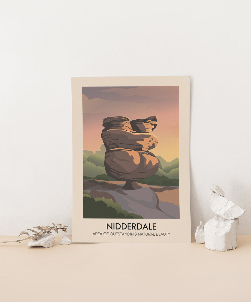 Original travel poster featuring Nidderdale AONB and specifically, the amazing Idol Stone in Brimham Rocks.