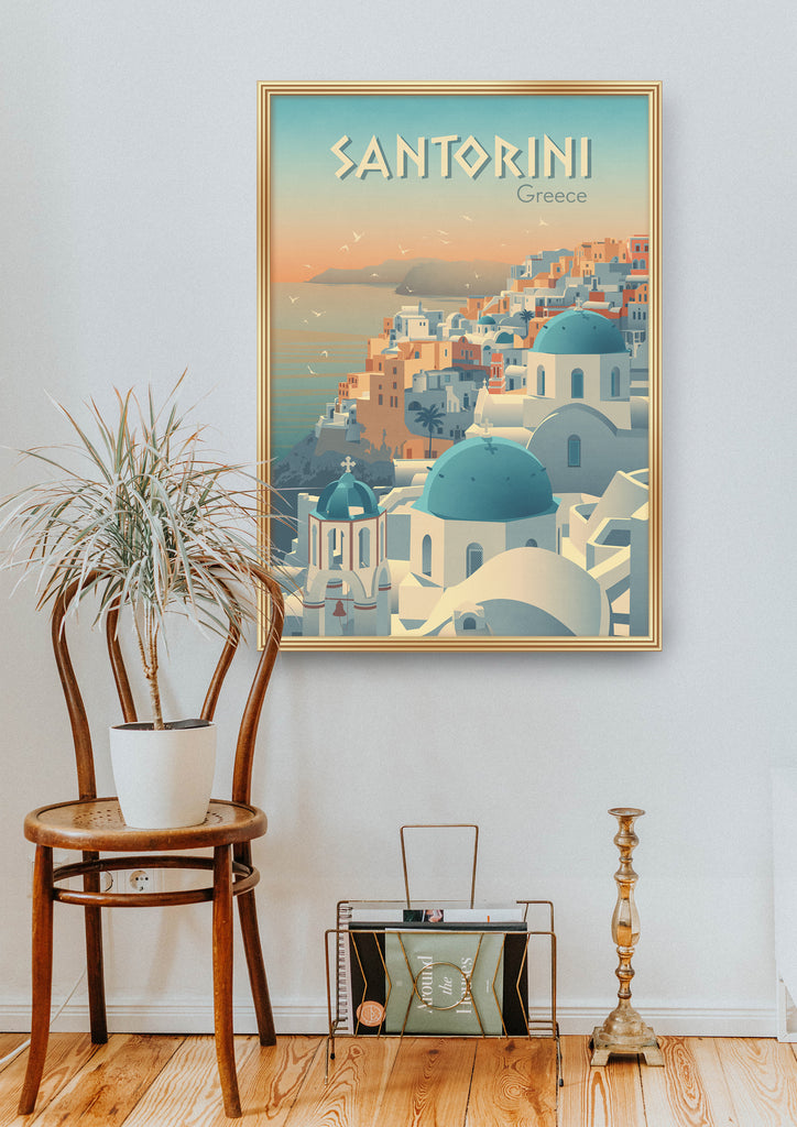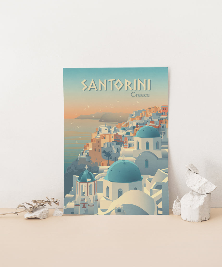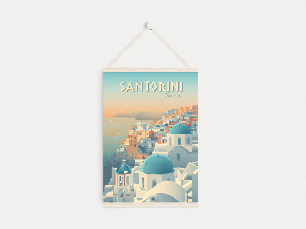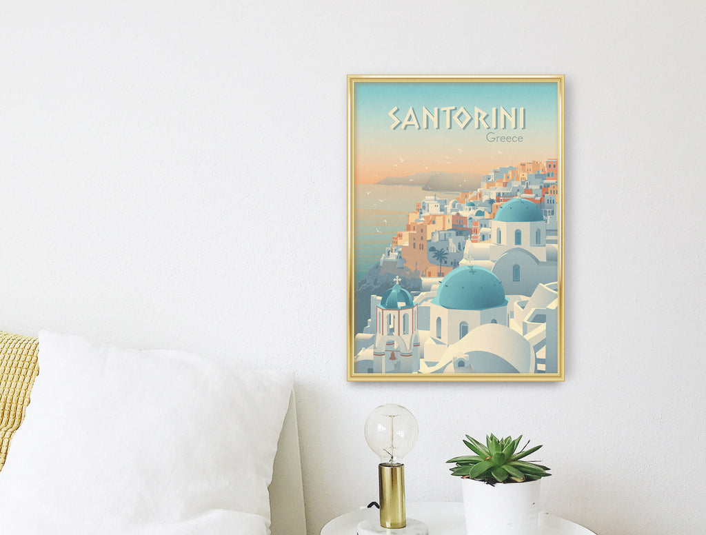 An original travel poster of the Greek Island of Santorini, located on the south east of mainland Greece in the Aegean Sea and is part of the Cyclades group of islands.