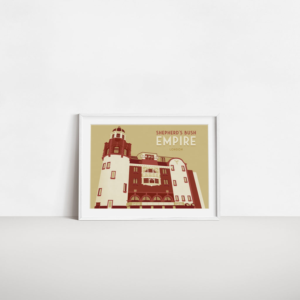 An original travel poster featuring legendary live music venue Shepherd's Bush Empire in West London.