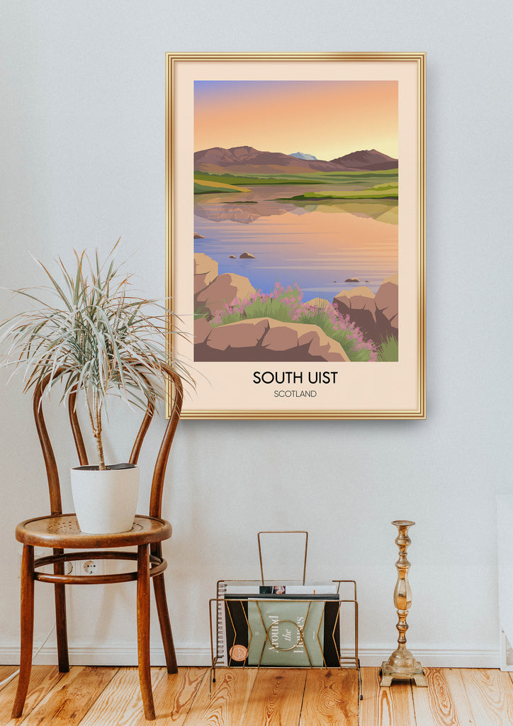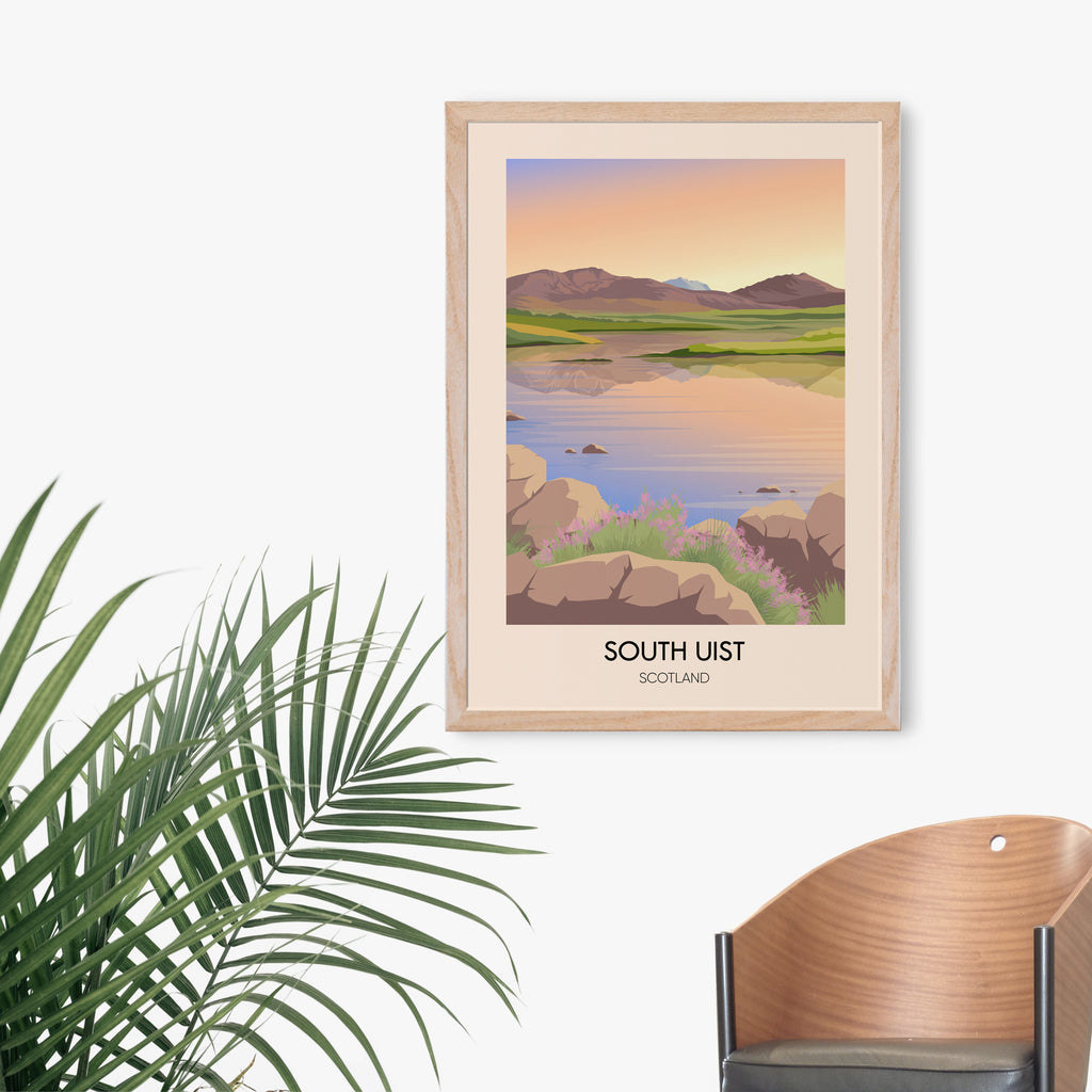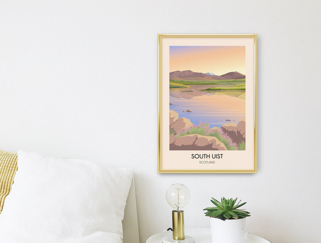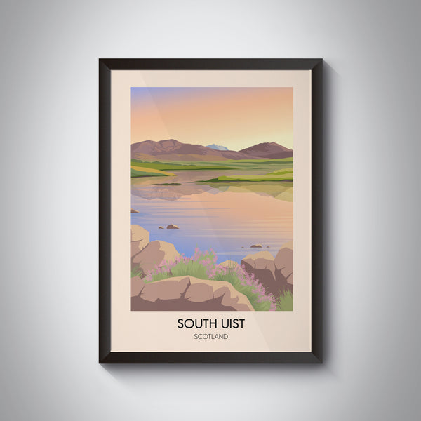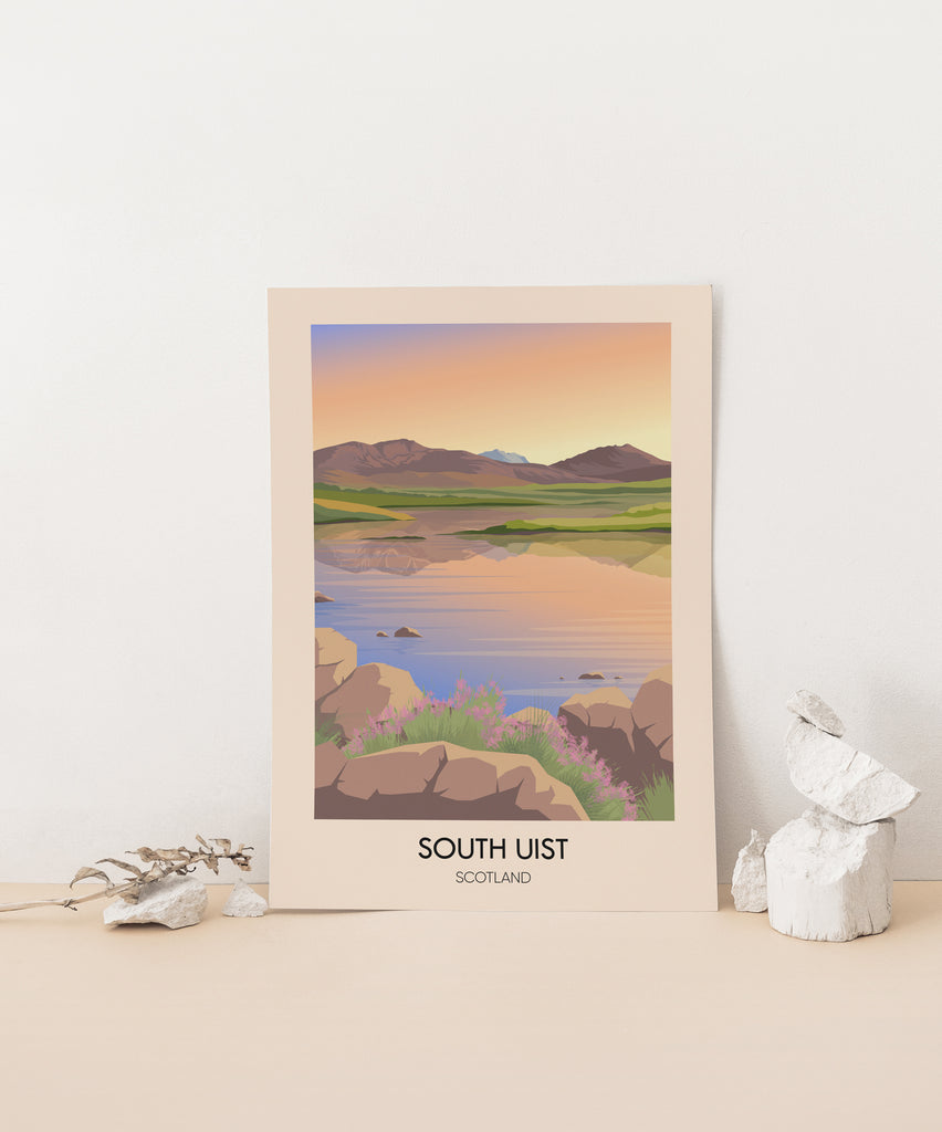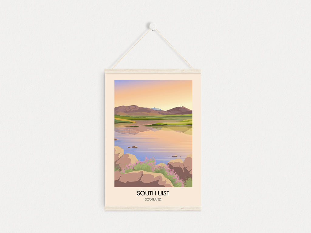 An original travel poster featuring the Scottish Island, South Uist. South Uist is the second largest in the Outer Hebrides and lies between Benbecula and Barra.