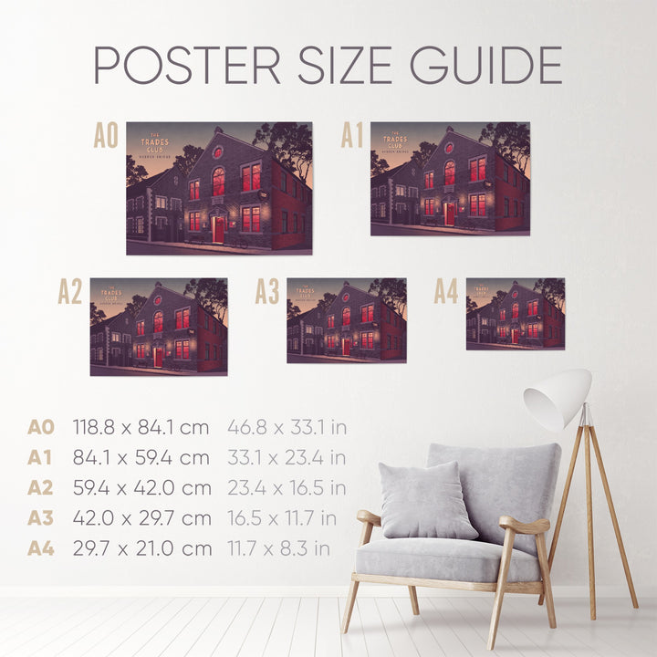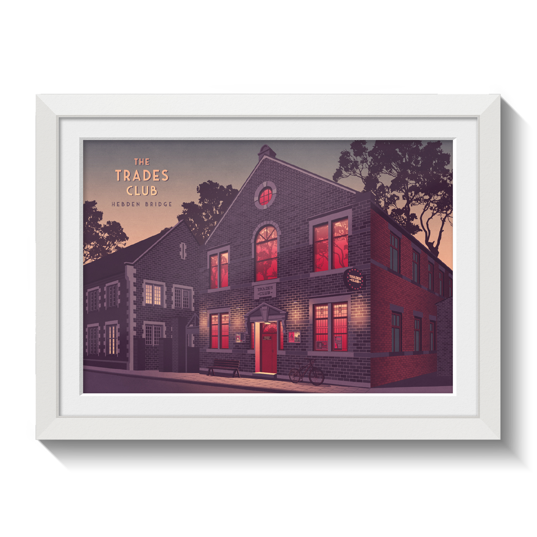 An original travel poster featuring the iconic Trades Club. It is a independent socialist members cooperative, club, bar and music venue in Hebden Bridge, West Yorkshire. Built in 1924 as a joint enterprise by half a dozen local trade unions and brought back to life in 1982.