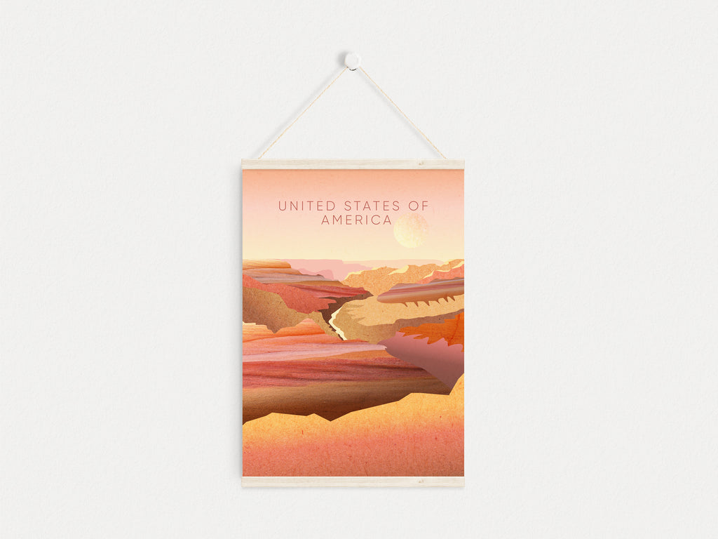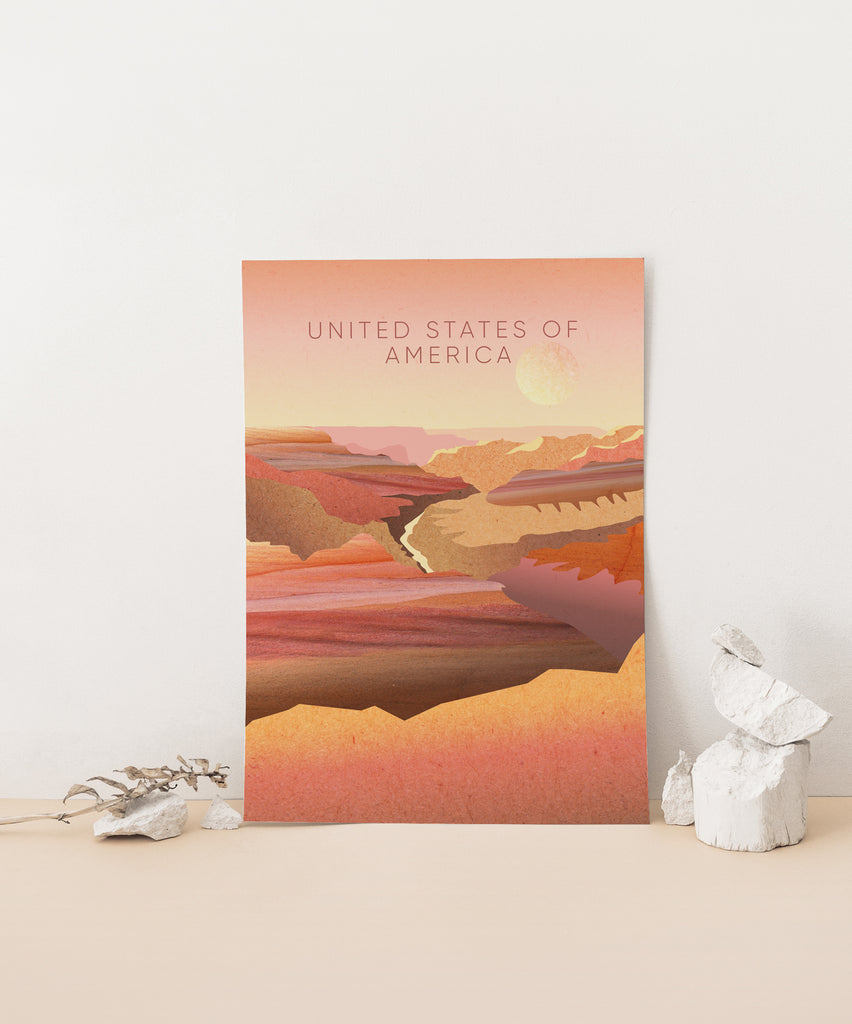 Original travel poster for the USA, a country in the North American continent. The United States of America is made up of 50 states and is the 4th largest country in the world. It also has a vast National Parks system and is home to some of the most diverse nature in the world from deserts to mountains.