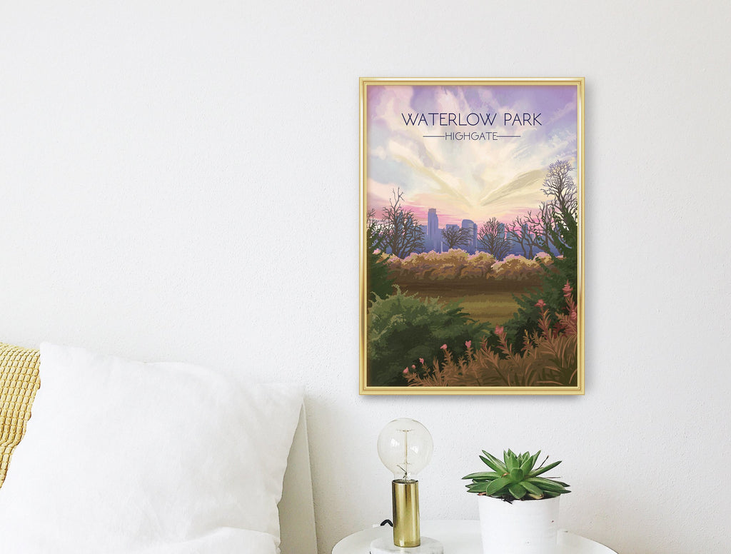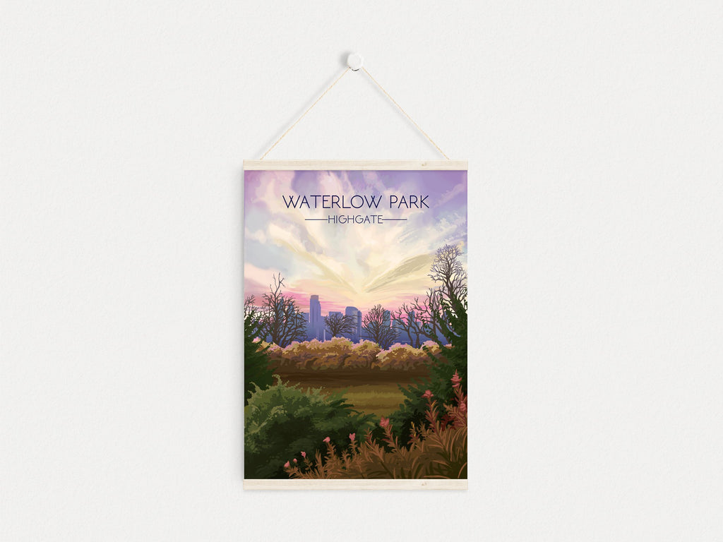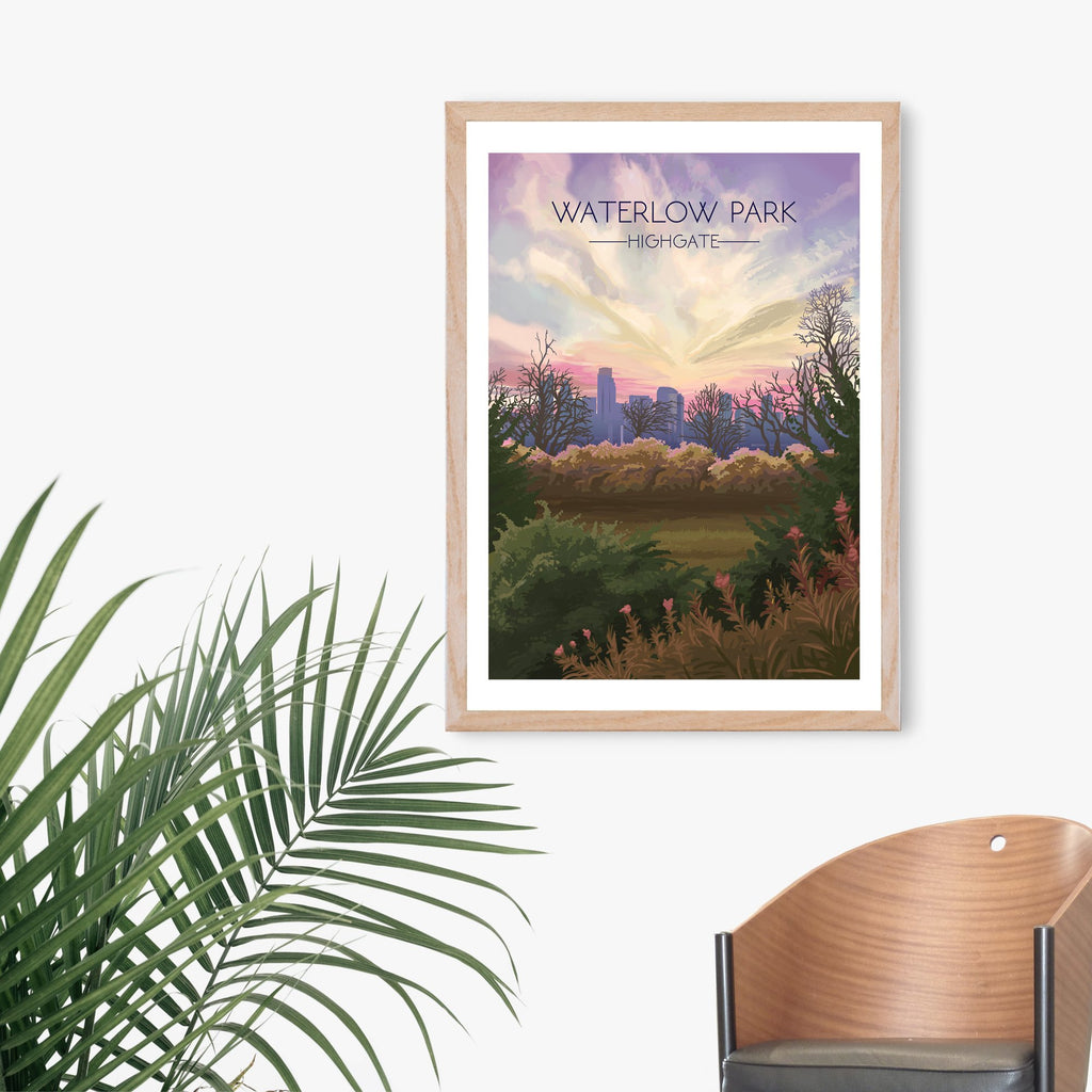A full colour print featuring the famous London skyline as seen from Waterlow Park, Highgate, North London.