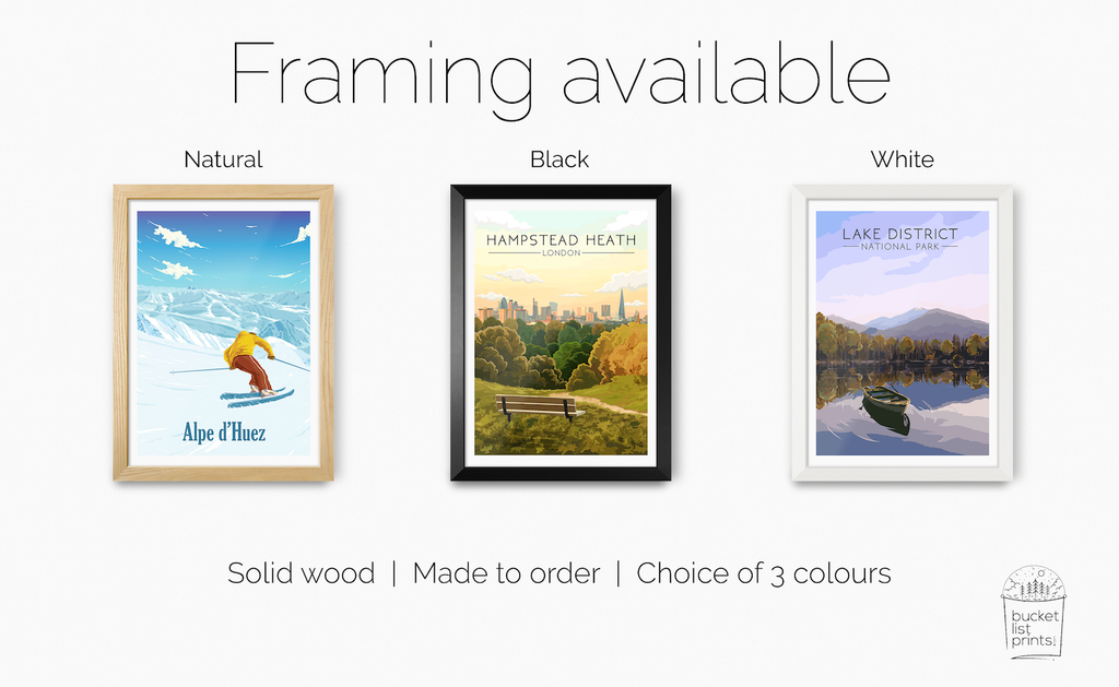 All of our prints are available professionally framed in hand-built, sustainably sourced, solid wood frames.