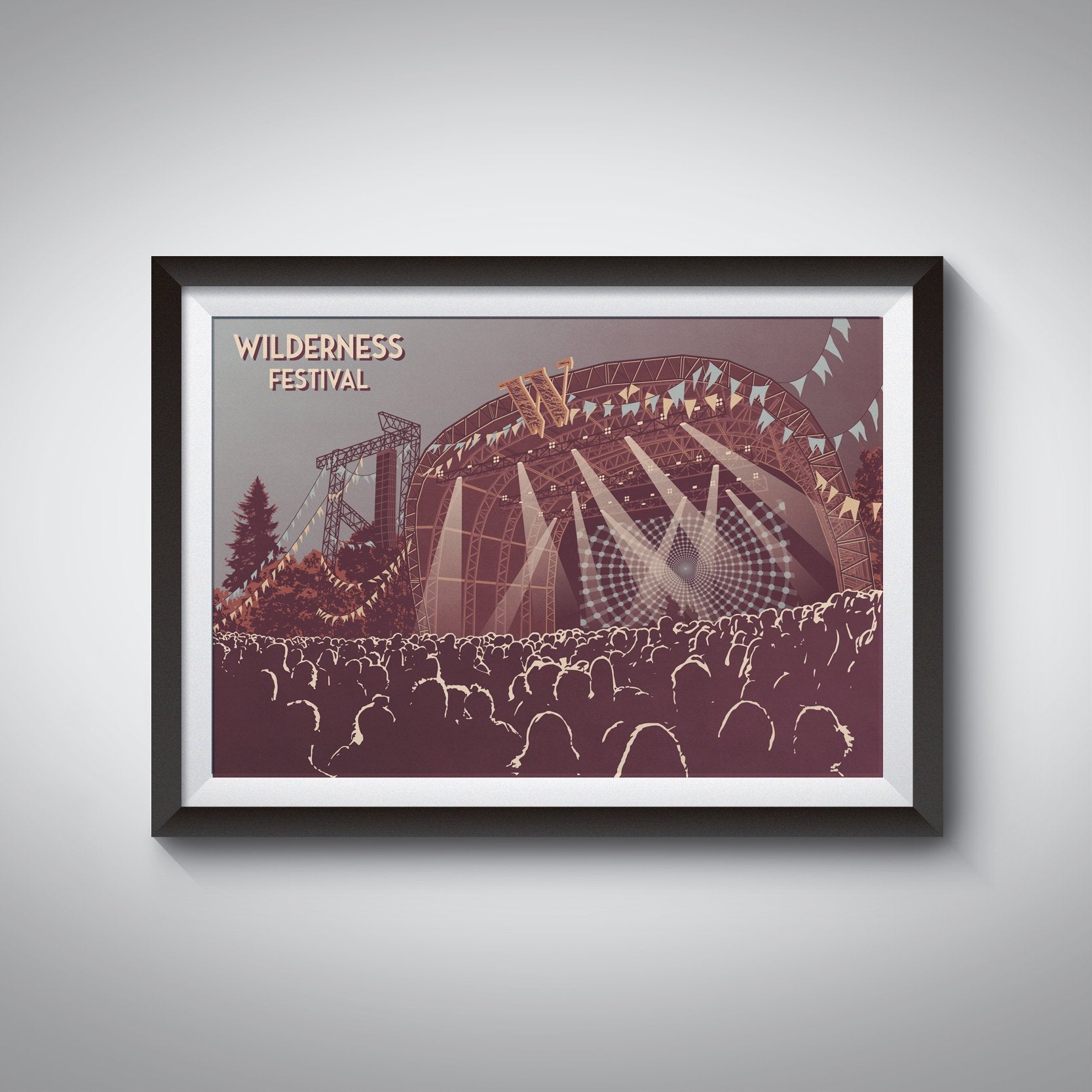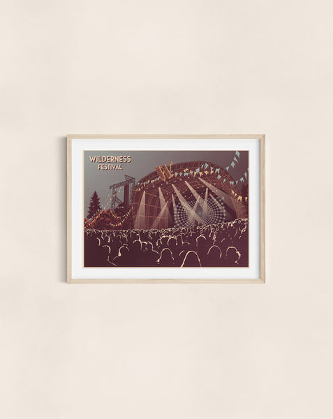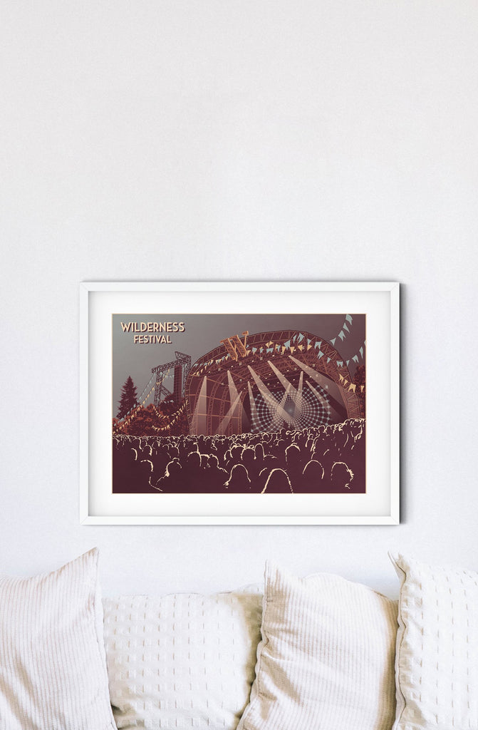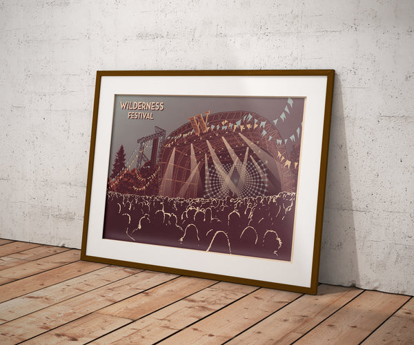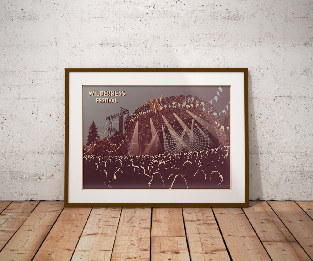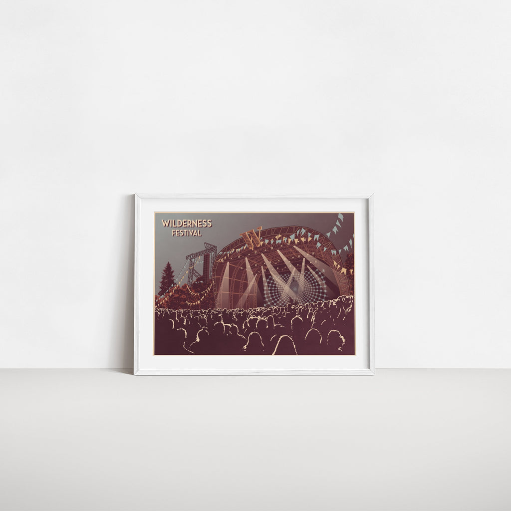 An original art print featuring the main stage at Wilderness Festival. Oxfordshire's rather civilised Wilderness Music Festival has been taking place in its Cornbury Park home since 2011 and has grown into a fully fledged multi day arts festival.