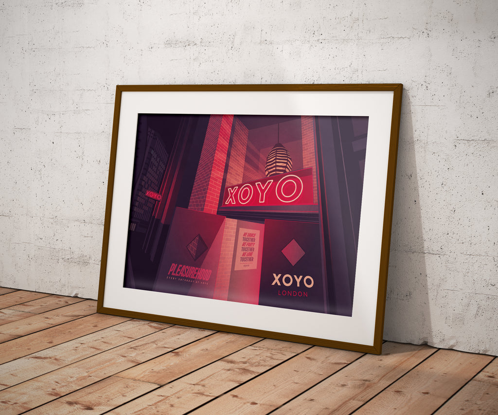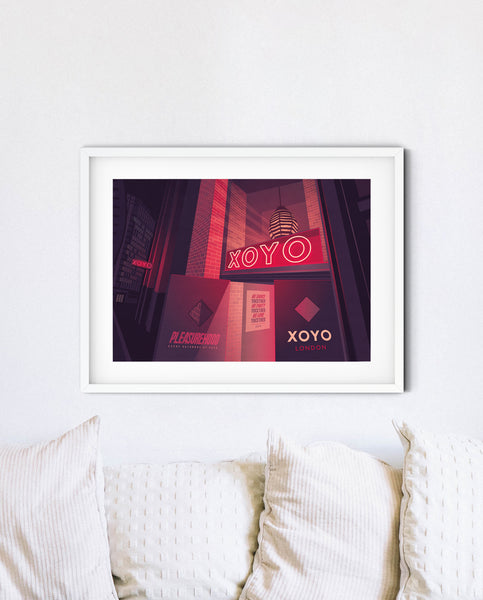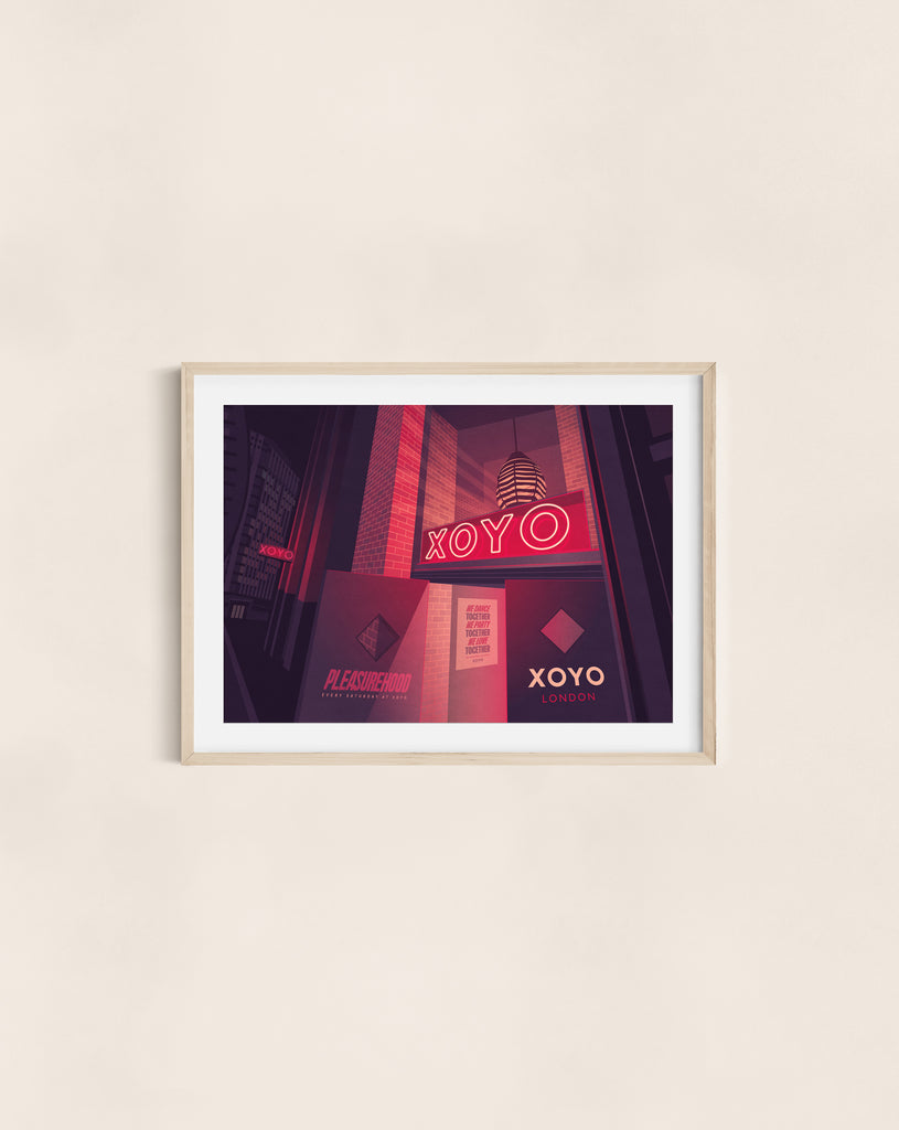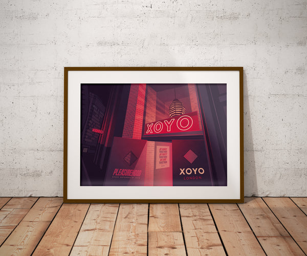 An original travel poster featuring nightclub, XOYO, London. XOYO is located in the Islington area of London near Old Street Station. The club opened in 2010 occupying a converted print works and is known for electronic music.