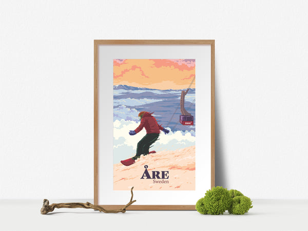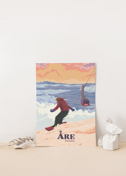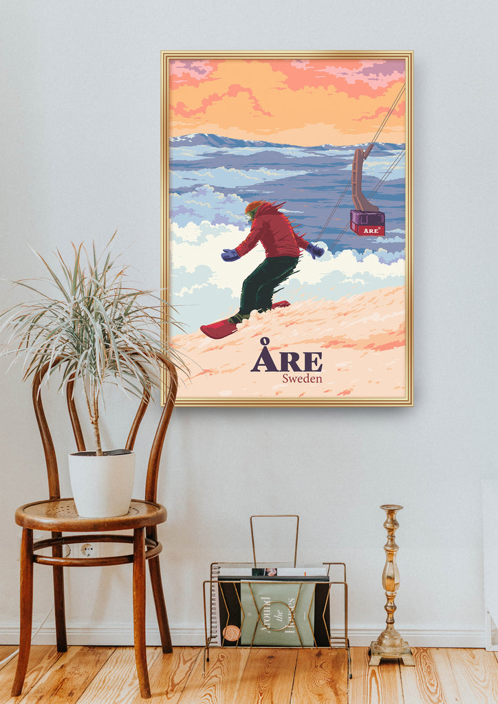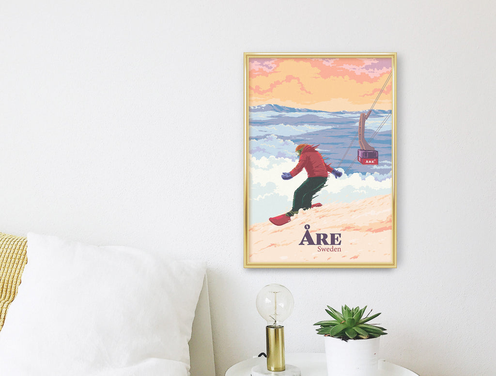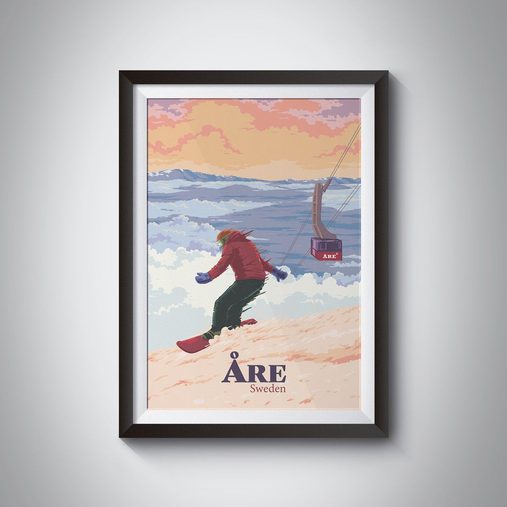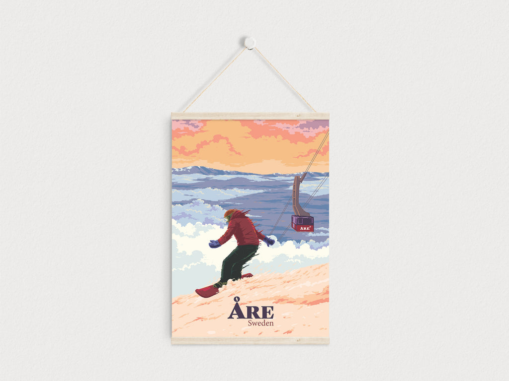 This is an original snowboarding travel poster featuring the Swedish Ski Resort of Are, in Jamtland County, Sweden. It features a downhill skier with the Are cable car in the background.
