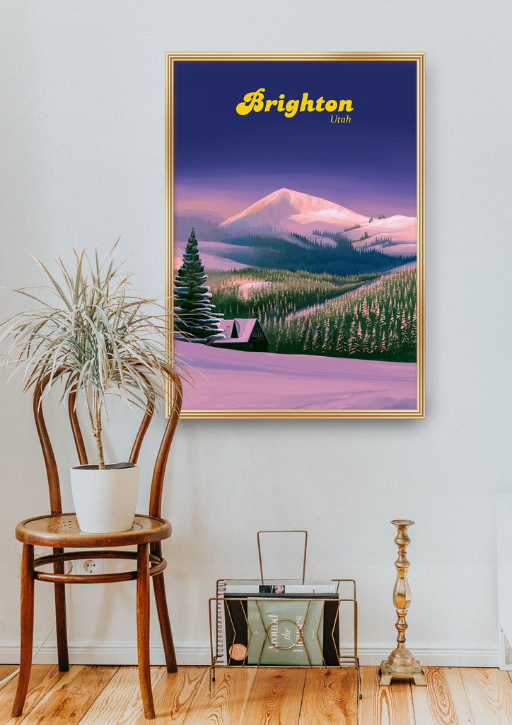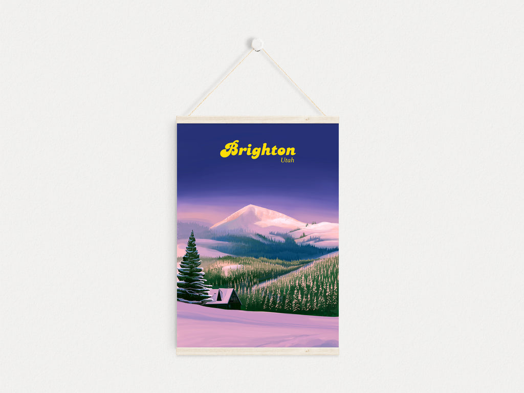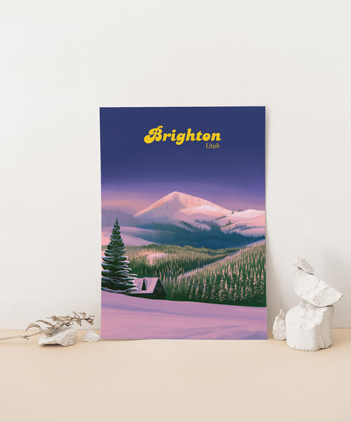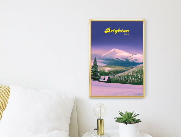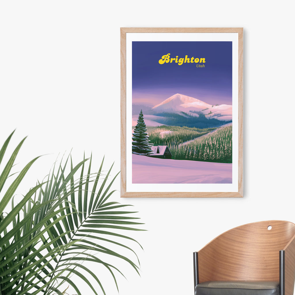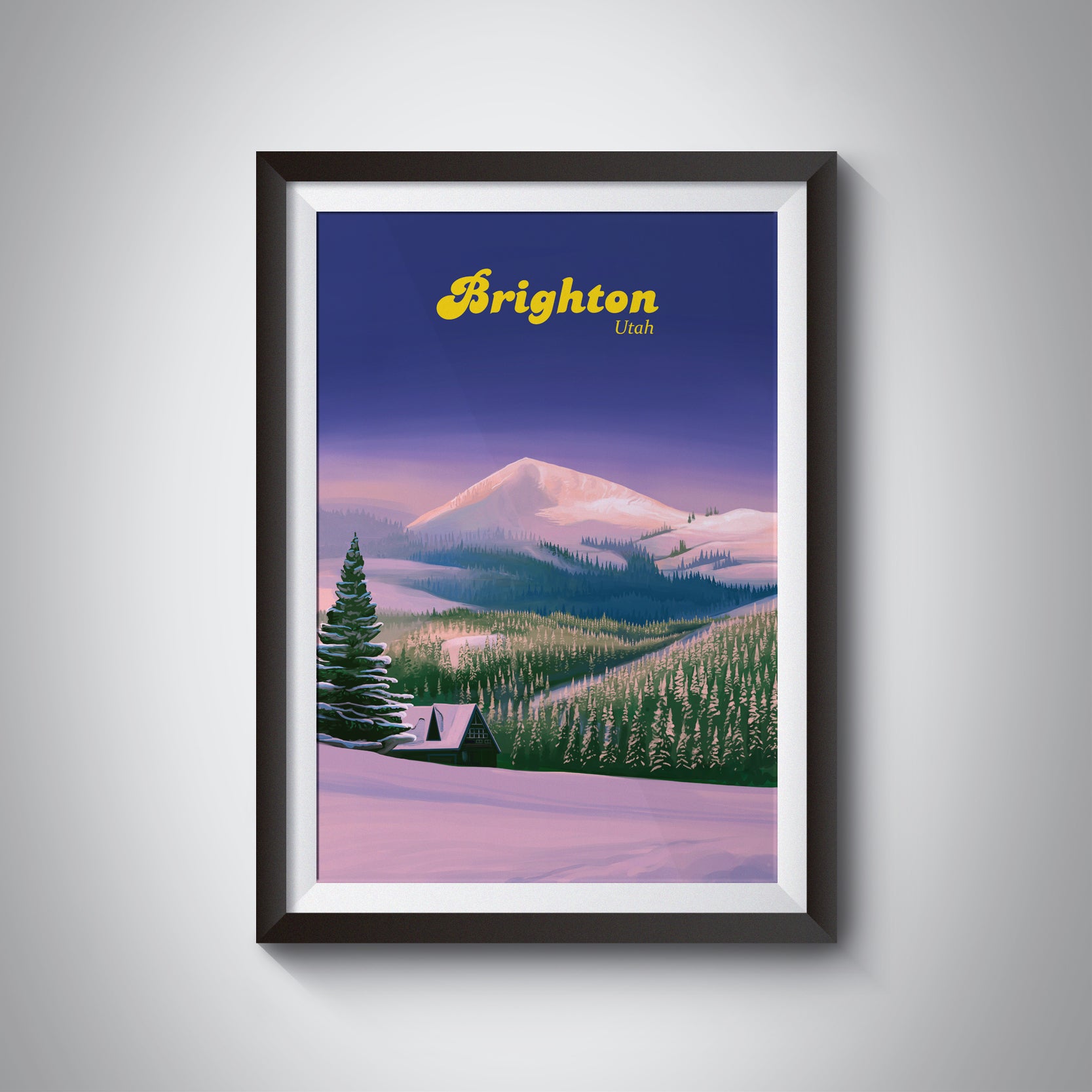 An original skiing print featuring Utah's first ski resort. Brighton Ski Resort is located in Big Cottonwood Canyon in Brighton, Utah, United States, about 30 miles from downtown Salt Lake City.