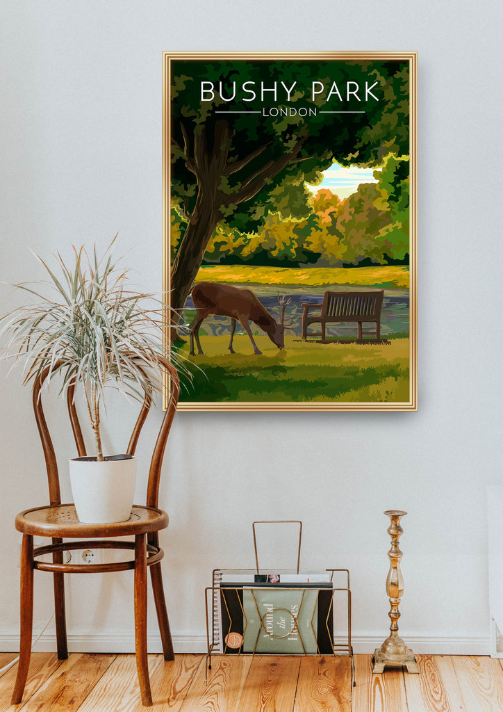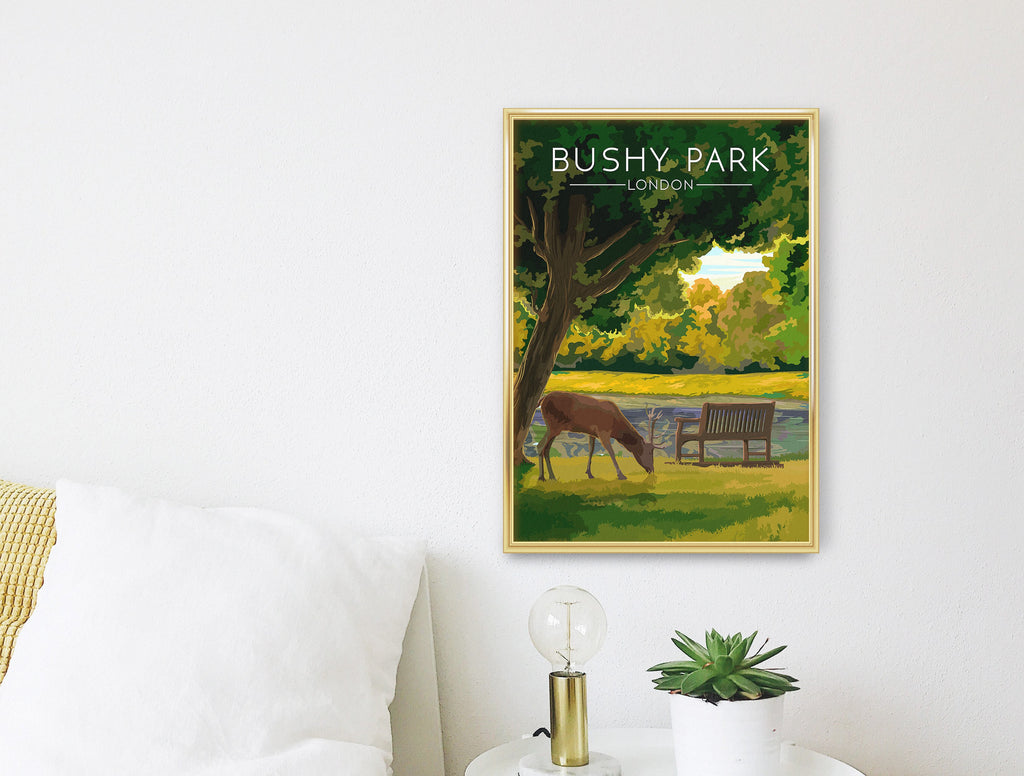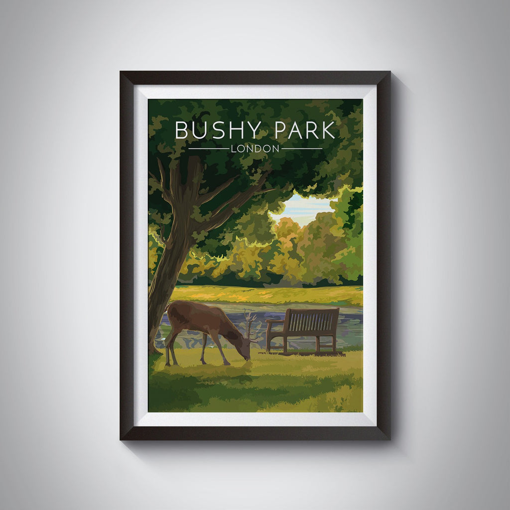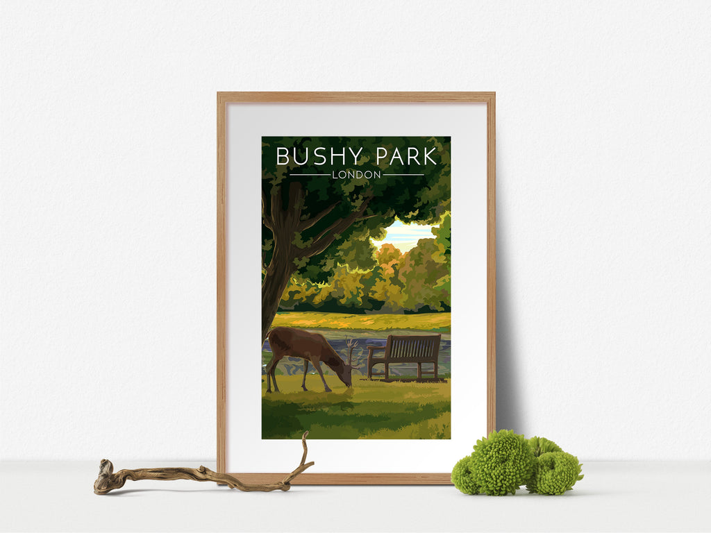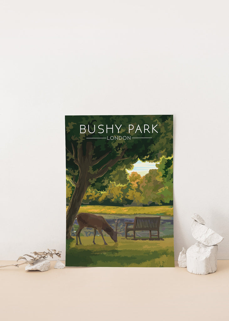 A full colour print featuring a typical peaceful Bushy Park scene. A deer grazes next to a park bench overlooking a tranquil pond.