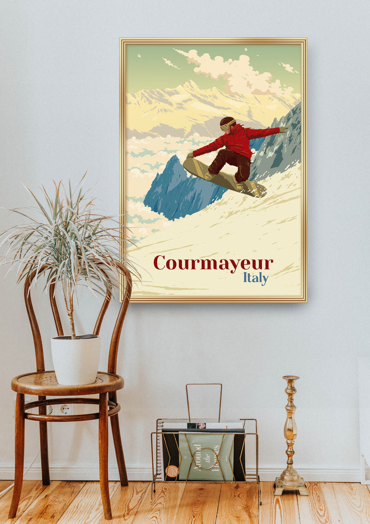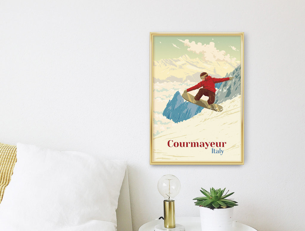 This is an original travel poster featuring the popular Italian ski resort of Courmayeur in the Vallee d'Aoste, home to the SkyWay Monte Bianco cable car, offering views of peaks like the Matterhorn and Monte Rosa.
