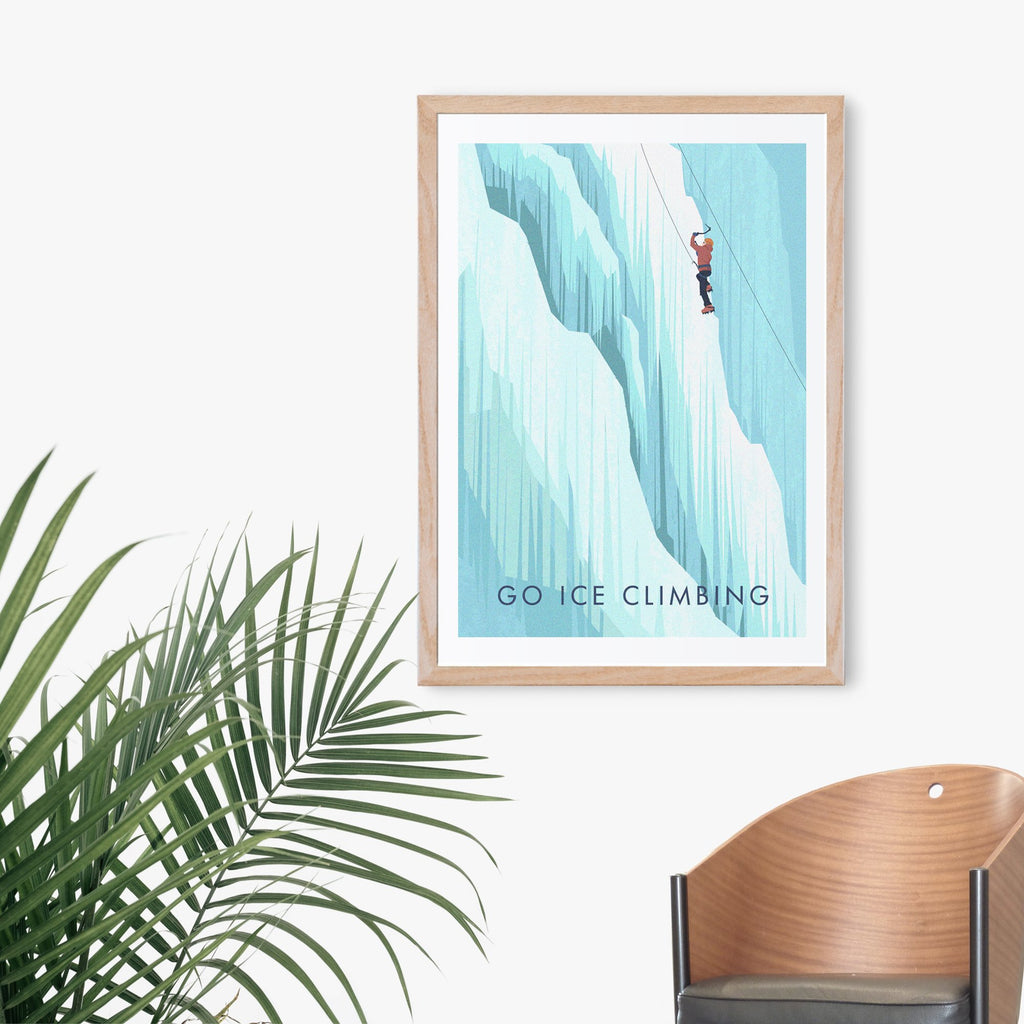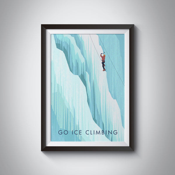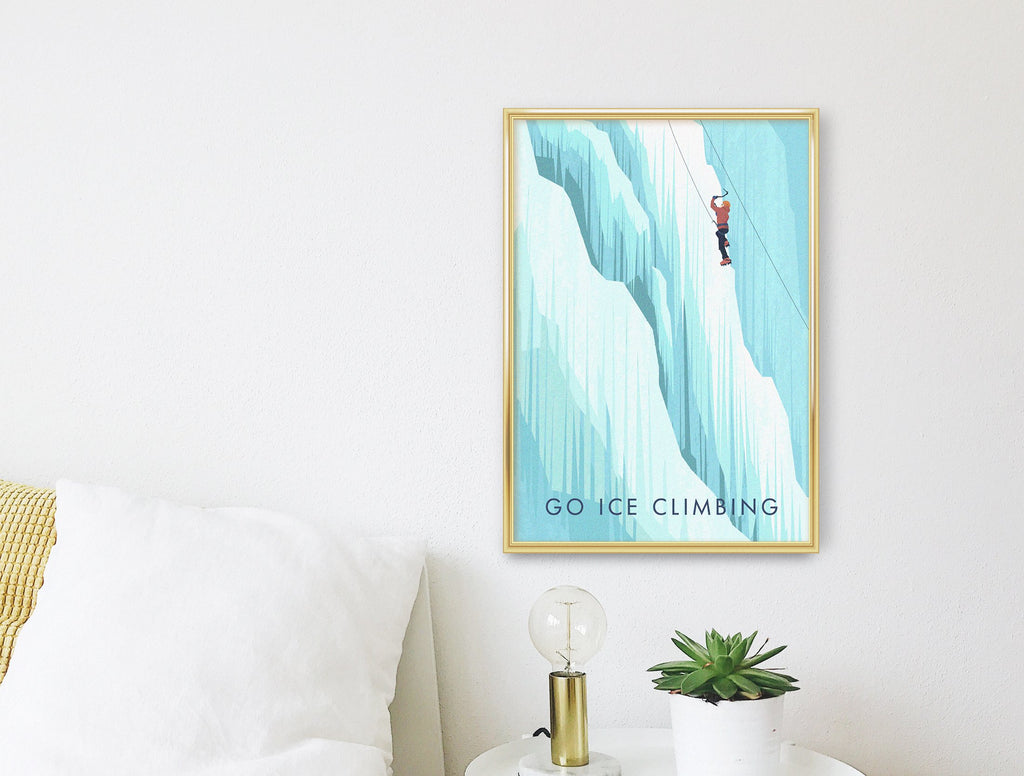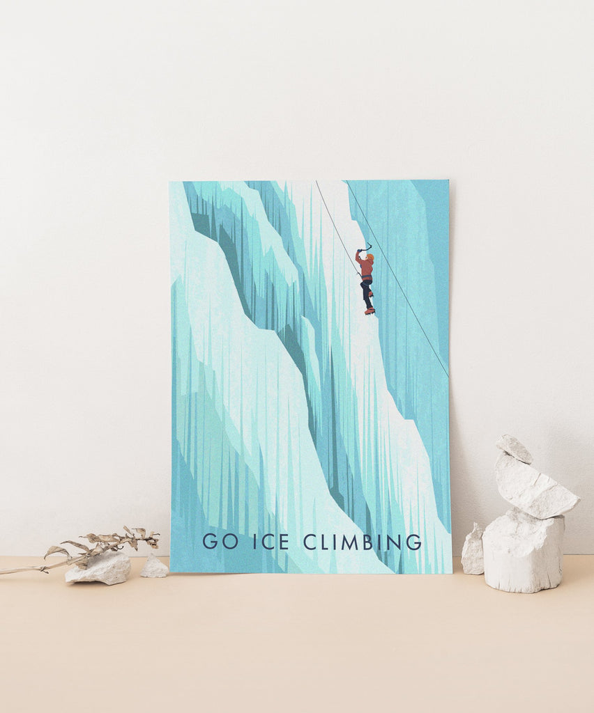 This is an original travel poster celebrating the ever popular winter activity of Ice Climbing. A perfect gift for the climber in your life or a great way to celebrate the ice and the danger of this extreme sport.