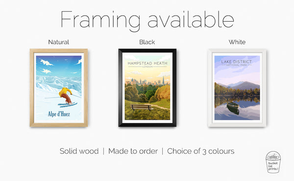 Bucket List Prints began in 2018 after a road trip across the USA, where I fell in love with the retro National Park posters I found in gift shops. Back home in England, I was surprised to find nothing similar for the UK’s 15 National Parks. So, armed with some rough sketches, I worked with talented designers from around the world to bring my ideas to life.