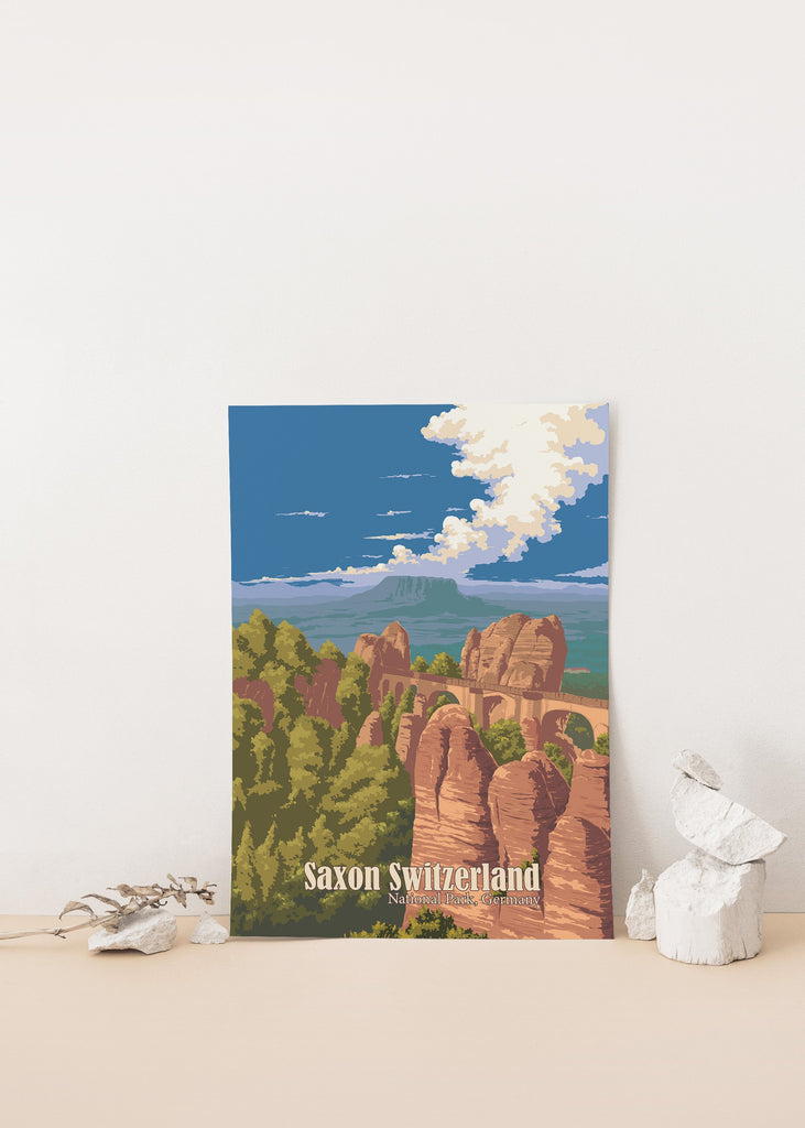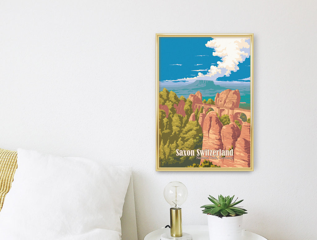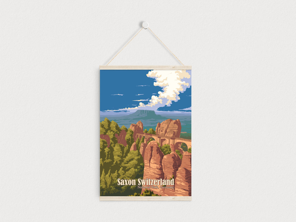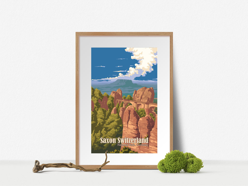 This is an original travel poster of Saxon Switzerland National Park in Germany. The travel poster features the iconic Bastei Bridge, an iconic rock formation towering 194 metres above the Elbe River