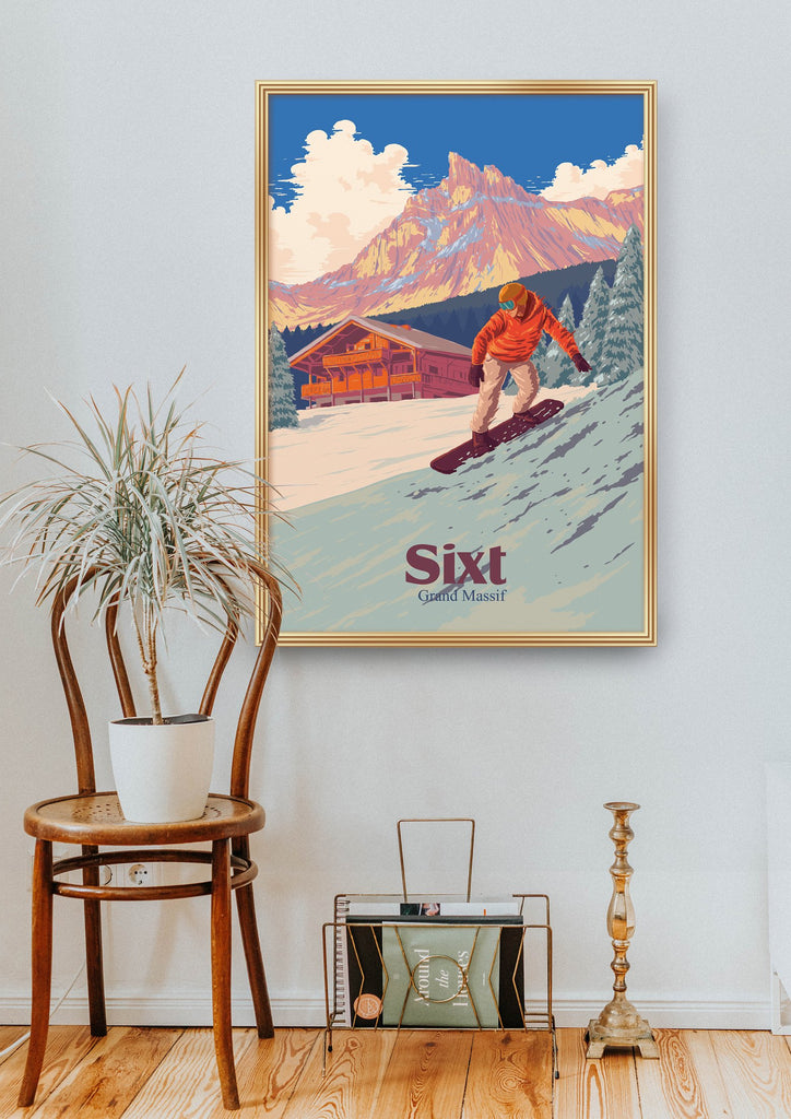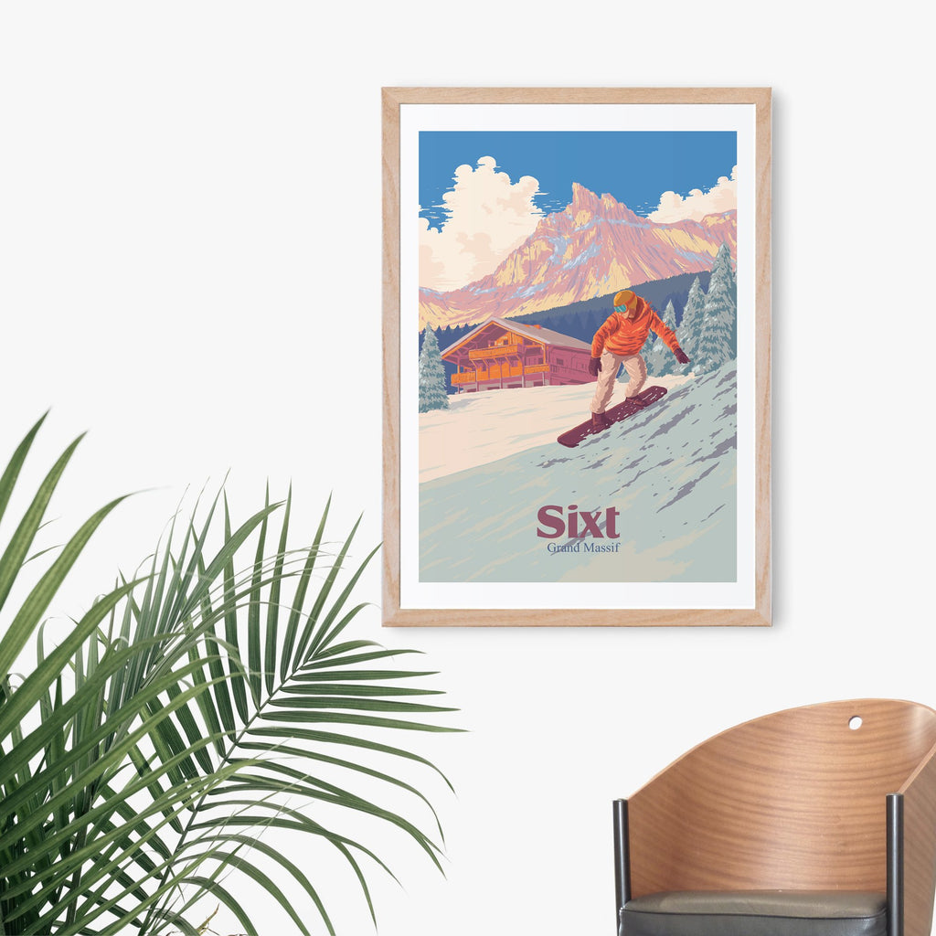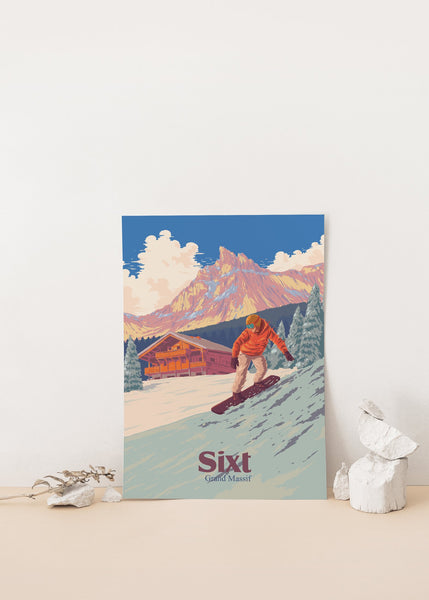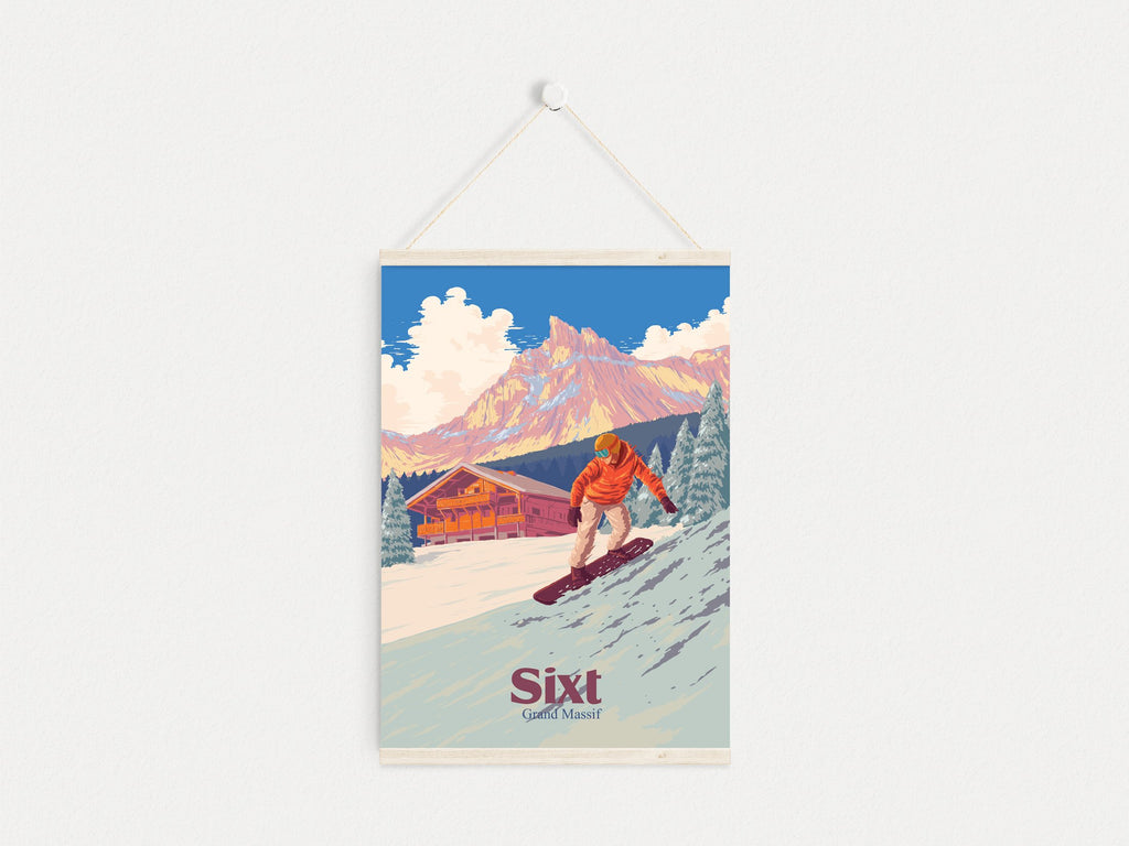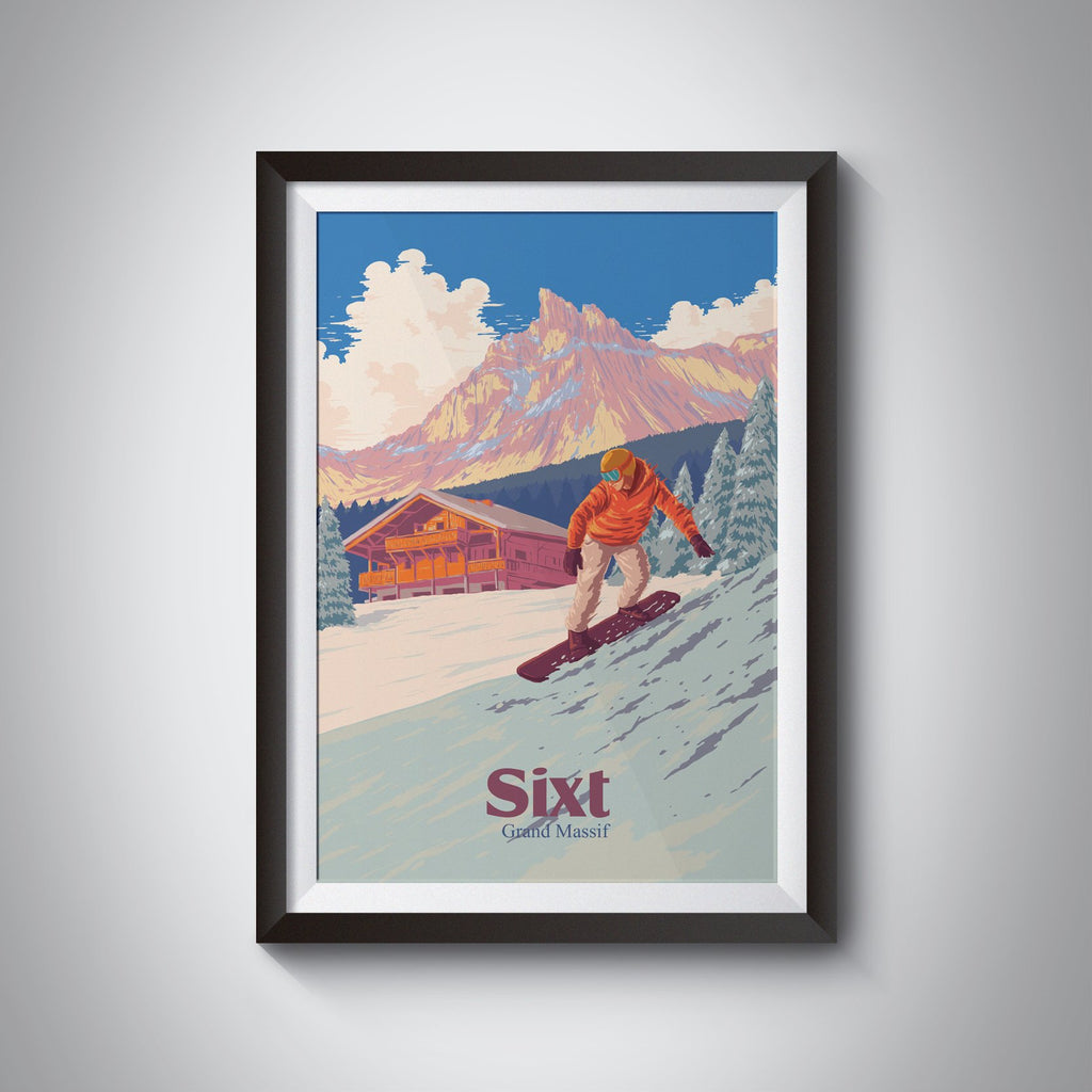 This is an original snowboard travel poster featuring the popular French ski resort of Sixt in the Grand Massif area of the French Alps.