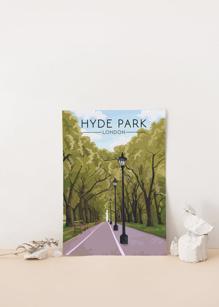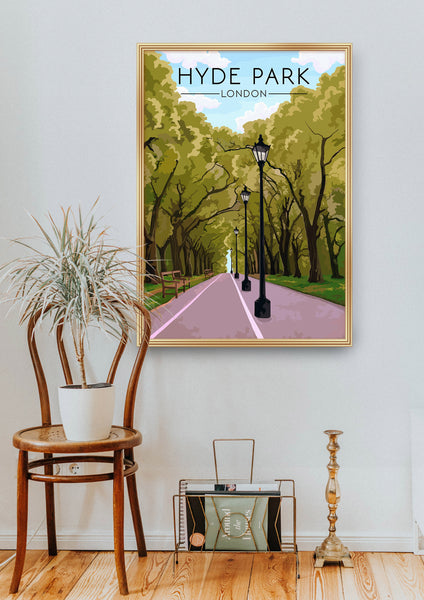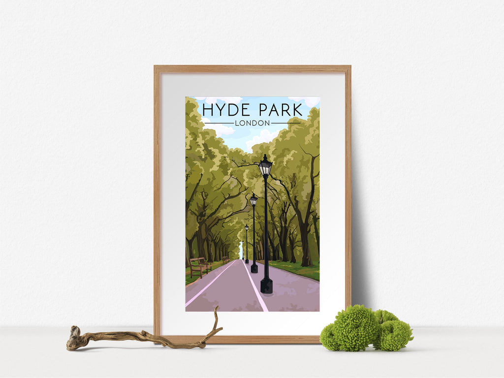 A full colour print featuring a typical Hyde Park scene. It features a picturesque pathway through the park lined by trees and park benches.