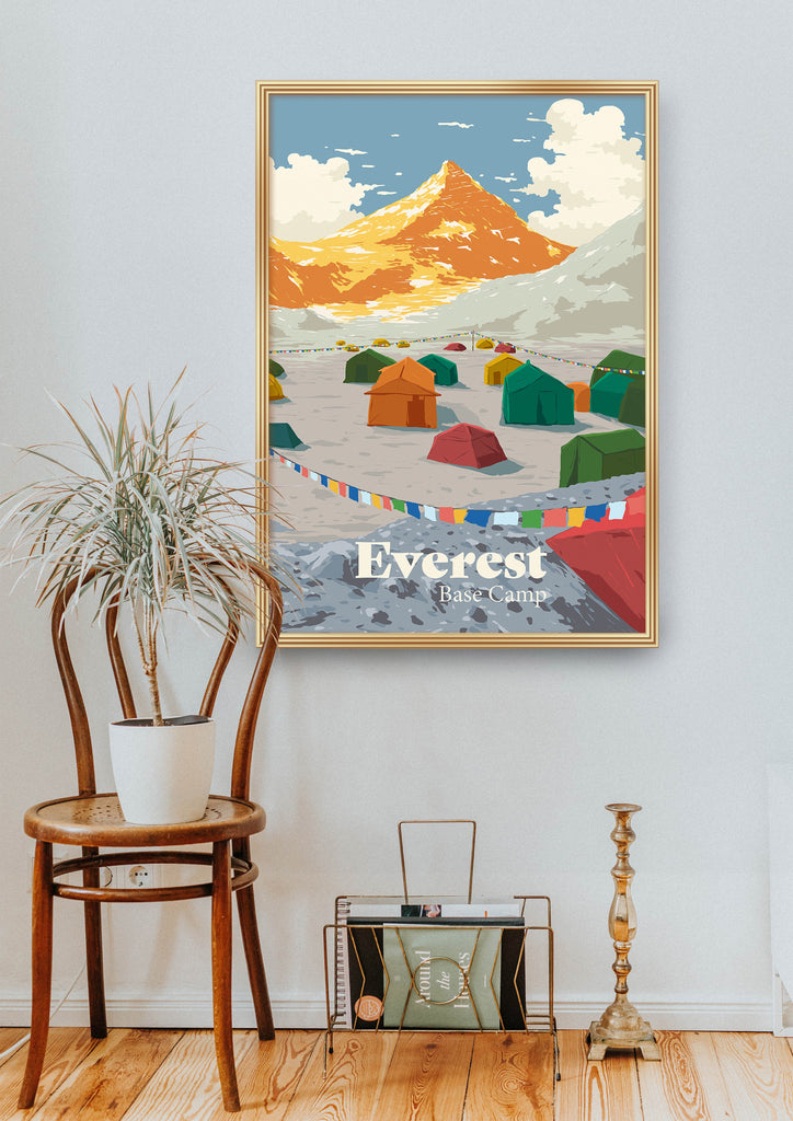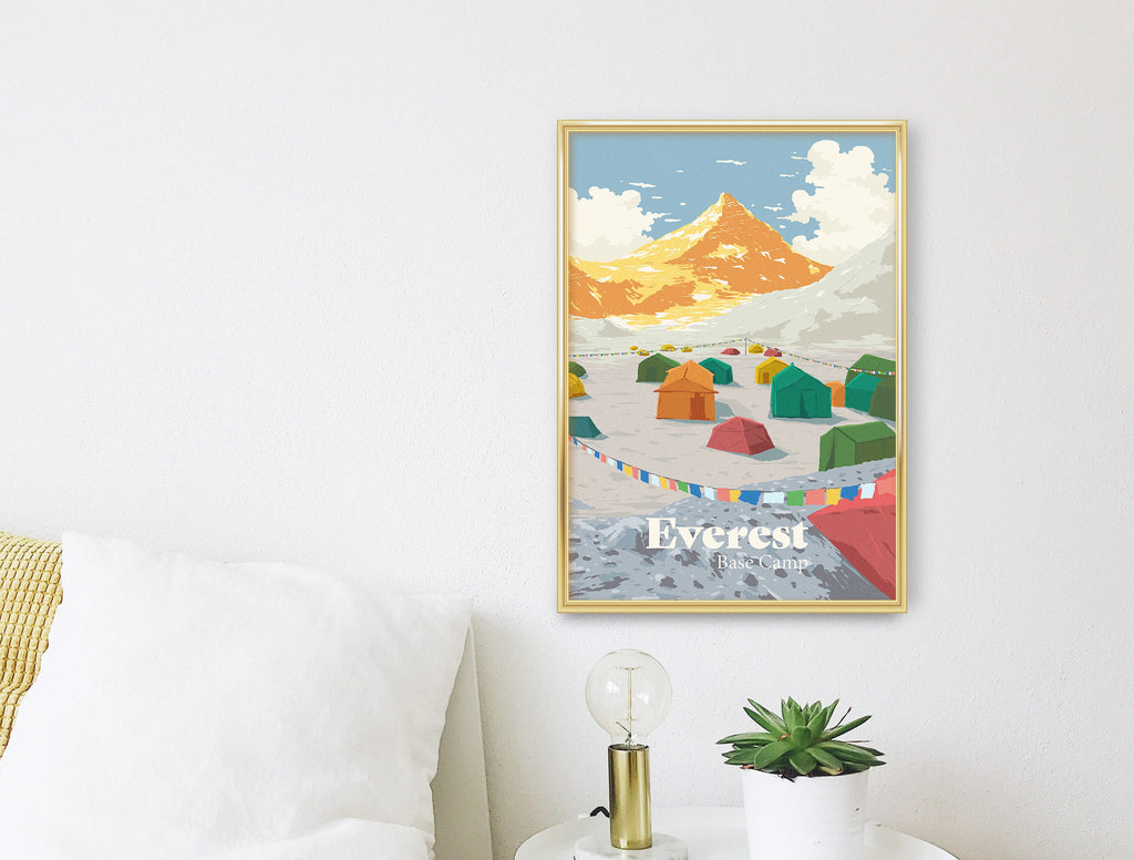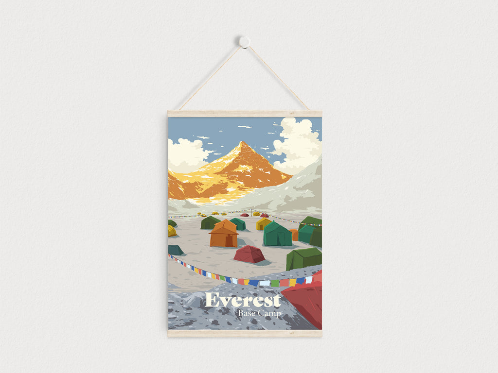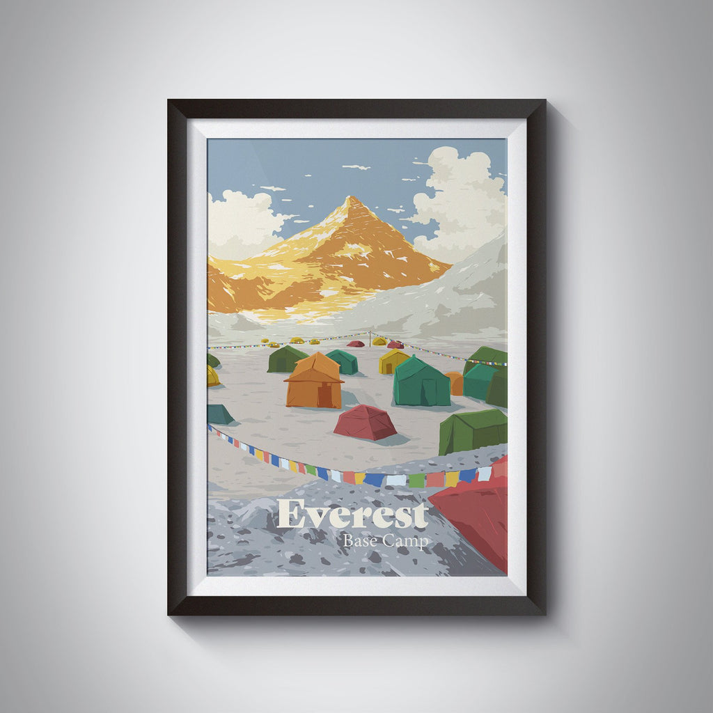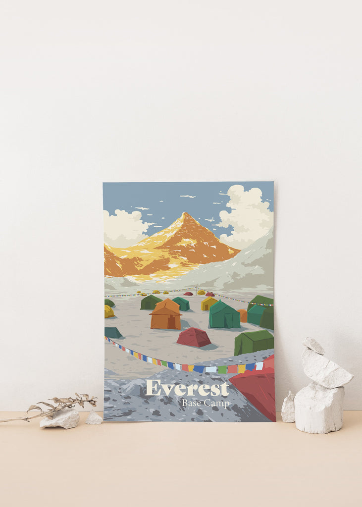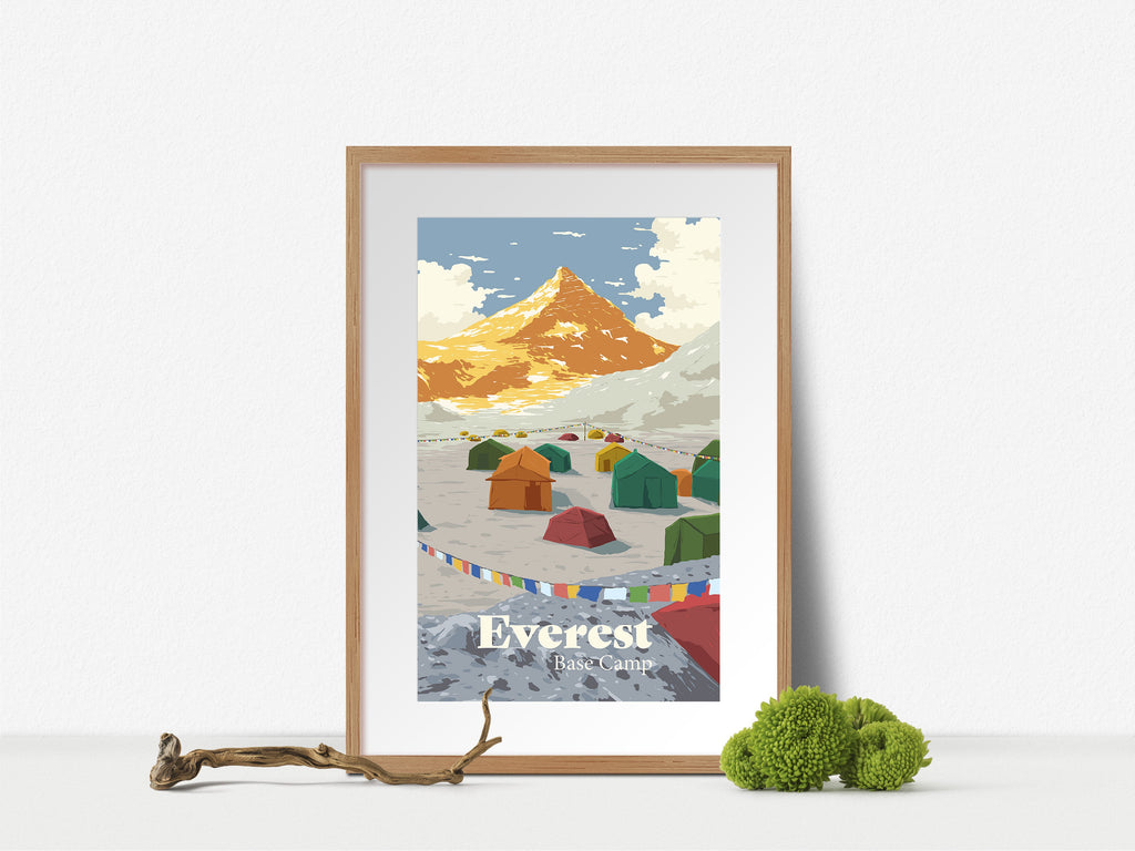 This is an original travel poster featuring Everest Base Camp, gateway to the highest point on earth.