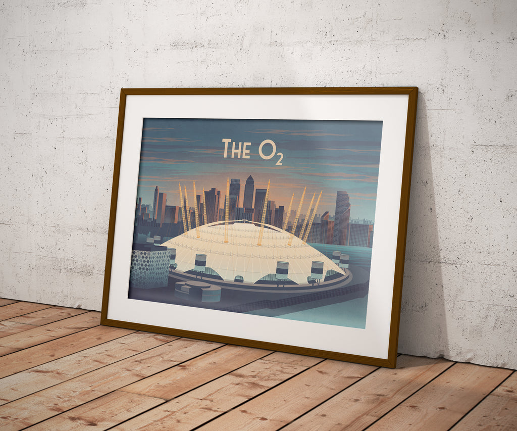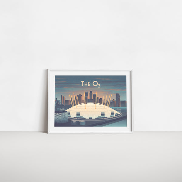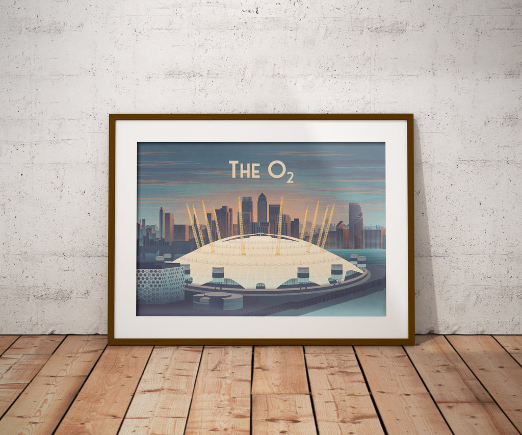 An original travel poster featuring the O2 Arena London, a large arena that hosts elite sporting events, music concerts and festivals for some of the worlds biggest stars with a capacity of up to 20,000 people. The O2 was originally called the Millennium Dome and was built as an exhibition to celebrate the turn of the millennium.