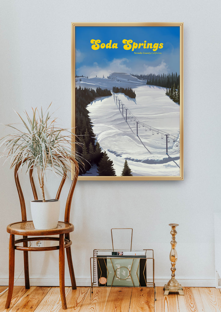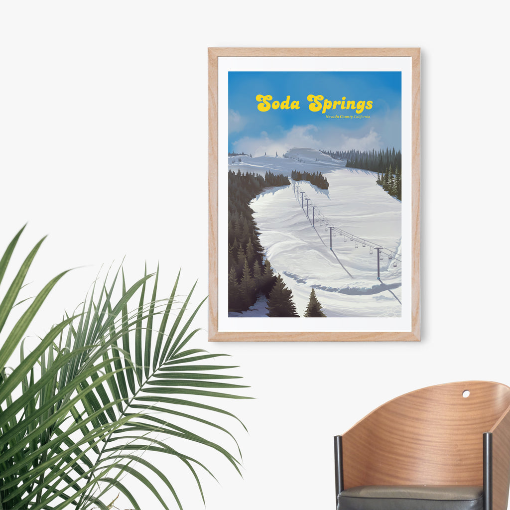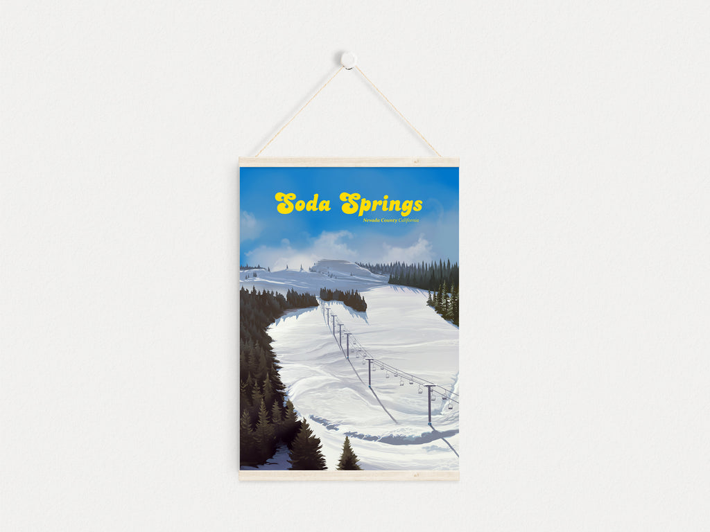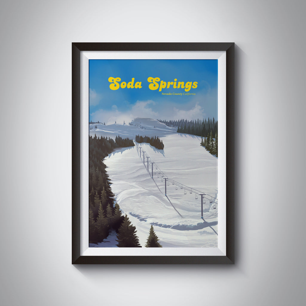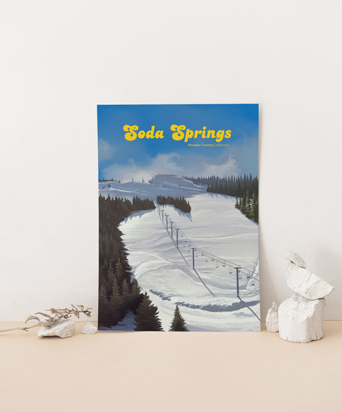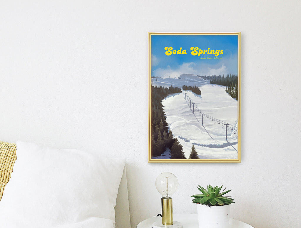 An original skiing print featuring the resort of Soda Springs, located in the Sierra Nevada mountain range in California. Soda Springs is one of closest ski areas to the San Francisco Bay Area.