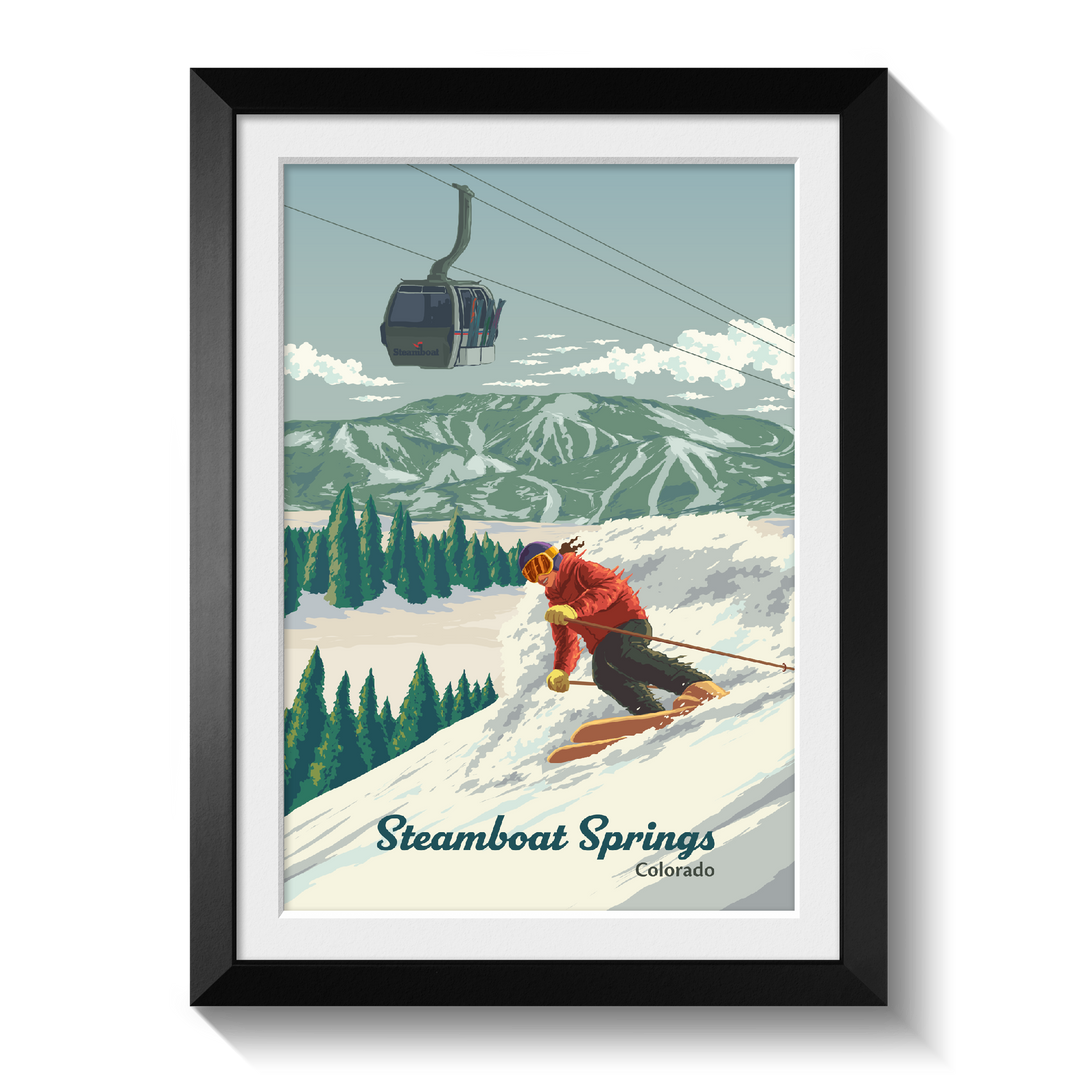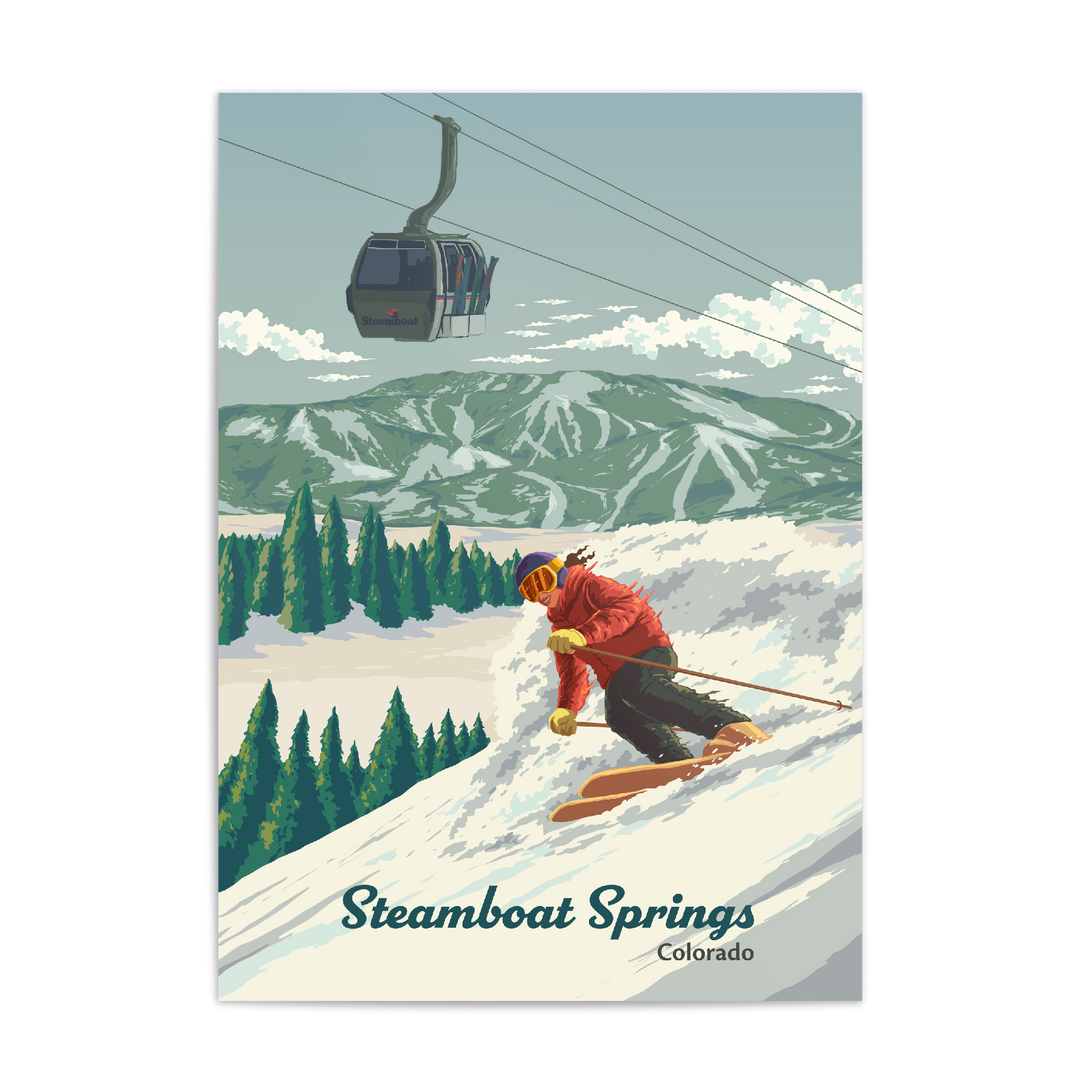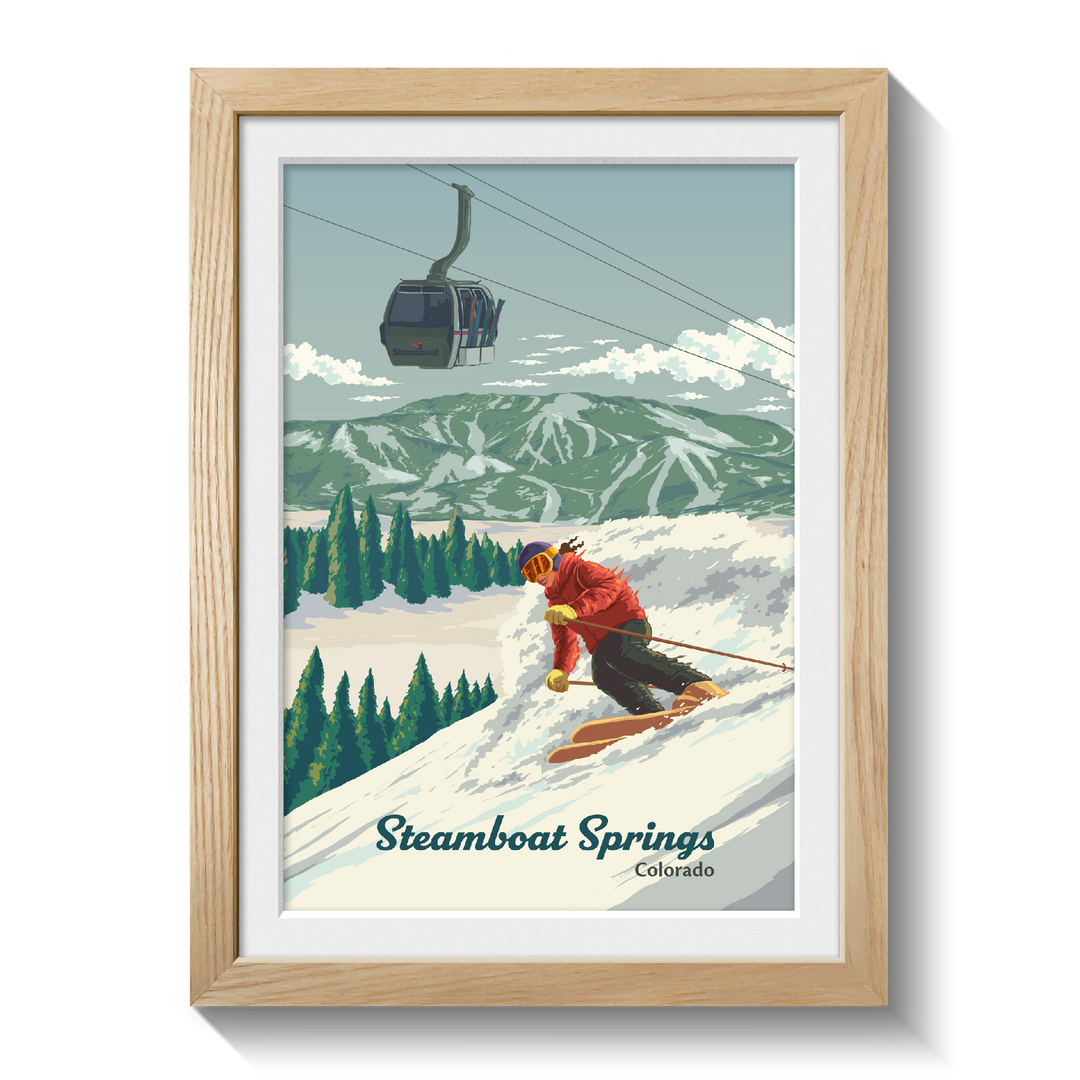 An original skiing print featuring the resort of Steamboat Springs, Colorado aka Ski Town USA.
