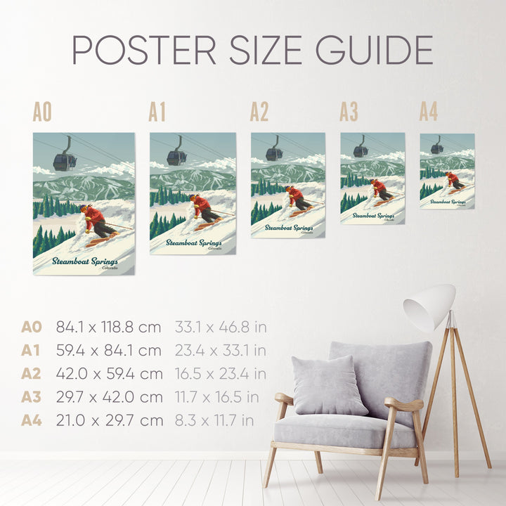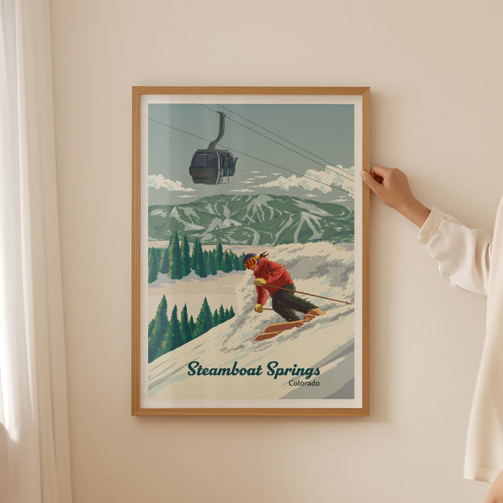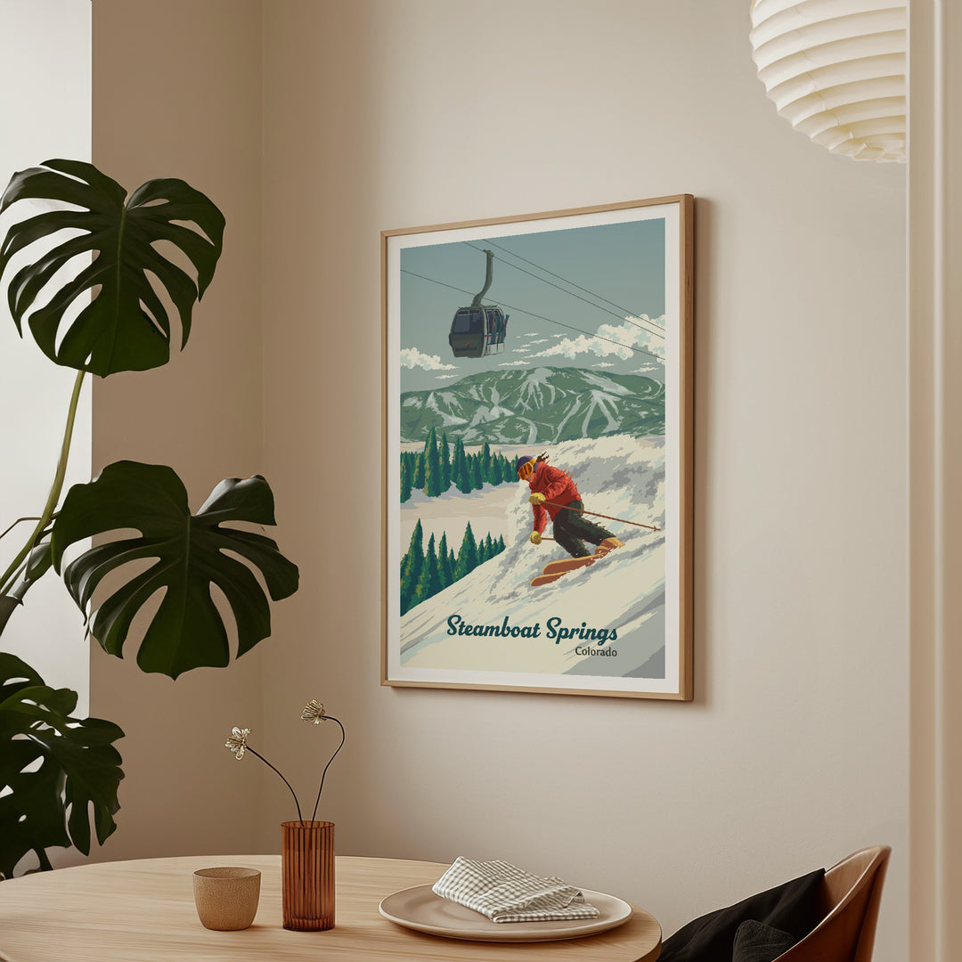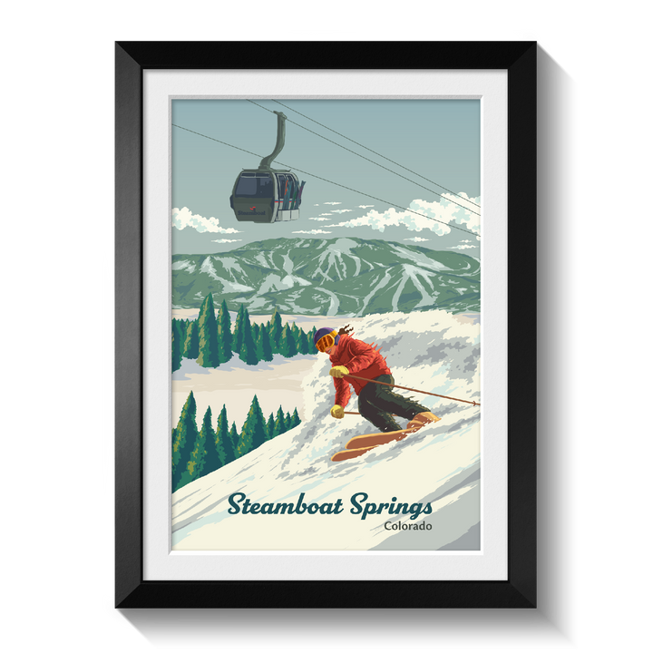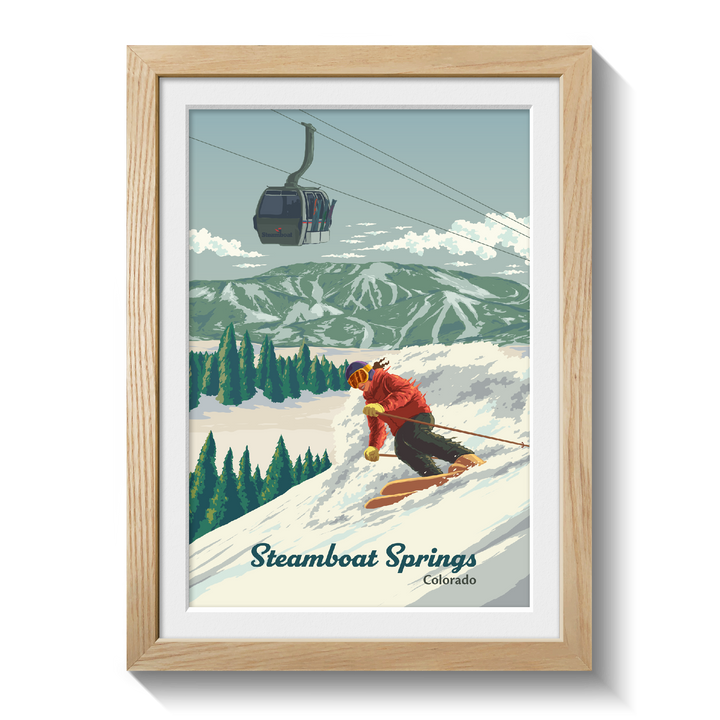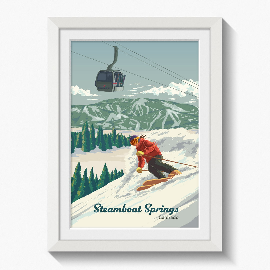 An original skiing print featuring the resort of Steamboat Springs, Colorado aka Ski Town USA.