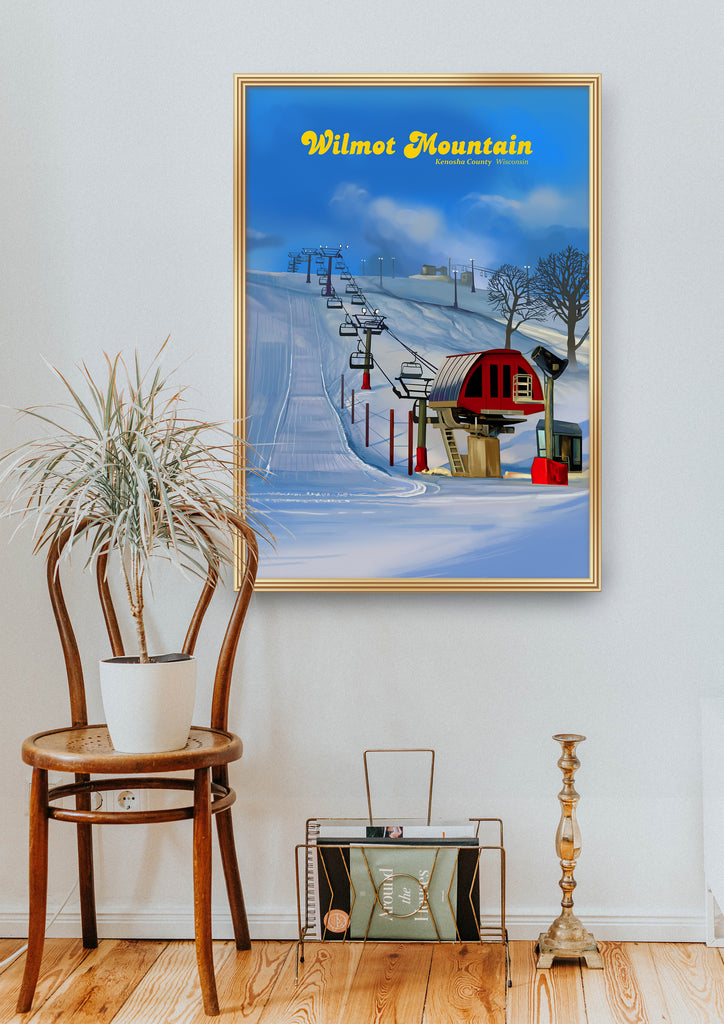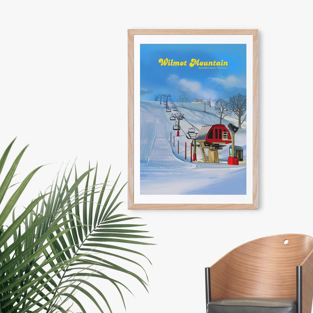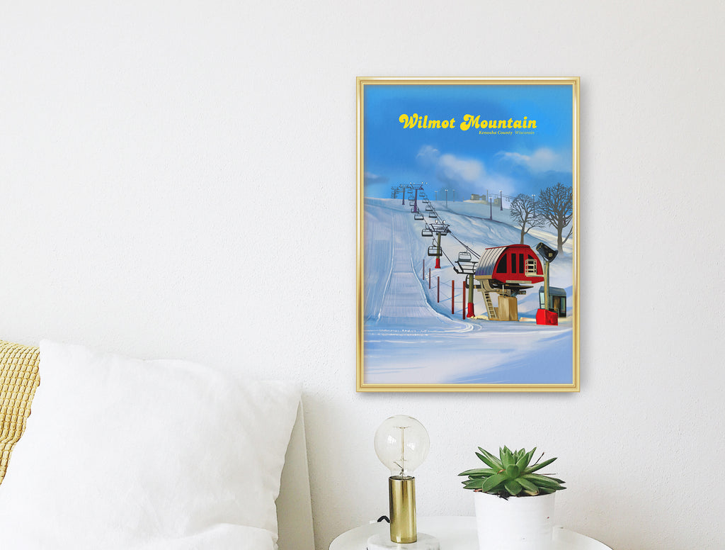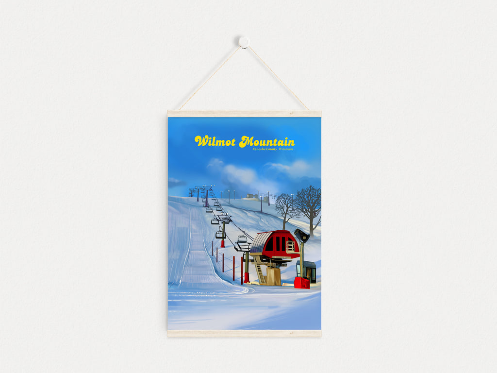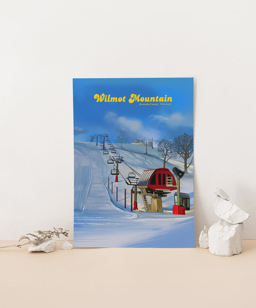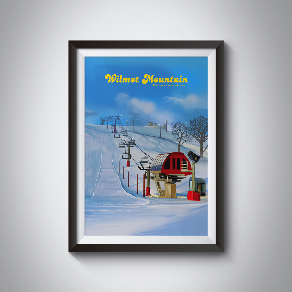This is an original ski resort print featuring Wilmot Mountain Resort, Wisconsin USA. Wilmot ski resort is one of the 36 ski resorts in Wisconsin and is known as one of the best in the area. Located near the border of Illinois, it is a popular resort with people from Chicago.