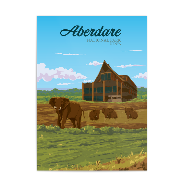 An original travel poster featuring Aberdare National Park in Kenya. The poster features the Ark Lodge hotel which was famously built to look like Noah's Ark. The hotel overlooks a watering hole which attracts some incredible wildlife, including regular visits from elephants.