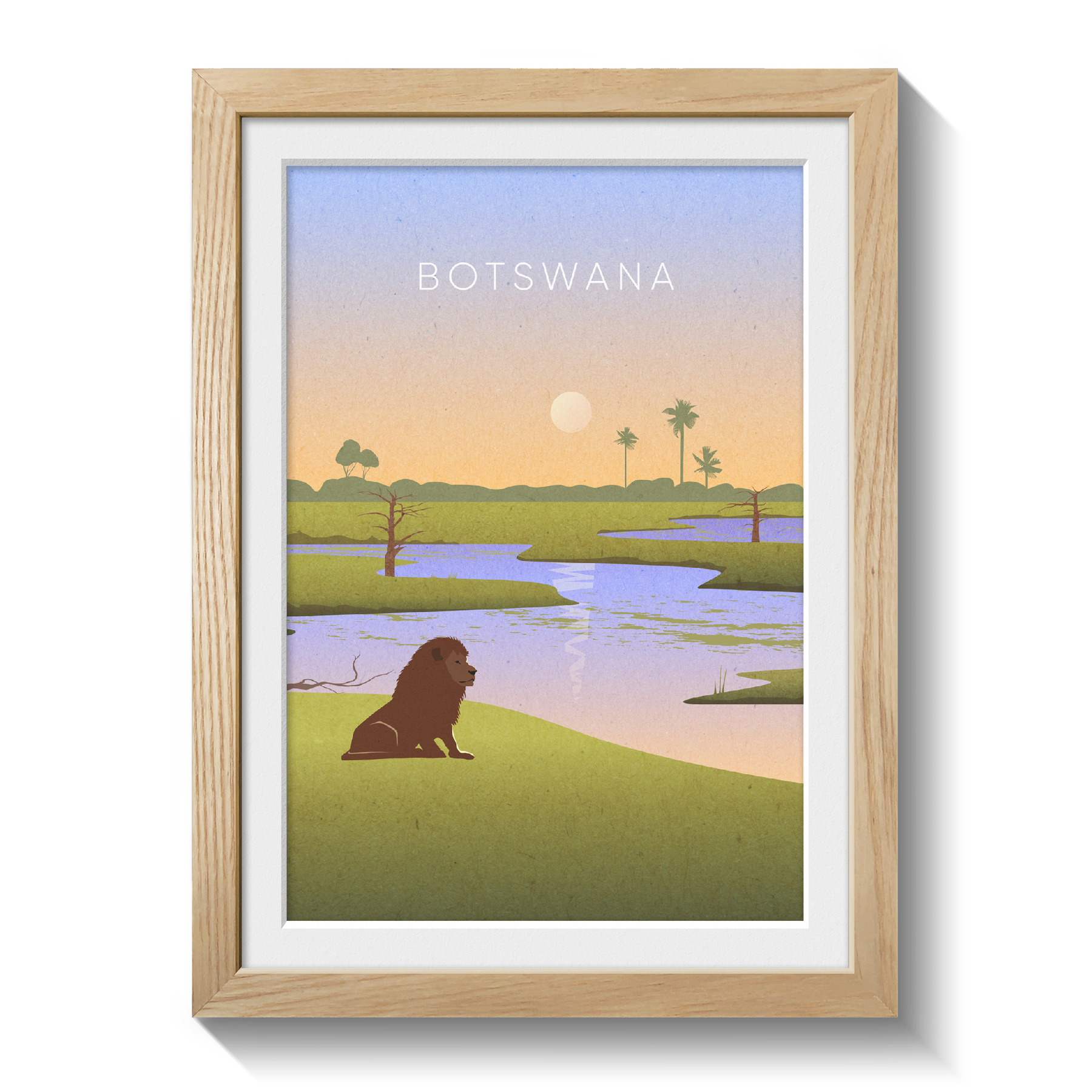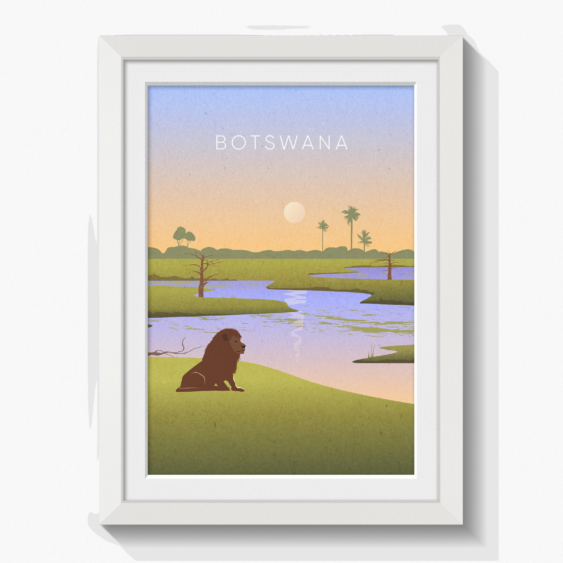 Original travel poster of Botswana. Discover the natural beauty with this minimalist travel poster. Showcasing the country's stunning landscapes and wildlife, Botswana offers unforgettable safaris and rich cultural experiences. Perfect for nature lovers and adventure seekers, this destination promises unique encounters in Africa’s pristine wilderness.