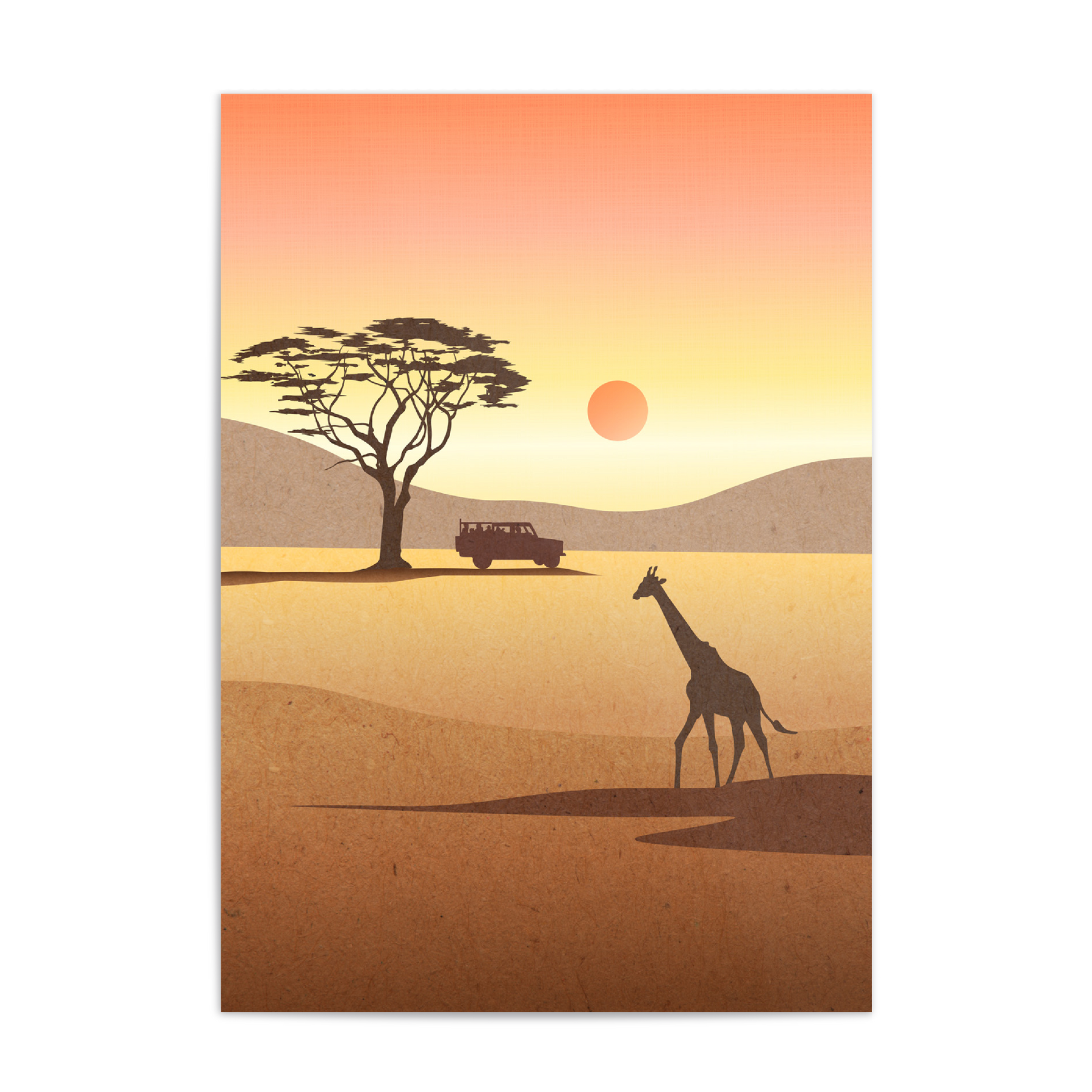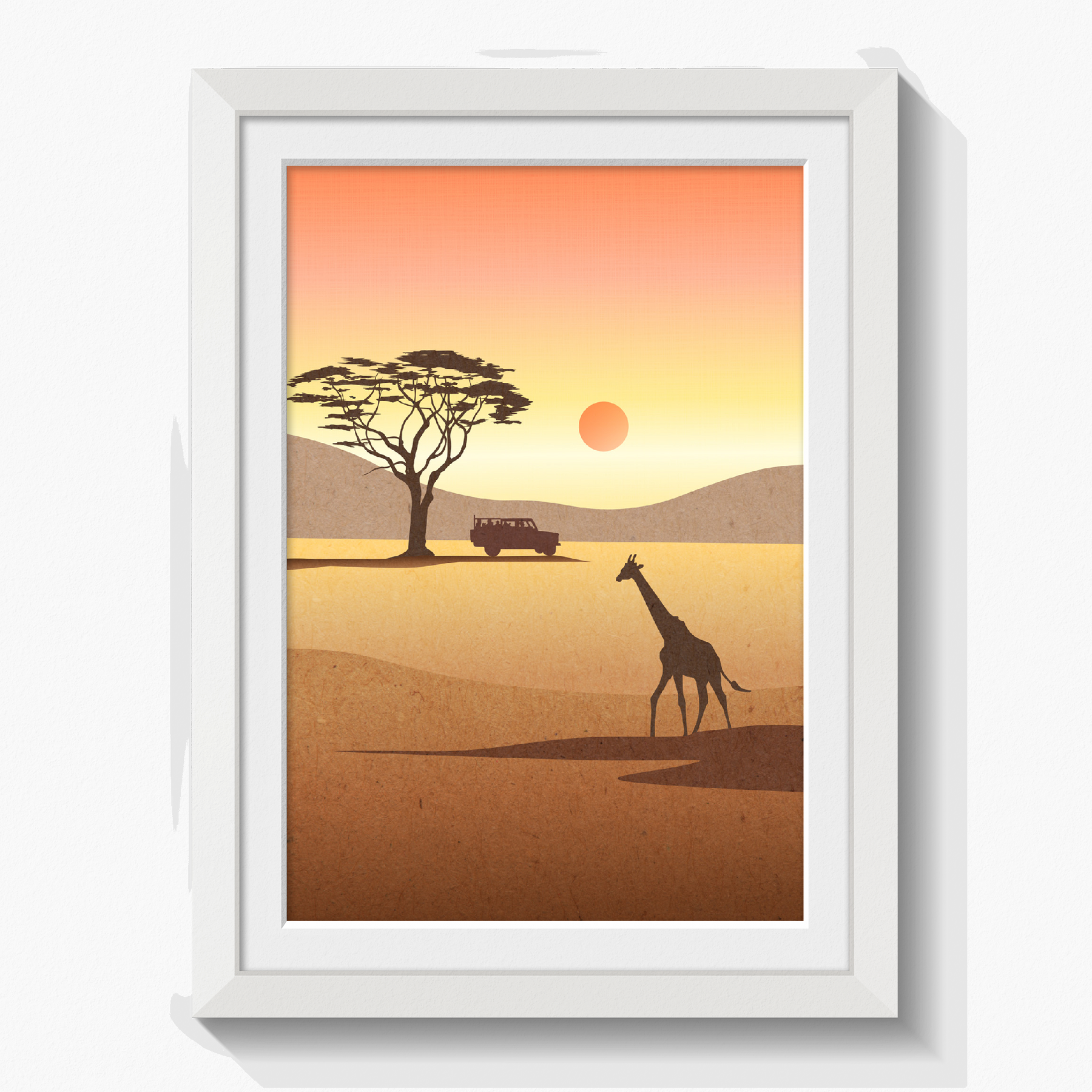 The perfect print for your safari themed nursery. Based on our Kenya travel poster, it features a beautiful sunset view across the Kenyan savanna where a giraffe and a nearby safari jeep can be seen.