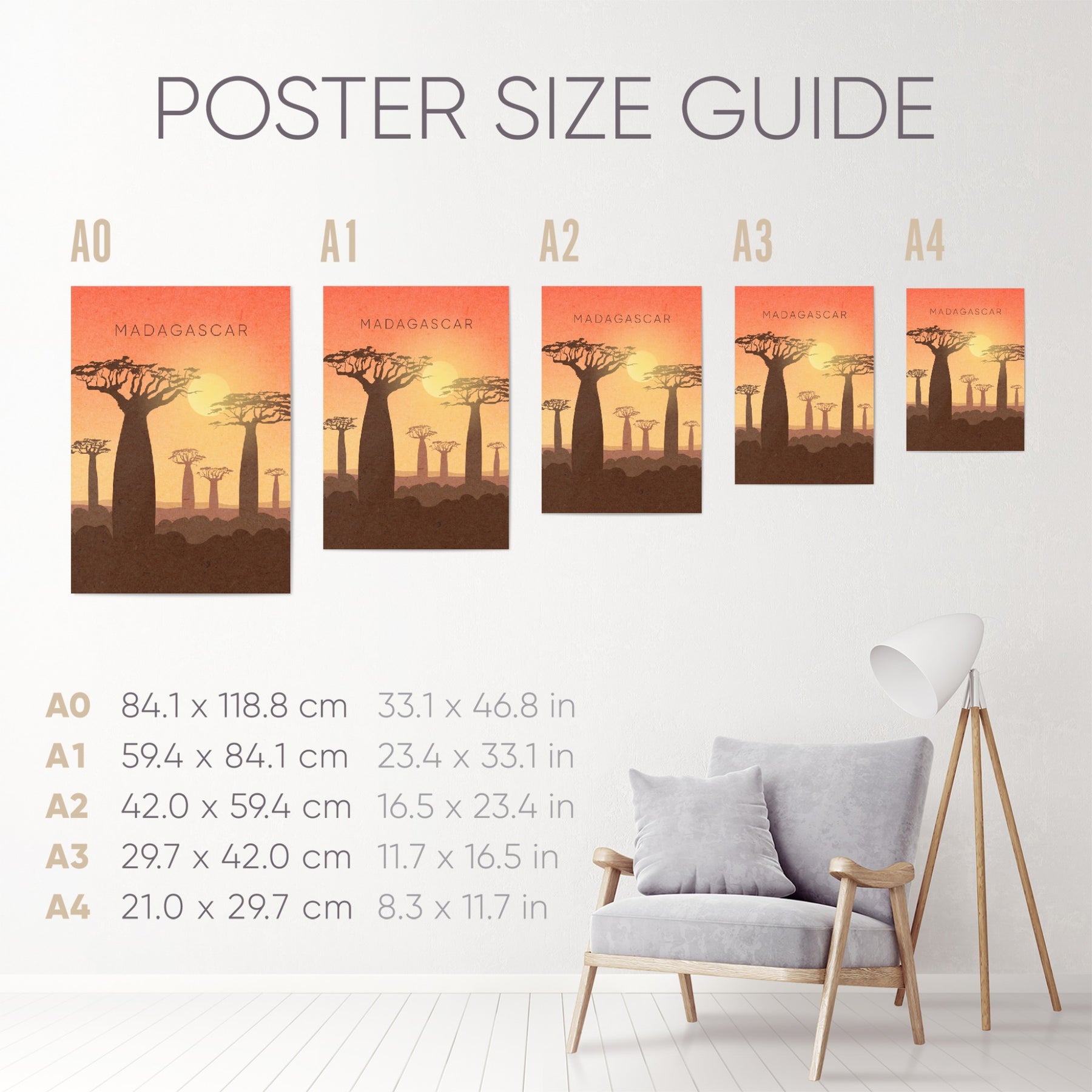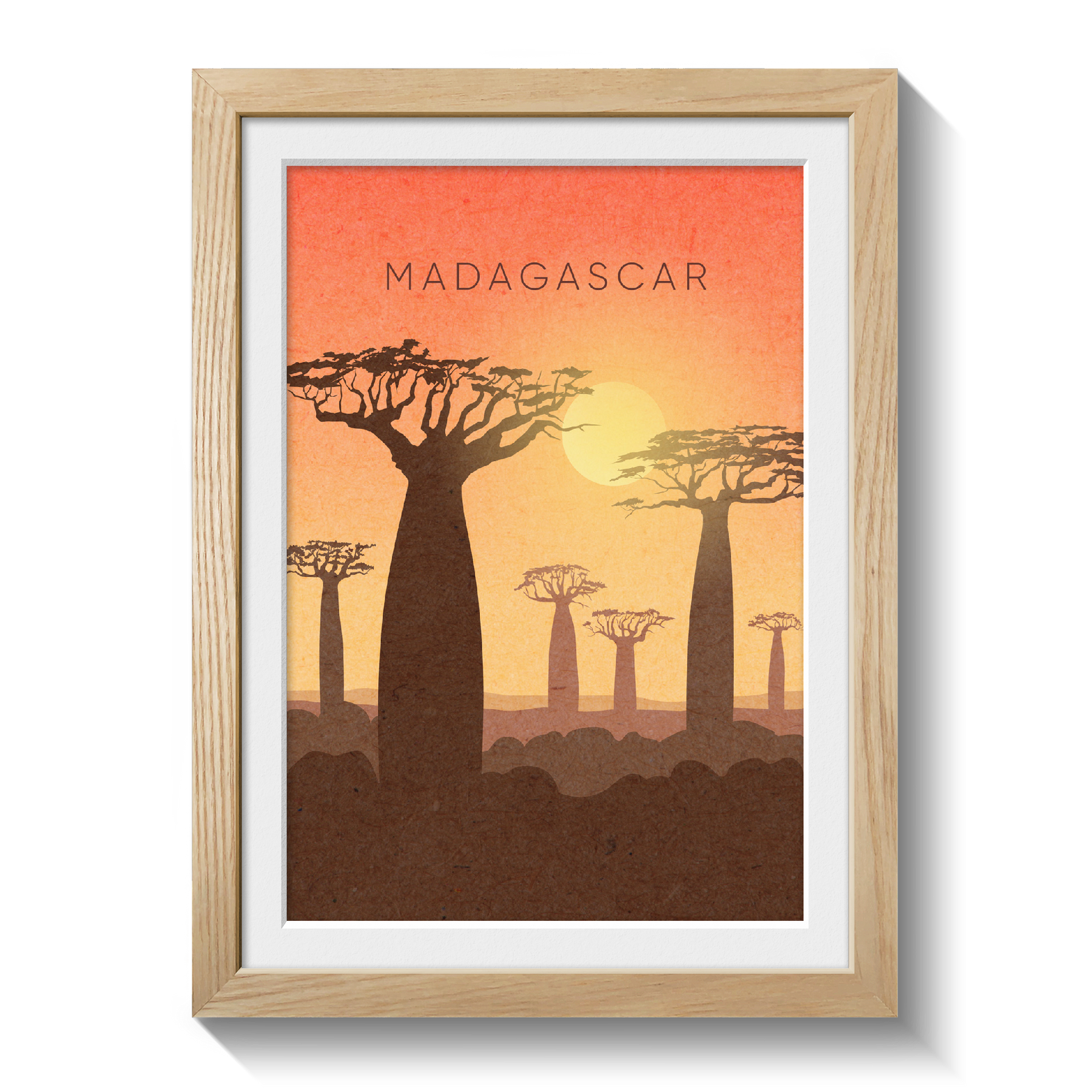 Original minimalist travel poster for Madagascar featuring the iconic giant baobab trees. Known for their unique shapes and towering presence, these trees are a symbol of Madagascar's rich biodiversity. Perfect for nature enthusiasts and travel lovers.