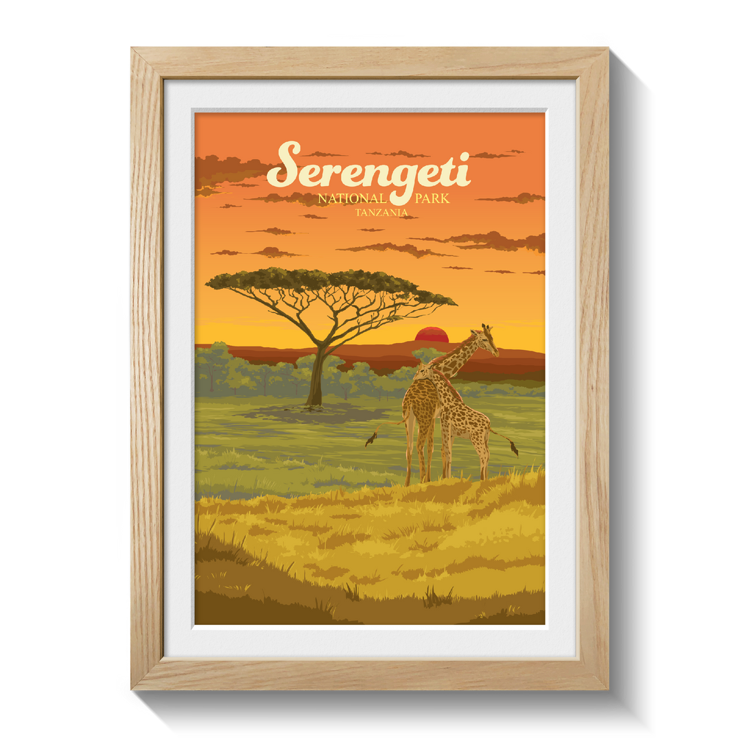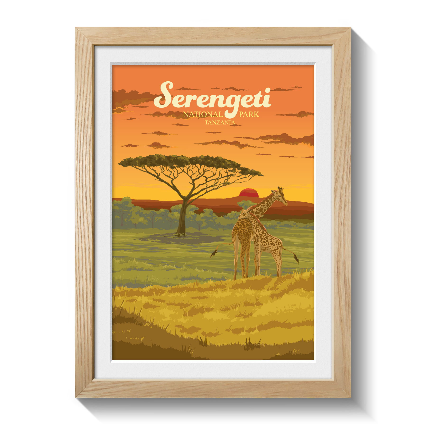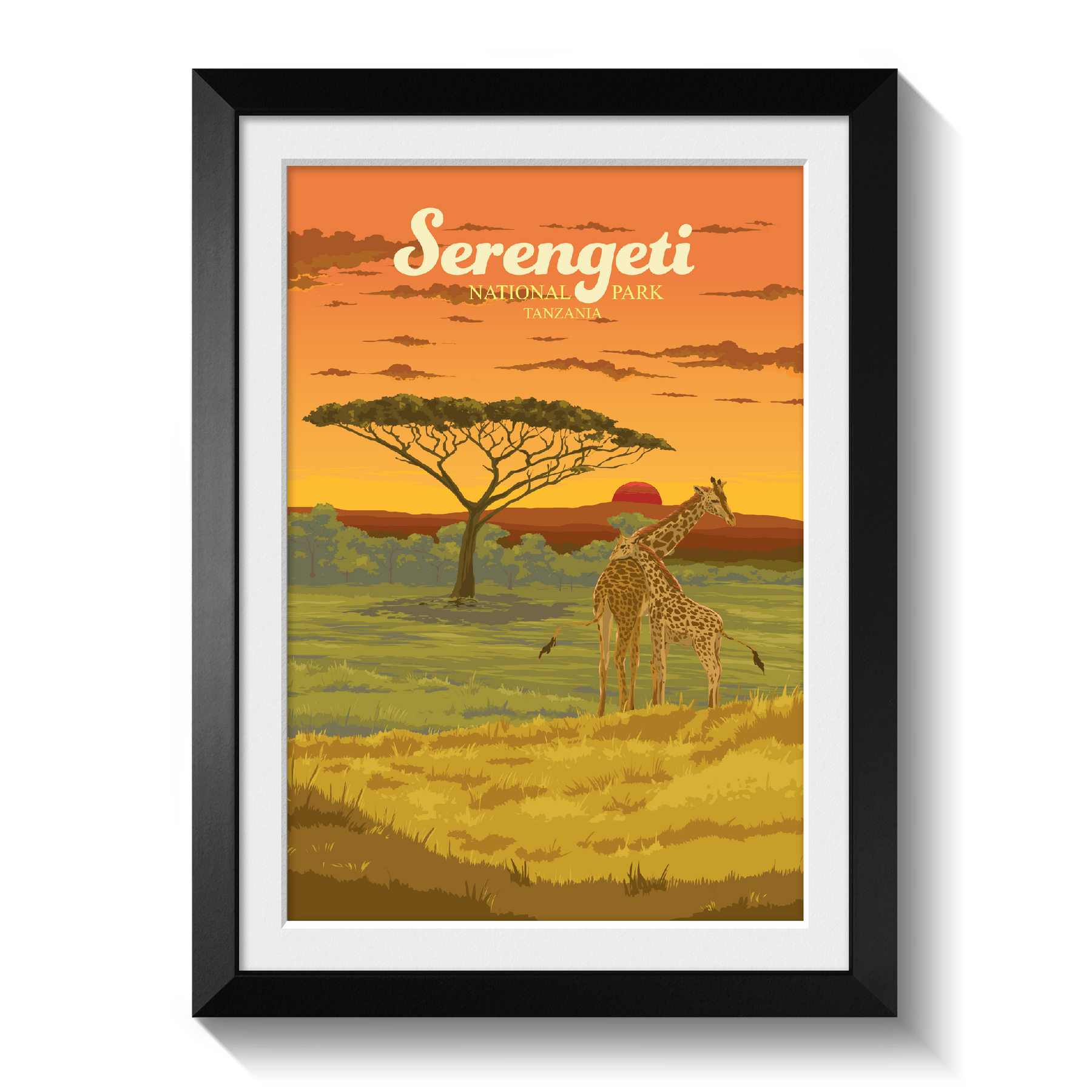 An original travel poster featuring the world famous Serengeti National Park in Tanzania, Africa.