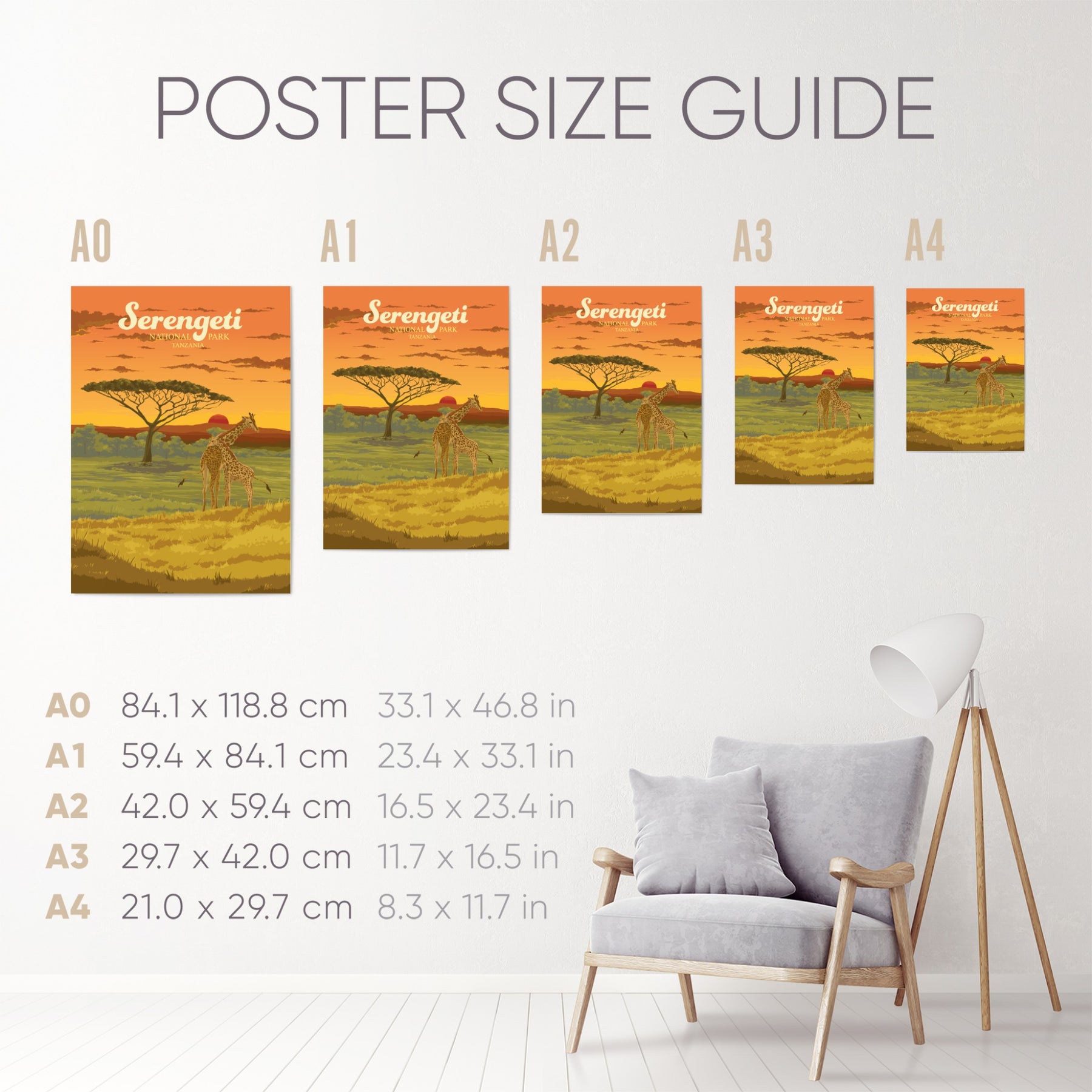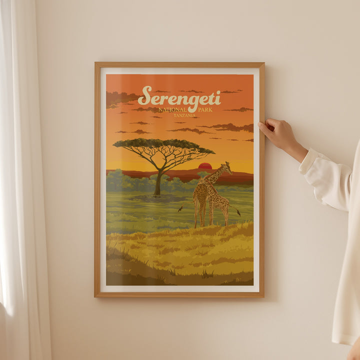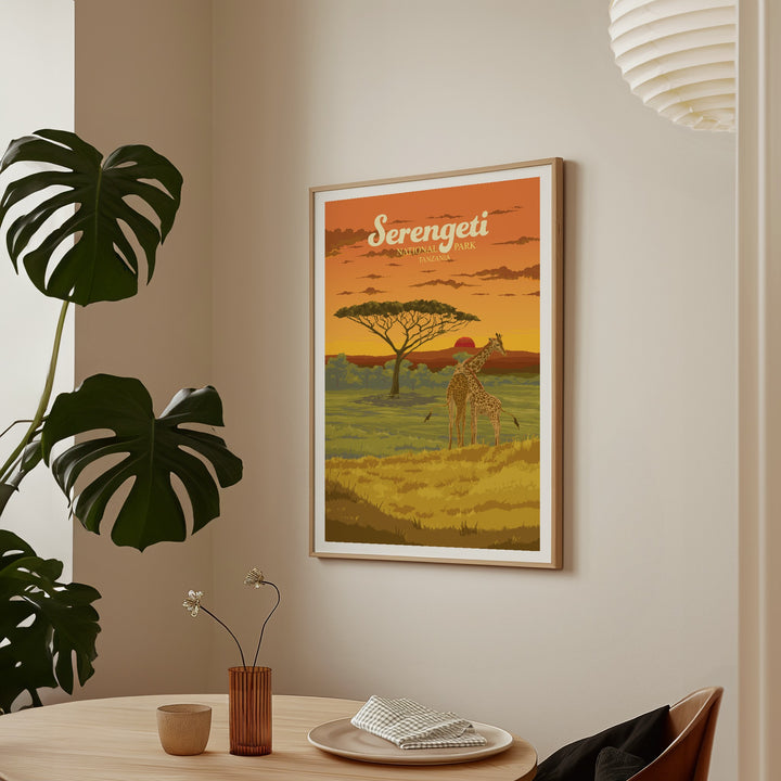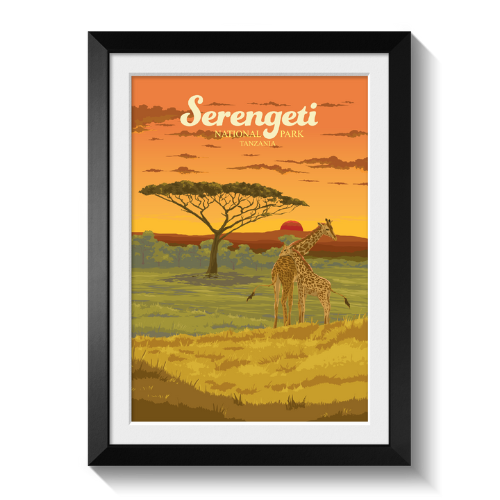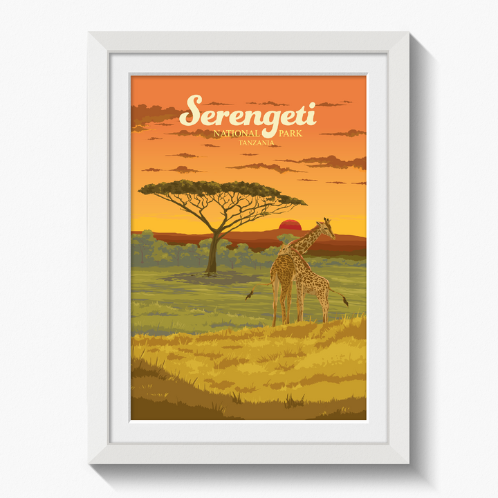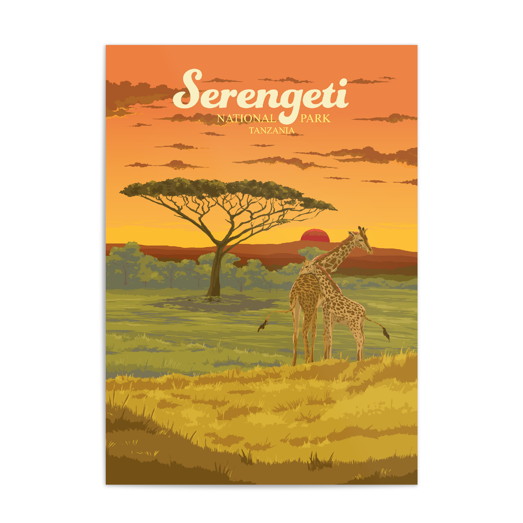 An original travel poster featuring the world famous Serengeti National Park in Tanzania, Africa.