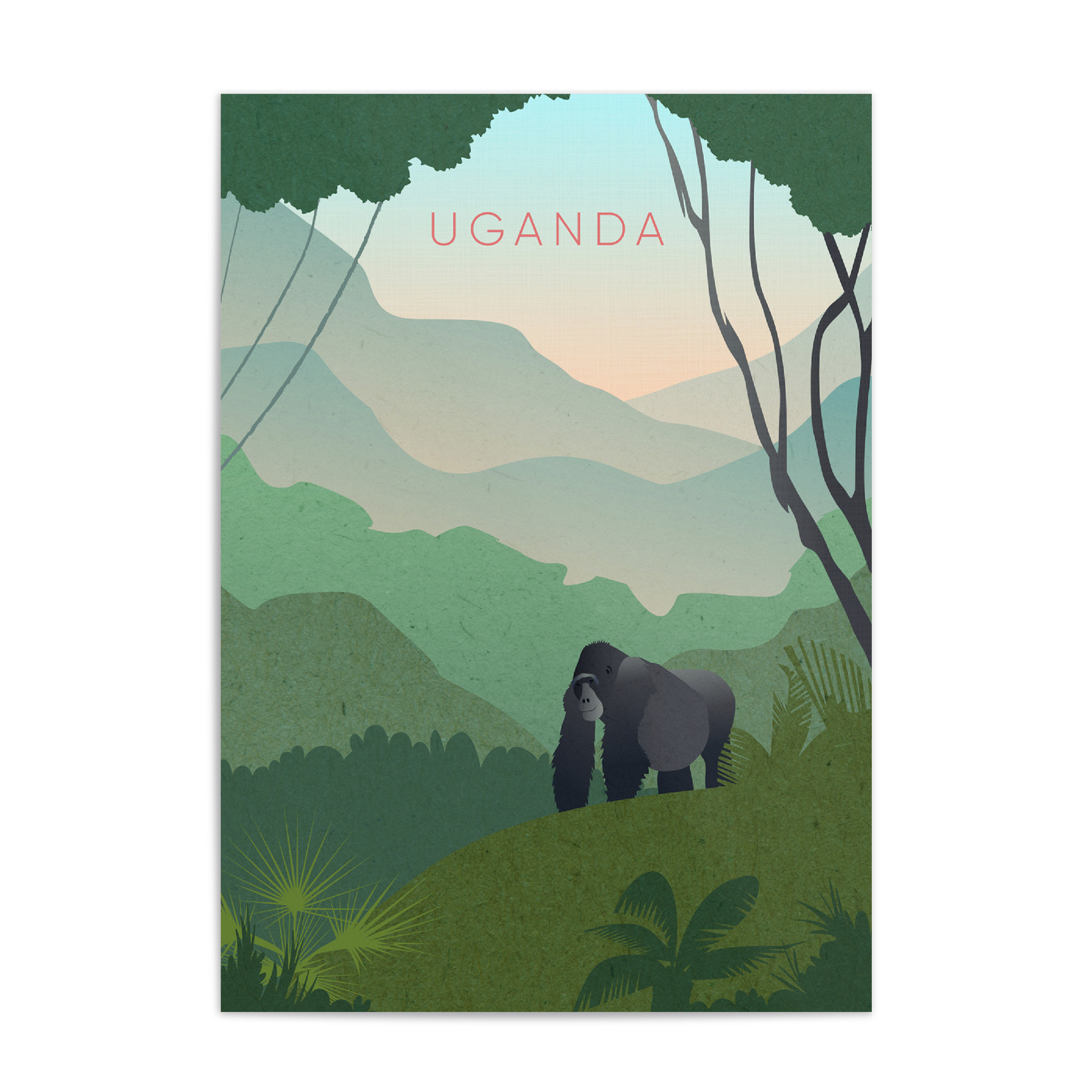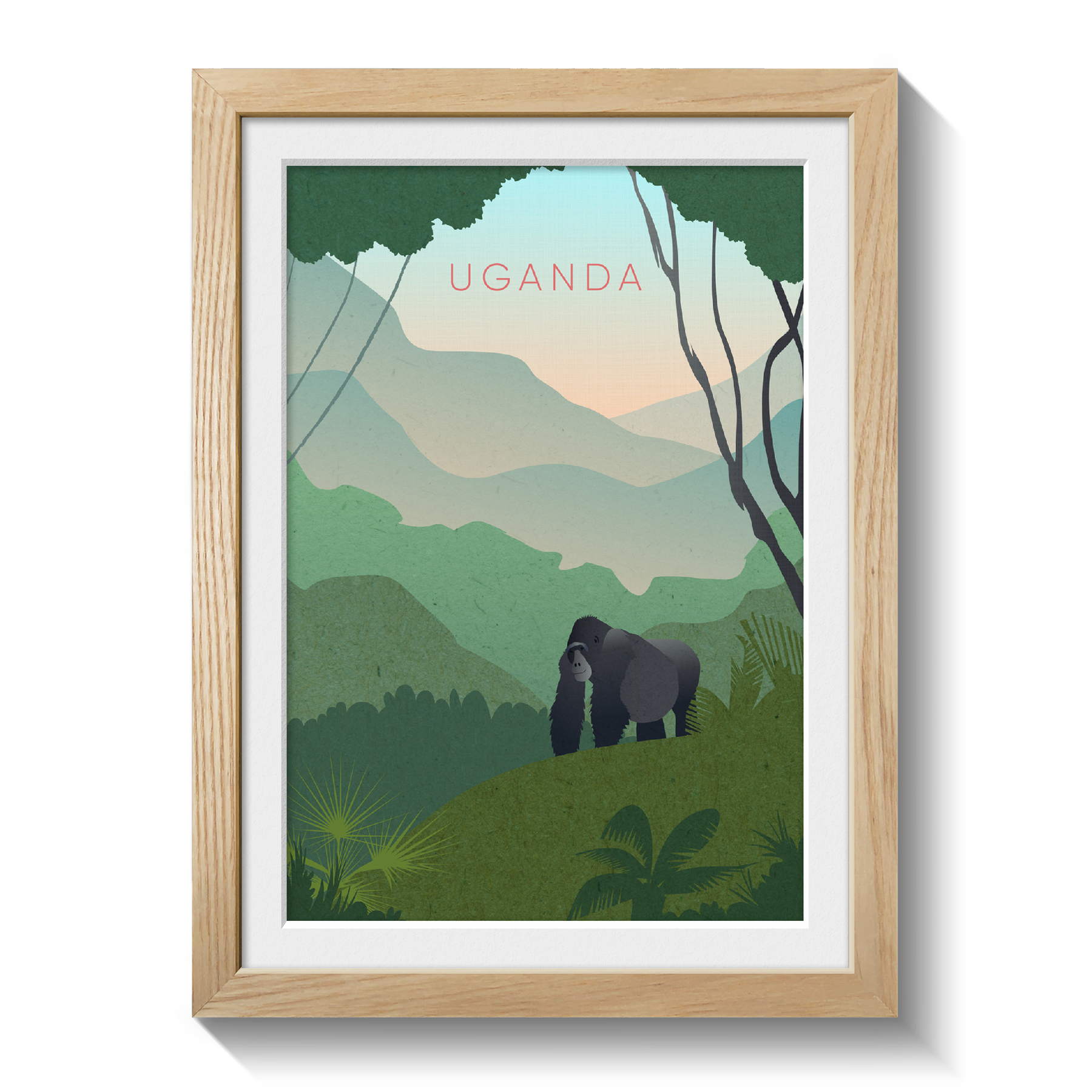 Original Minimalist travel poster for Uganda featuring a silverback mountain gorilla in the Bwindi Impenetrable Forest. Known for its breathtaking landscapes and unique habitats, Uganda offers unforgettable experiences like gorilla trekking and wildlife safaris. Perfect for nature lovers and adventurers, this destination promises remarkable encounters in the heart of Africa.