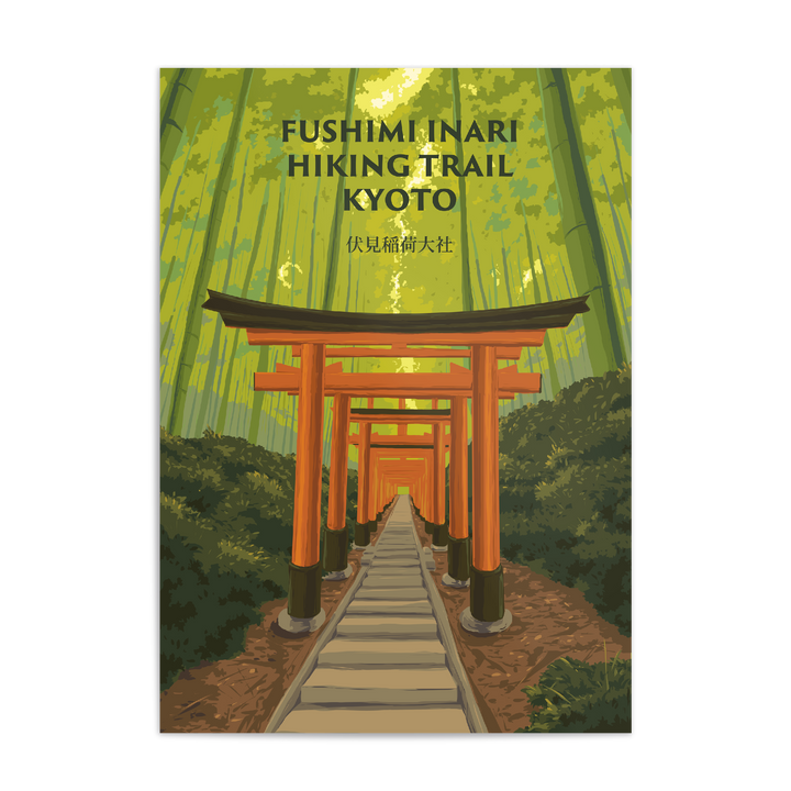 An original travel poster featuring the iconic hiking trail to the Fushimi Inari Shrine at the summit of Mount Inari in Kyoto Japan. The hike winds through bamboo forests and passes through thousands of vermilion torii gates.