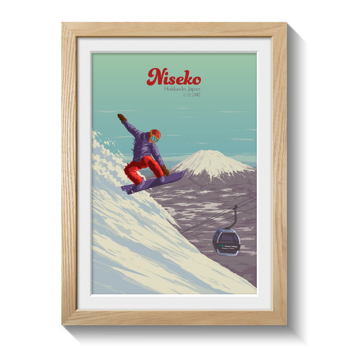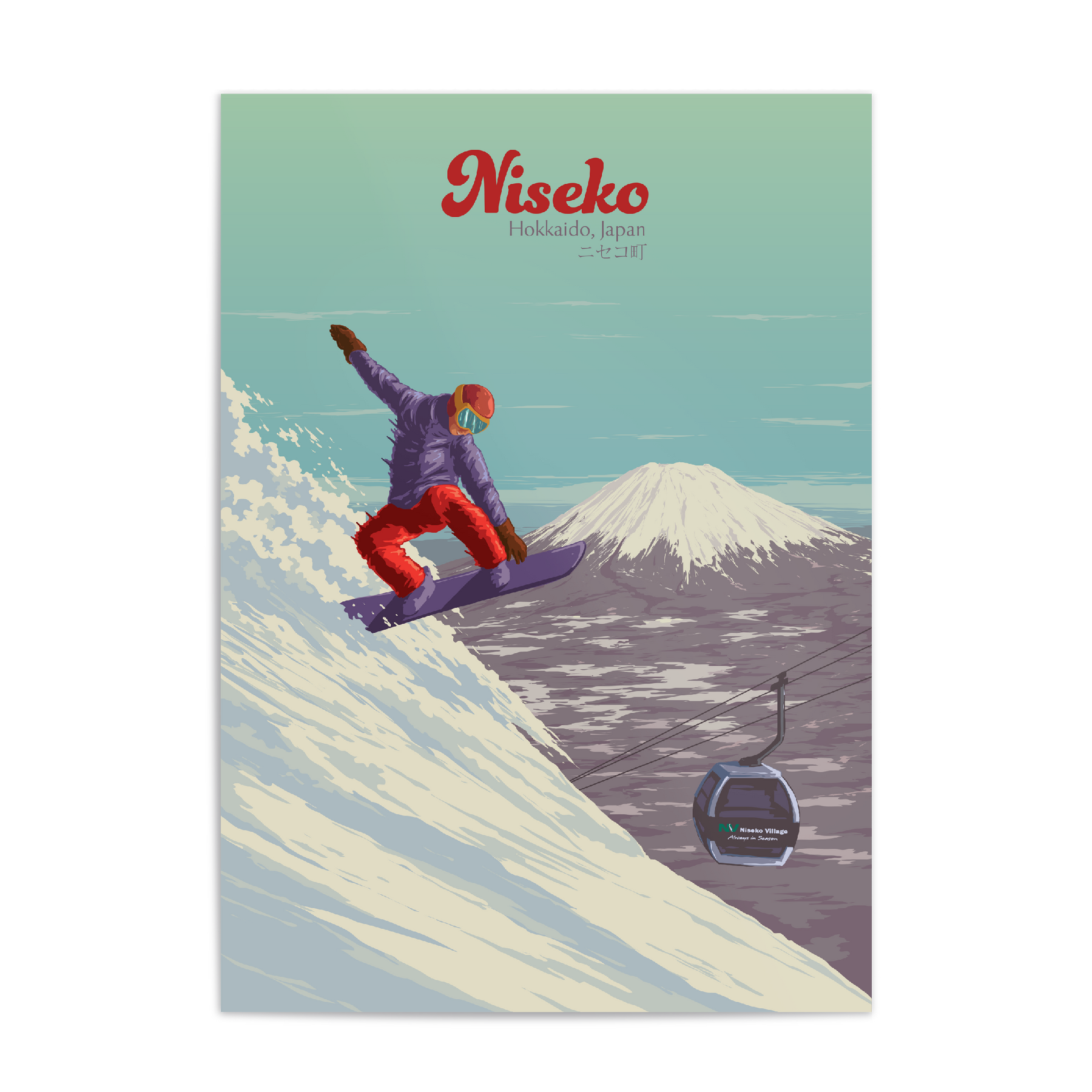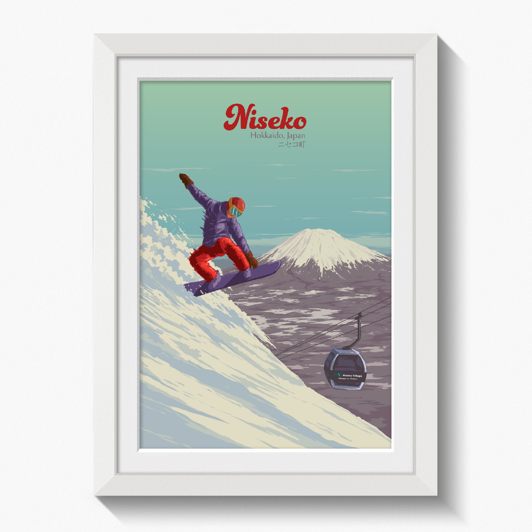 This is an original travel poster featuring the ski resort of Niseko on the Japanese island of Hokkaido. Niseko is famous for hot springs and pristine powder skiing in the shadow of Mount Yotei, an active volcano with a startling resemblance to Mount Fuji.