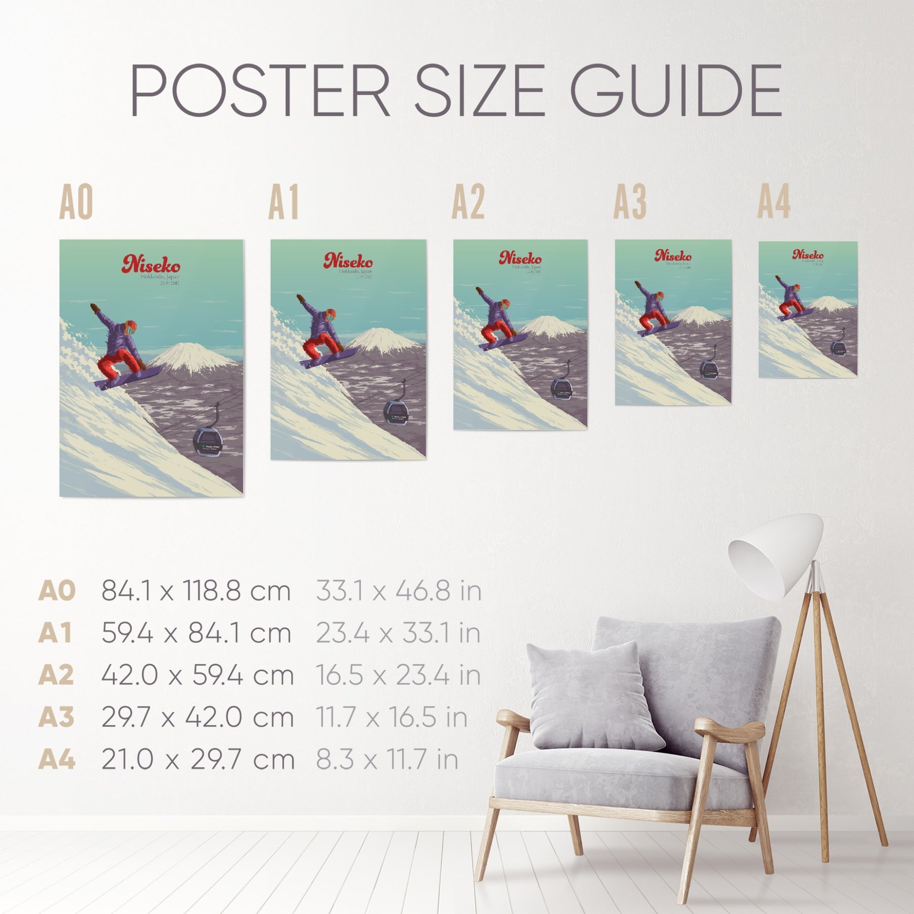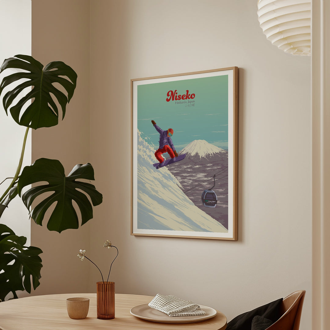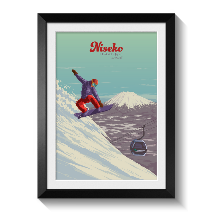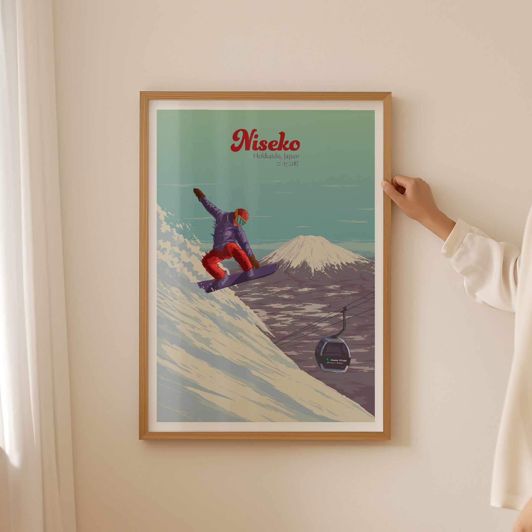 This is an original travel poster featuring the ski resort of Niseko on the Japanese island of Hokkaido. Niseko is famous for hot springs and pristine powder skiing in the shadow of Mount Yotei, an active volcano with a startling resemblance to Mount Fuji.