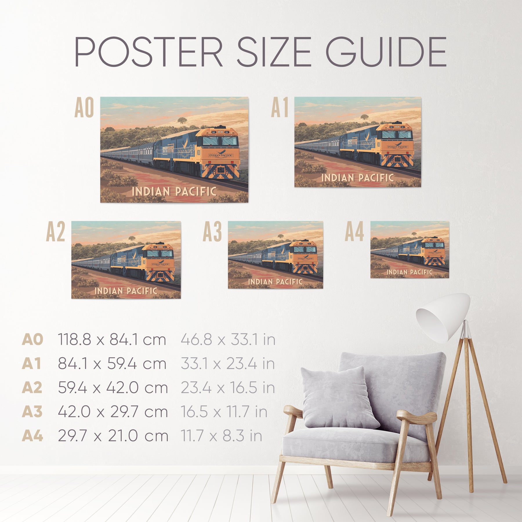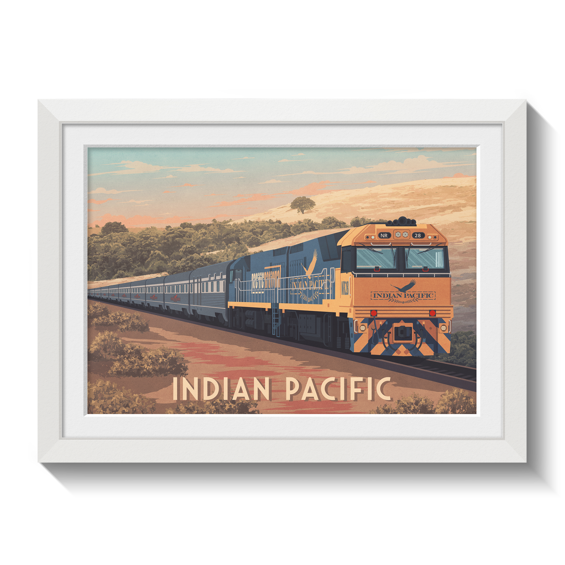 This Indian Pacific Railway travel poster captures the epic beauty of Australia’s famous transcontinental train journey from Sydney to Perth. Perfect for rail enthusiasts and adventure lovers, it highlights vast outback landscapes and the iconic blue and silver train. A stylish decor piece celebrating the romance and scale of the Indian Pacific.