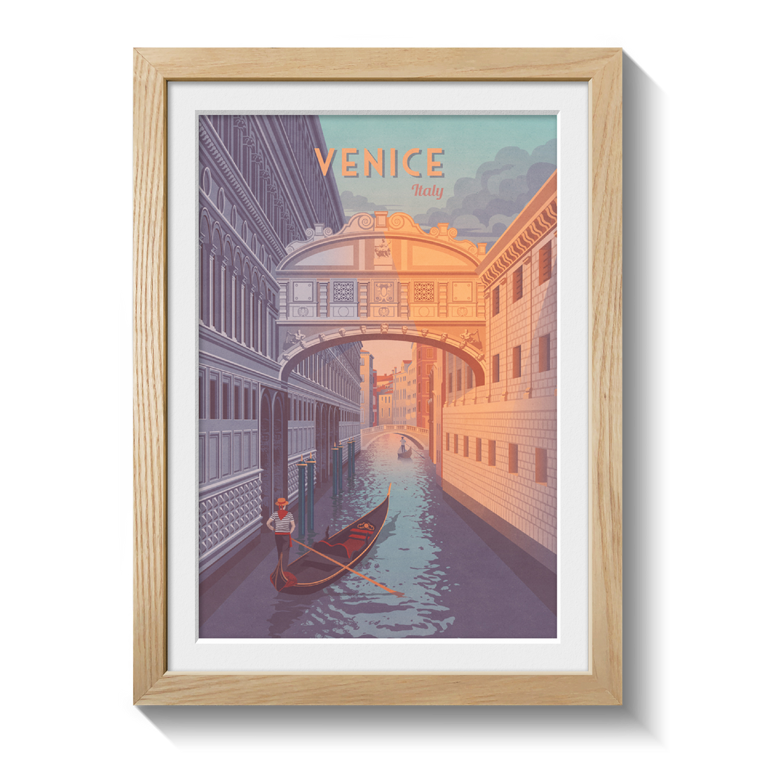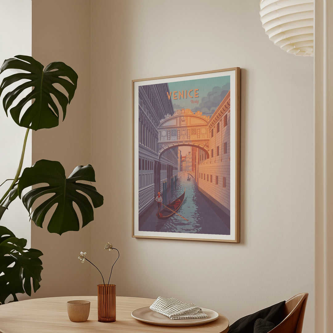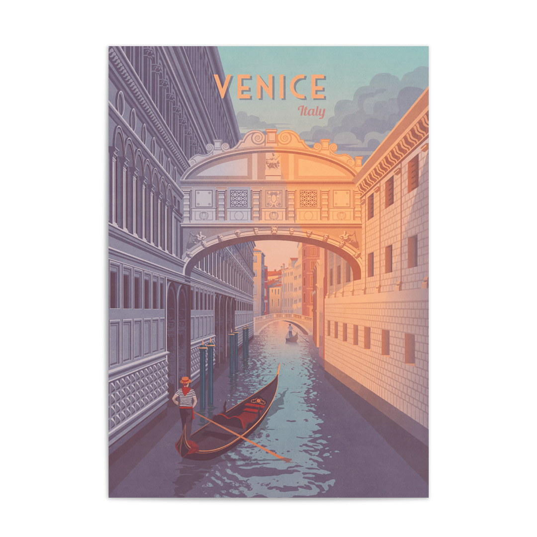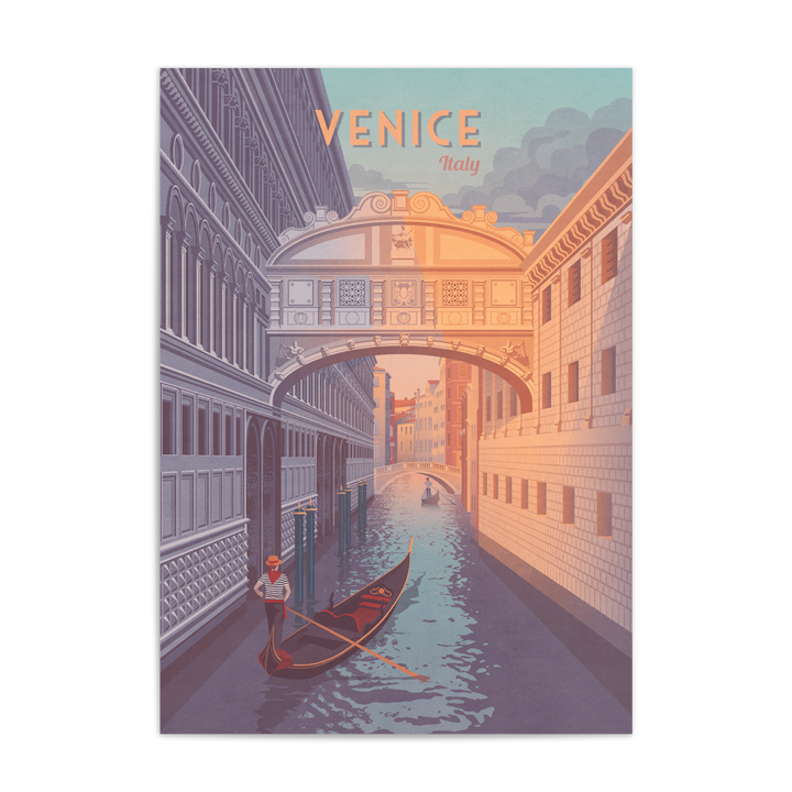This travel poster features the city of Venice, Italy. Venice was built on 118 islands which are linked by bridges and the famous Venice canal network. In the poster you can see the ornate Bridge of Sighs and one of Venice's iconic gondolas.