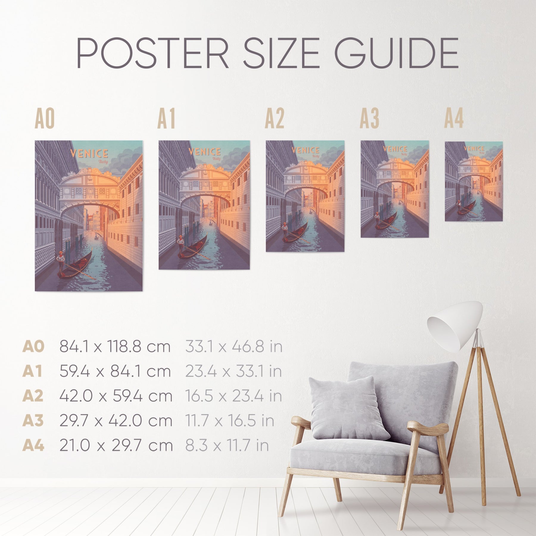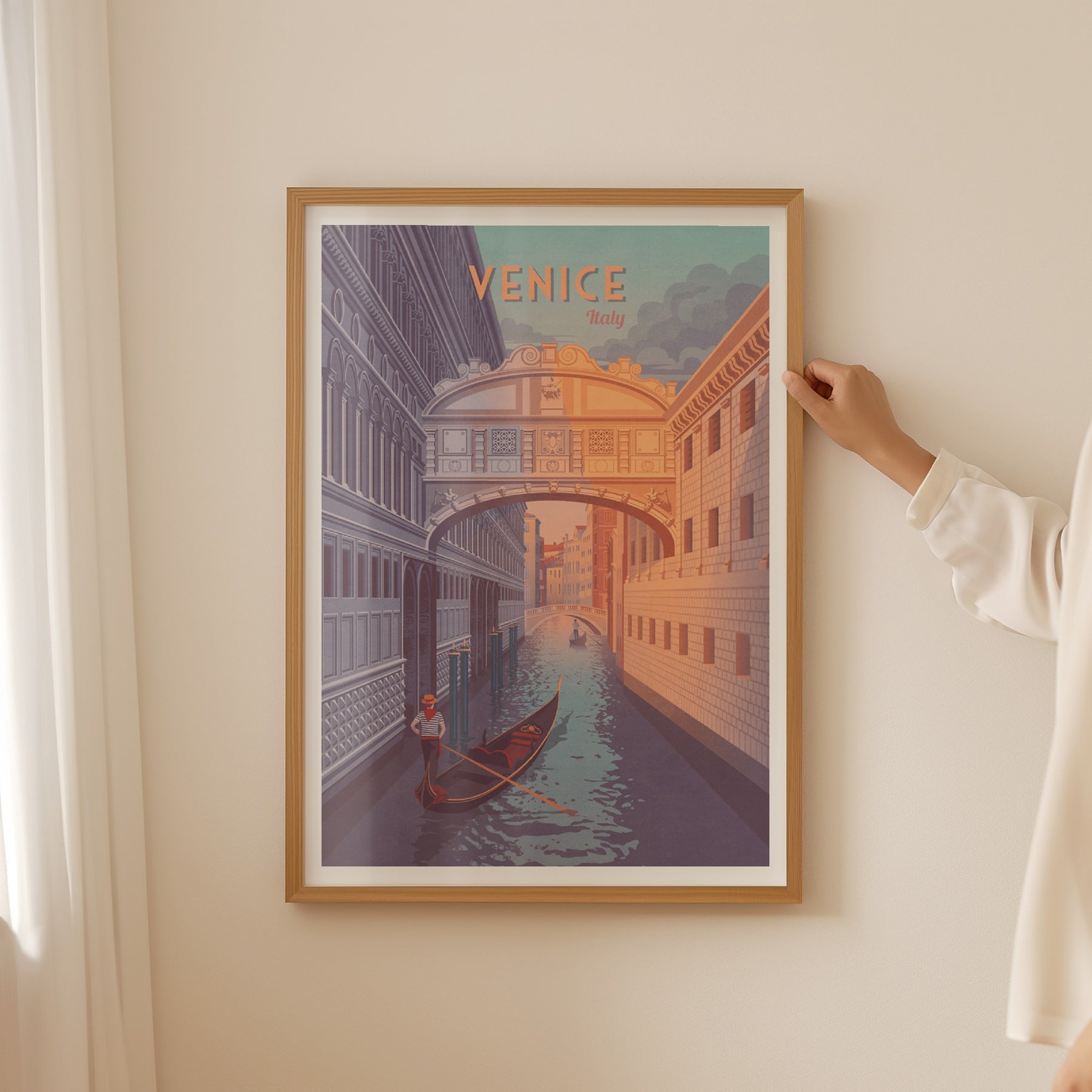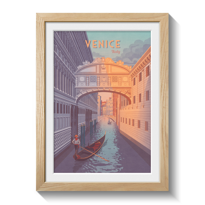 This travel poster features the city of Venice, Italy. Venice was built on 118 islands which are linked by bridges and the famous Venice canal network. In the poster you can see the ornate Bridge of Sighs and one of Venice's iconic gondolas.