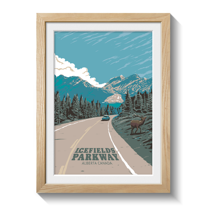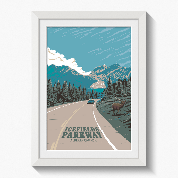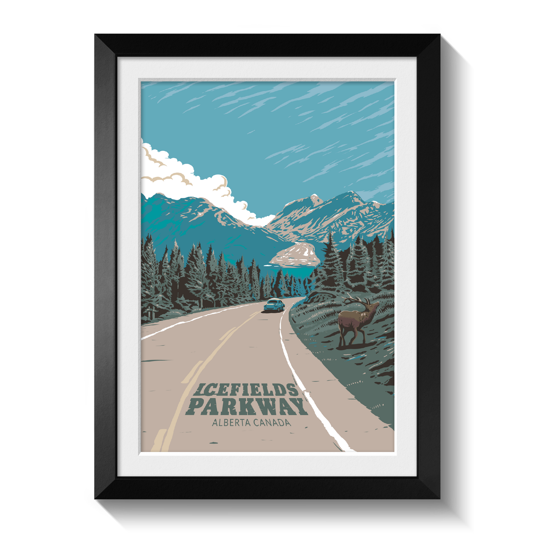 Original travel poster of the Icefields Parkway in Jasper National Park in the heart of the Rocky Mountains.