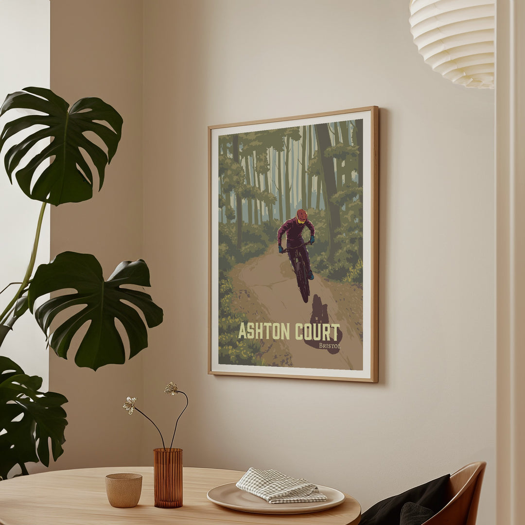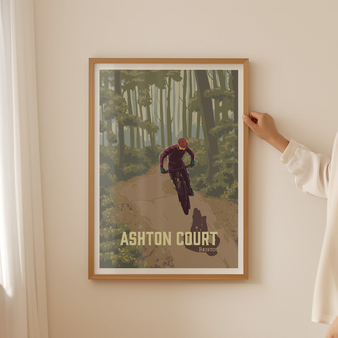 An original travel poster featuring Ashton Court in Bristol, a popular mountain biking area that boasts an awesome flow trail called the Nova Trail, which winds it way around the Ashton Court Estate.